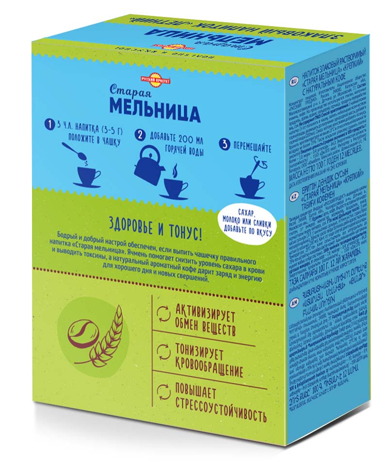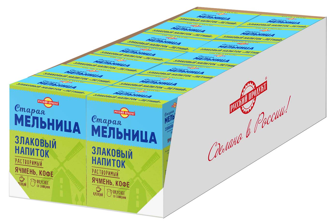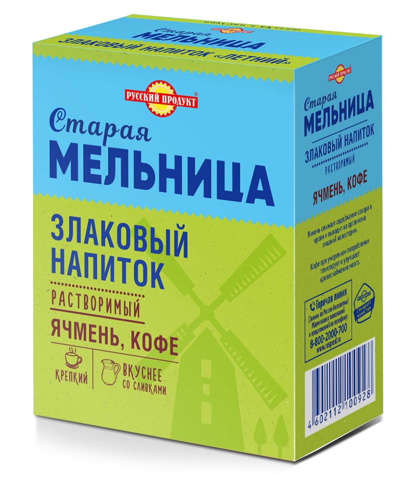 | Старая Мельница | Напитки | Злаковые напитки (пачка) | Напиток злаковый Крепкий с натуральным кофе (Летний) 100 г/1... | 2126034 | Коробка |  4602112100928 | 100 | 0,00056 | 92 | 51 | 119 |  |  | 20 | Злаковый напиток "СТАРАЯ МЕЛЬНИЦА" содержит ячмень и настоящ... | 5 чайные ложки напитка (3-5 г) положить в чашку, залить небо... | Ячмень, кофе. | 3D Лицевая Оборотная Боковая Л Боковая П Групповая уп | 370.0 | 7 | 0.4 | 84 | 12 |  | Хранить при температуре не выше 25°С и относительной влажнос... | 14 | шоу-бокс |  4602112504375 | 1,4 | 1,8 | 0,00909 | 193 | 380 | 124 | Слой | 168 | 12 | 2016 | 144 | 12 | 12 рядов по 12 шоу-боксов | 1650 | АО Русский Продукт | 249080, Россия, Калужская обл, Малоярославецкий р-н, Детчино... | ЕАЭС N RU Д-RU.РА02.В.98943/24 | 22.03.2024 - 20.03.2027 | соответствует требованиям ТУ 10.83.12-010-44418433-2019 | Скачать | 2101309900 | 10.83.12.120 |