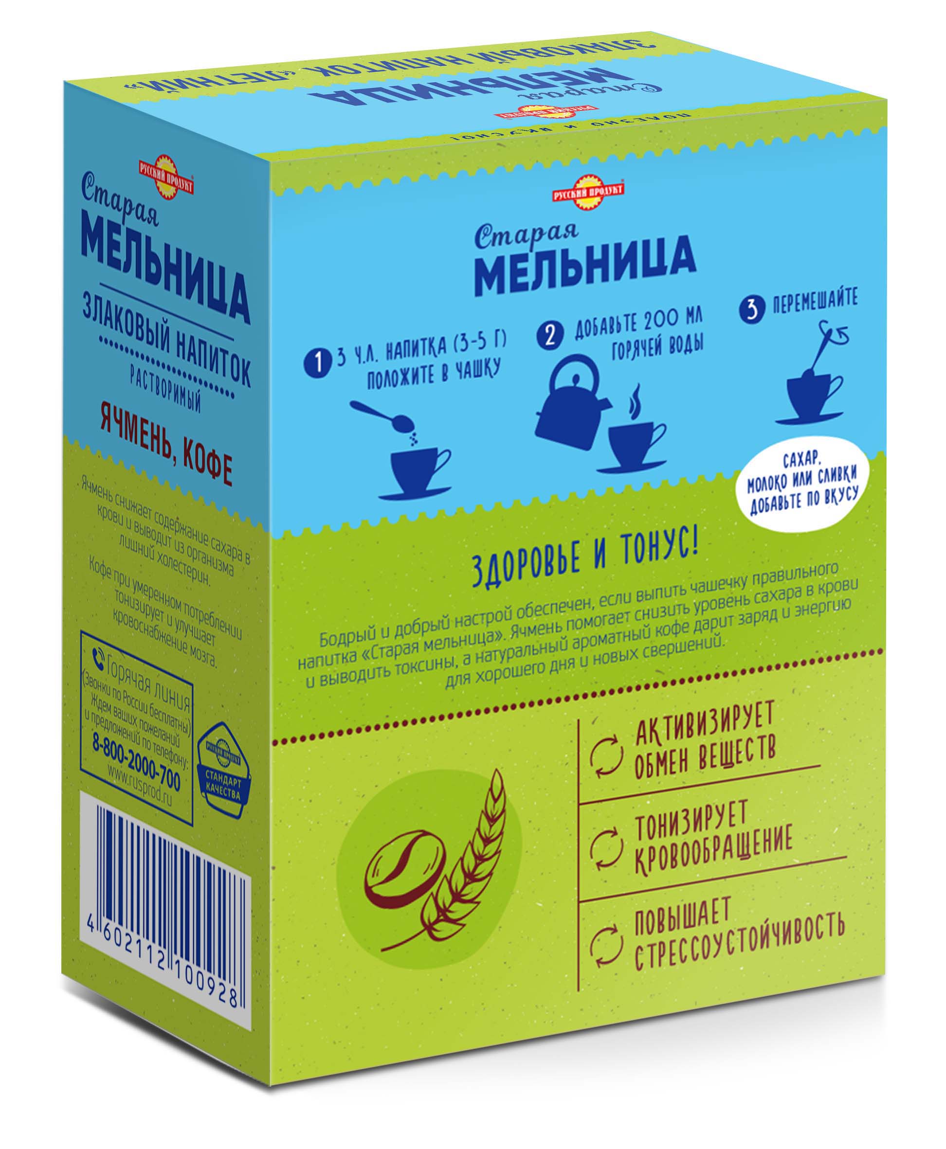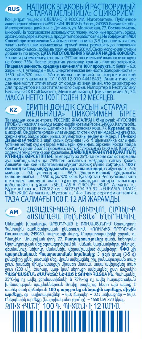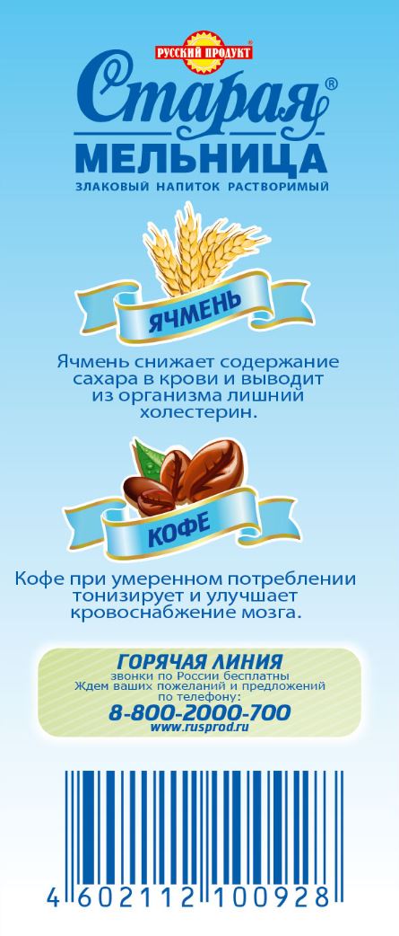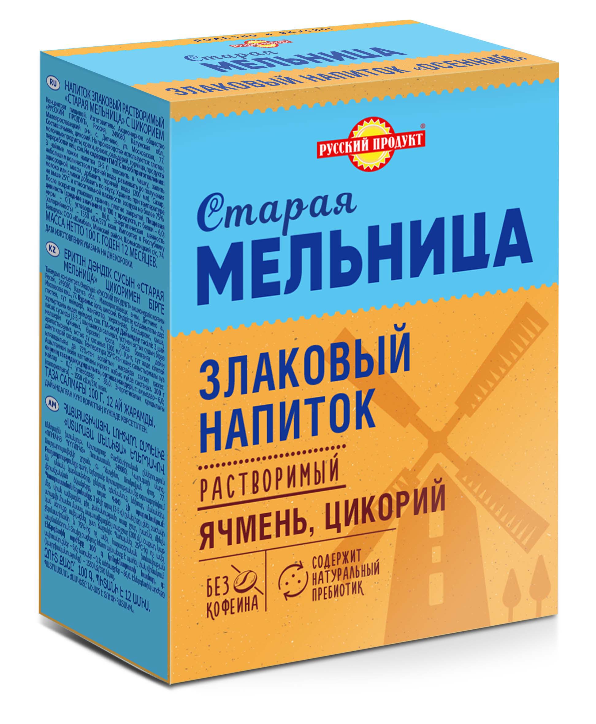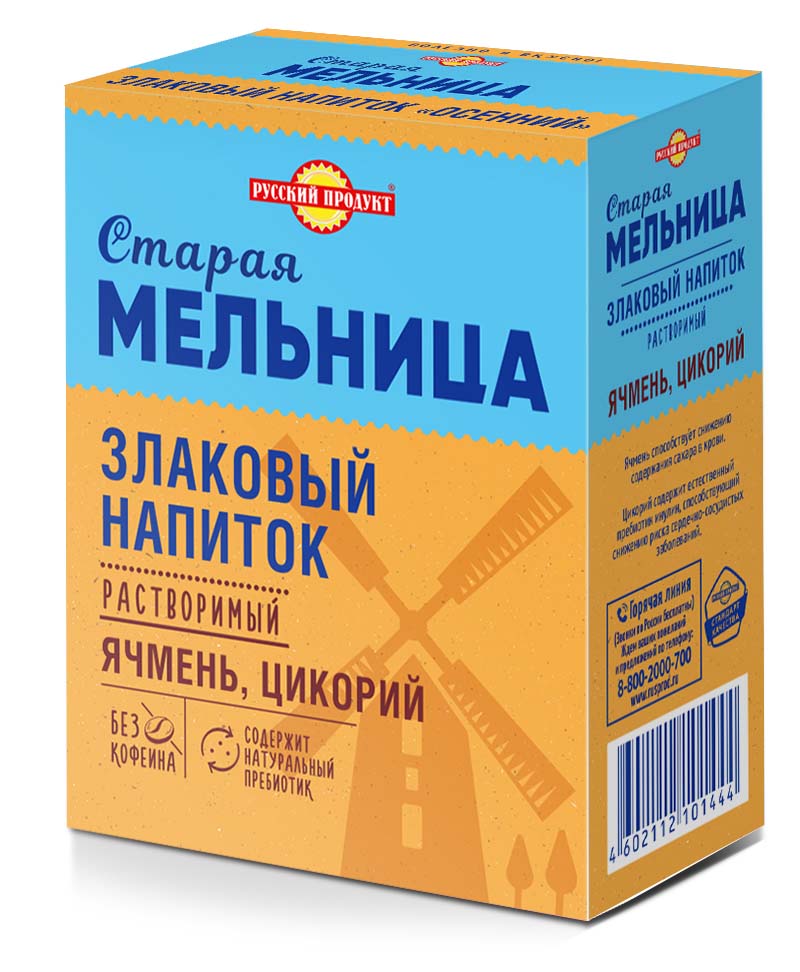 | Старая Мельница | Напитки | Злаковые напитки (пачка) | Напиток злаковый С цикорием (Осенний) 100 г/14 шт в ш/б РП | 2126035 | Коробка |  4602112101444 | 100 | 0,00056 | 92 | 51 | 119 |  |  | 20 | Злаковый напиток "СТАРАЯ МЕЛЬНИЦА" содержит цикорий и ячмень... | 4 чайные ложки напитка (3-5 г) положить в чашку, залить небо... | Ячмень, цикорий. | 3D Лицевая Оборотная Боковая Л Боковая П Групповая уп | 370.0 | 6 | 0.1 | 86 | 12 |  | Хранить при температуре не выше 25°С и относительной влажнос... | 14 | шоу-бокс |  4602112504382 | 1,4 | 1,8 | 0,00909 | 193 | 380 | 124 | Слой | 168 | 12 | 2016 | 144 | 12 | 12 рядов по 12 шоу-боксов | 1650 | АО Русский Продукт | 249080, Россия, Калужская обл, Малоярославецкий р-н, Детчино... | ЕАЭС N RU Д-RU.РА02.В.98943/24 | 22.03.2024 - 20.03.2027 | соответствует требованиям ТУ 10.83.12-010-44418433-2019 | Скачать | 2101309900 | 10.83.12.120 |