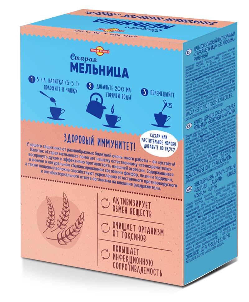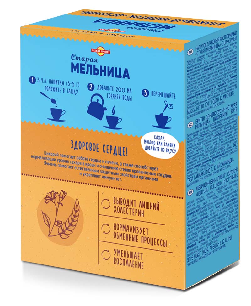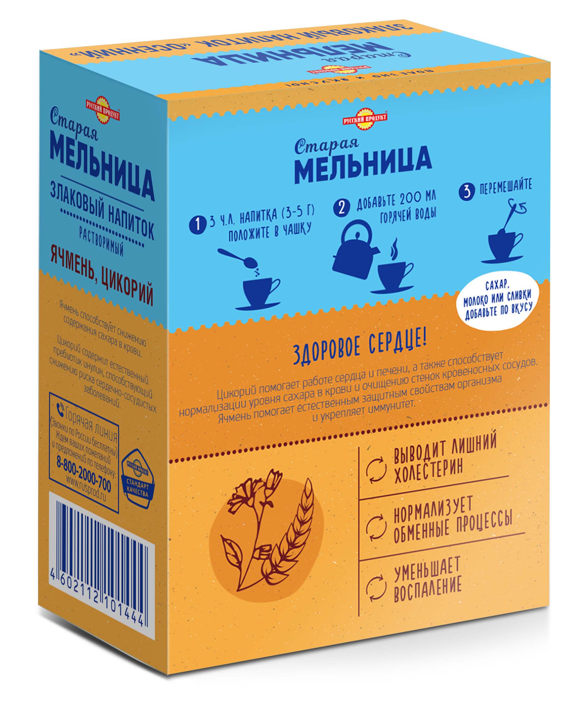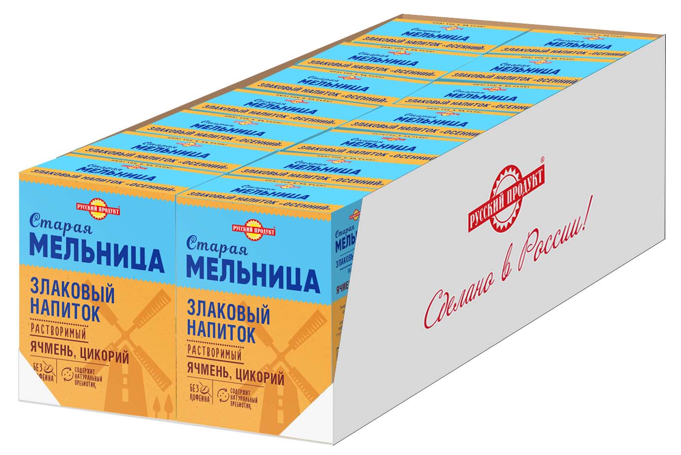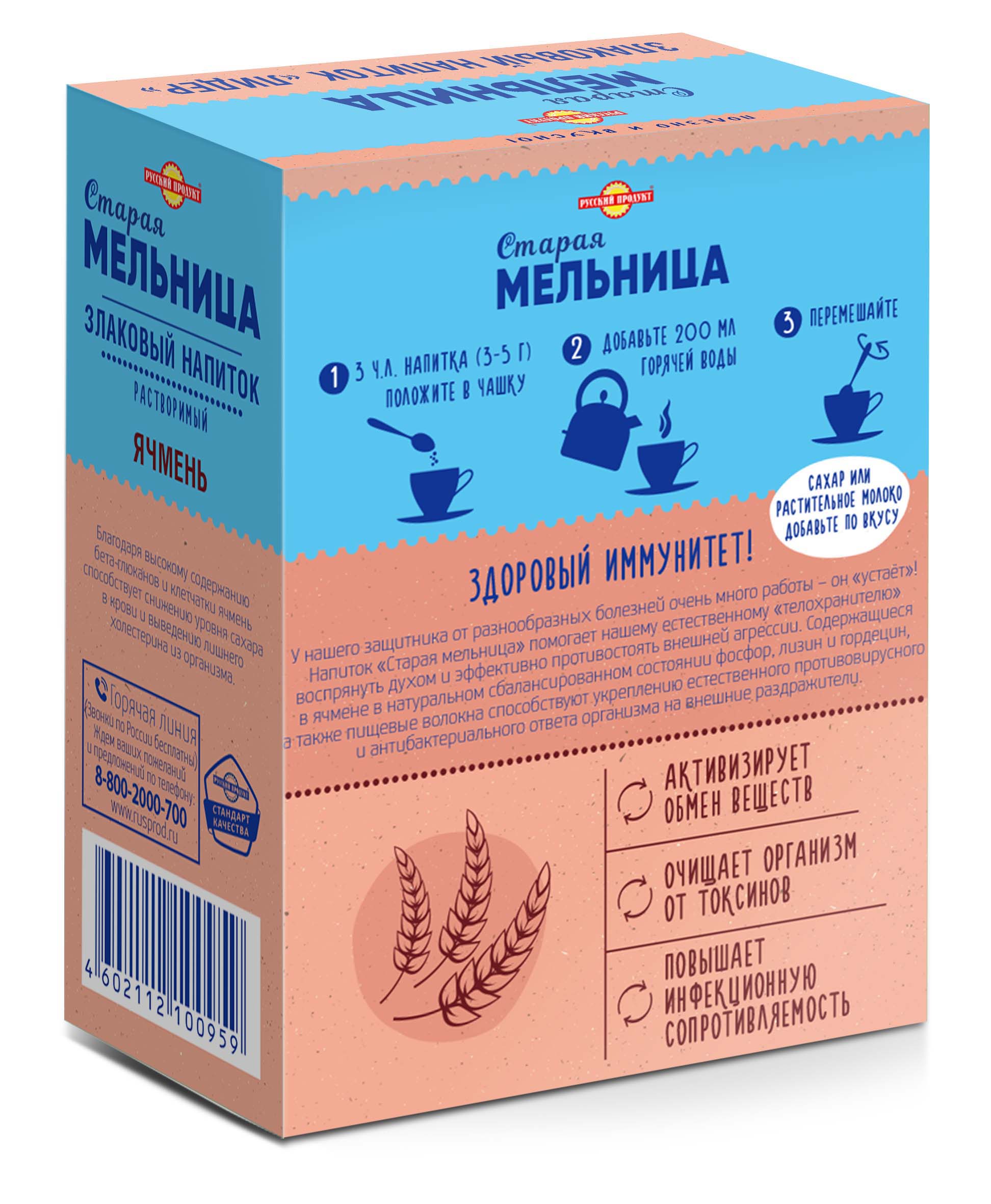 | Старая Мельница | Напитки | Злаковые напитки (пачка) | Напиток злаковый С цикорием (Осенний) 100 г/14 шт в ш/б РП | 2126035 | Коробка |  4602112101444 | 100 | 0,00056 | 92 | 51 | 119 |  |  | 20 | Злаковый напиток "СТАРАЯ МЕЛЬНИЦА" содержит цикорий и ячмень... | 4 чайные ложки напитка (3-5 г) положить в чашку, залить небо... | Ячмень, цикорий. | 3D Лицевая Оборотная Боковая Л Боковая П Групповая уп | 370.0 | 6 | 0.1 | 86 | 12 |  | Хранить при температуре не выше 25°С и относительной влажнос... | 14 | шоу-бокс |  4602112504382 | 1,4 | 1,8 | 0,00909 | 193 | 380 | 124 | Слой | 168 | 12 | 2016 | 144 | 12 | 12 рядов по 12 шоу-боксов | 1650 | АО Русский Продукт | 249080, Россия, Калужская обл, Малоярославецкий р-н, Детчино... | ЕАЭС N RU Д-RU.РА02.В.98943/24 | 22.03.2024 - 20.03.2027 | соответствует требованиям ТУ 10.83.12-010-44418433-2019 | Скачать | 2101309900 | 10.83.12.120 |