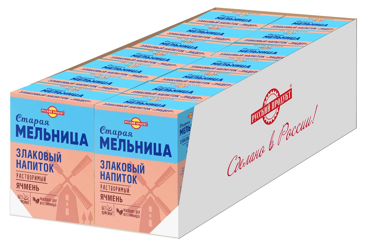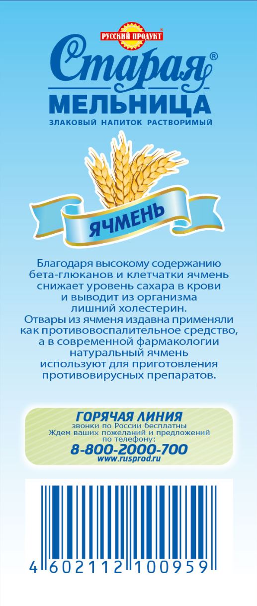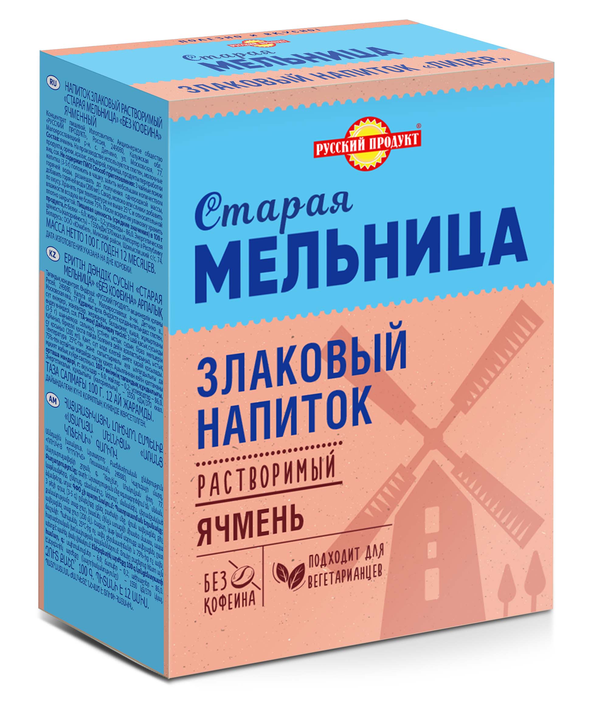 | Старая Мельница | Напитки | Злаковые напитки (пачка) | Напиток злаковый Без кофеина ячменный (Лидер) 100 г/14 шт в ... | 2126036 | Коробка |  4602112100959 | 100 | 0,00056 | 92 | 51 | 119 | 01.04.2023 |  | 20 | Злаковый напиток "СТАРАЯ МЕЛЬНИЦА" содержит 100% ячмень. Нап... | 3 чайные ложки напитка (3-5 г) положить в чашку, залить небо... | Ячмень. | 3D Лицевая Оборотная Боковая Л Боковая П Групповая уп | 370.0 | 6 | 0.2 | 86 | 12 |  | Хранить при температуре не выше 25°С и относительной влажнос... | 14 | шоу-бокс |  4602112504368 | 1,4 | 1,8 | 0,00909 | 193 | 380 | 124 | Слой | 168 | 12 | 2016 | 144 | 12 | 12 рядов по 12 шоу-боксов | 1650 | АО Русский Продукт | 249080, Россия, Калужская обл, Малоярославецкий р-н, Детчино... | ЕАЭС N RU Д-RU.РА02.В.98943/24 | 22.03.2024 - 20.03.2027 | соответствует требованиям ТУ 10.83.12-010-44418433-2019 | Скачать | 2101309900 | 10.83.12.120 |