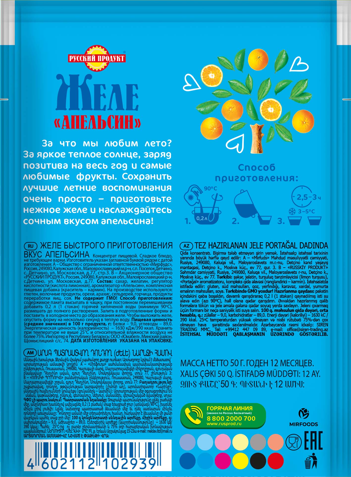 | Русский Продукт | Бакалея | Желе. | Желе быстрого пригот. "Вкус апельсина" 50 г/35 уп в ш/б (Мир... | 2726943 | Пакет |  4602112102939 | 50 | 0,00019 | 120 | 10 | 160 |  |  | 20 | Для приготовления желе "РУССКИЙ ПРОДУКТ" со вкусом апельсина... | Содержимое пакета высыпать в чашку, при постоянном перемешив... | сахар, желатин, регулятор кислотности (кислота лимонная), ар... | 3D Лицевая Оборотная Групповая уп | 390.0 | 9 | 0 | 89 | 12 |  | Хранить при температуре не выше 25°С и относительной влажнос... | 35 | шоу-бокс |  4602112209522 | 1,75 | 2,12 | 0,00648 | 125 | 305 | 170 | Слой | 840 | 24 | 7560 | 216 | 9 | 24 ш/б х 9 слоев | 1690 | ООО Мирфудс | 249080, Россия, Калужская обл, Малоярославецкий р-н, Детчино... | ЕАЭС N RU Д-RU.РА05.В.93558/25 | 14.07.2025 - 13.07.2030 | соответствует требованиям ТУ 10.89.19-002-50948224-2022 | Скачать | 2106909808 | 10.89.19.230 |