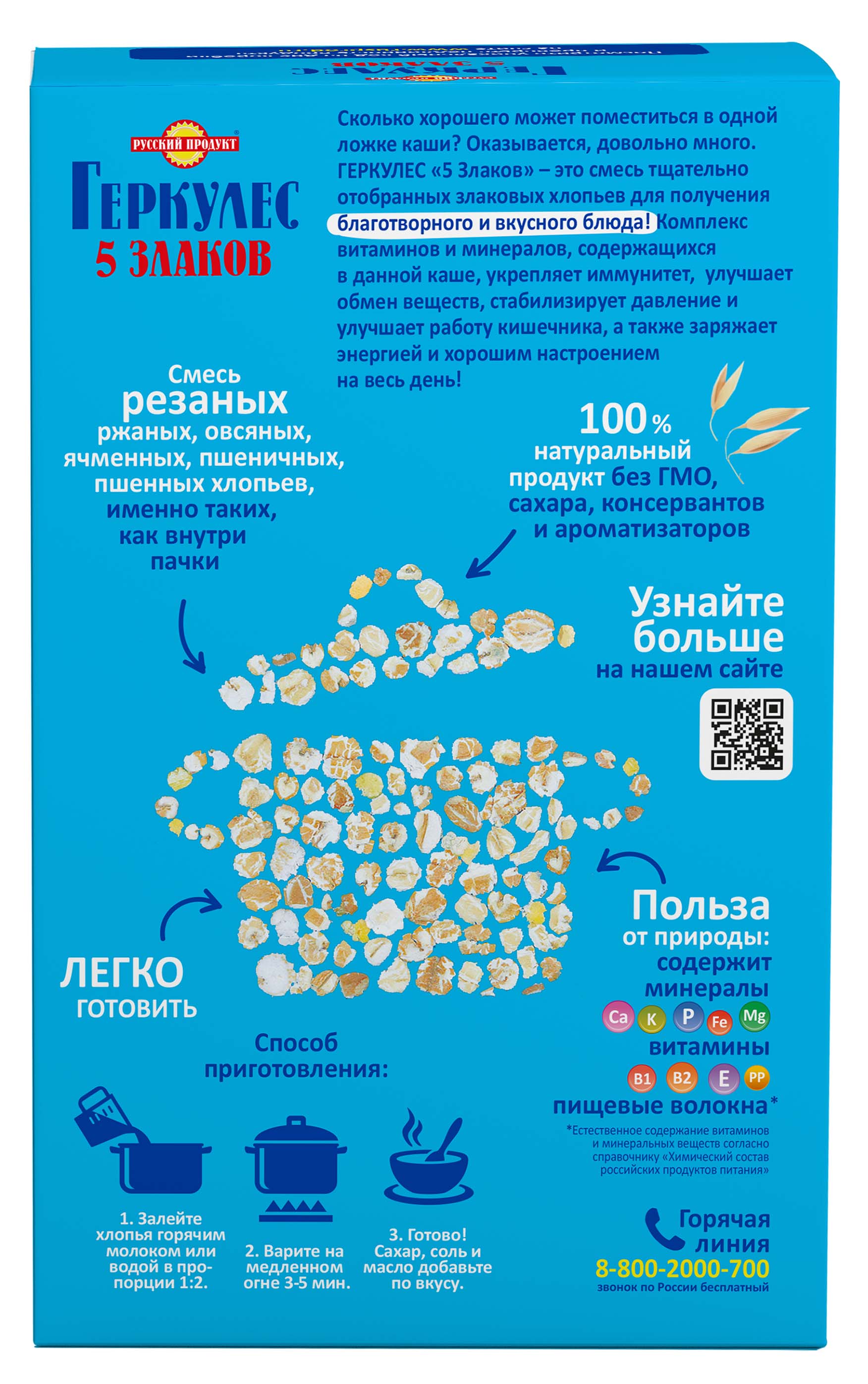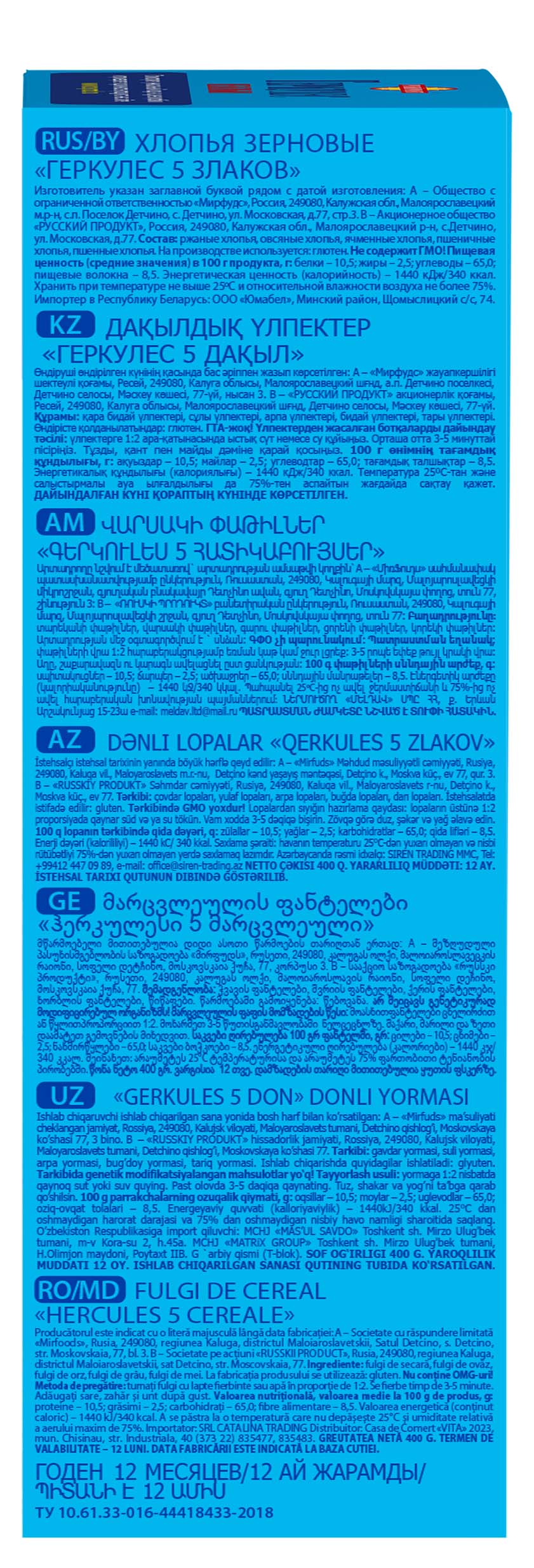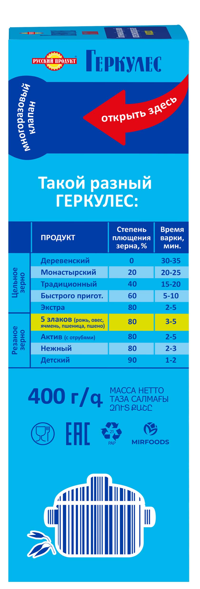 | Геркулес | Бакалея | Геркулес | Геркулес 5 злаков  400 гр/1*6 шт в SRP ш/б /Хлопья зерновые/... | 2726747 | Коробка |  4602112505563 | 400 | 0,00144 | 120 | 63 | 190 |  |  | 10 | Сколько хорошего может поместиться в одной ложке каши? Оказы... | Залейте хлопья горячим молоком или водой в пропорции 1:2. Ва... | Ржаные хлопья, овсяные хлопья, ячменные хлопья, пшеничные хл... | 3D Оборотная Боковая Л Боковая П Групповая уп | 340.0 | 10 | 2 | 65 | 12 |  | Хранить при температуре не выше 25°С и относительной влажнос... | 6 | шоу-бокс |  4602112505570  | 2,4 | 2,76 | 0,00999 | 130 | 396 | 194 | Паллета | 108 | 18 | 864 | 144 | 8 | 18 ш/б х 8 слоев | 1710 | ООО Мирфудс | 249080, Россия, Калужская обл, Малоярославецкий р-н, Детчино... | ЕАЭС N RU Д-RU.РА06.В.95069/25 | 11.08.2025 - 10.08.2030 | соответствует требованиям ТУ 10.61.33-016-44418433-2018 | Скачать | 1104199900 | 10.61.33.110 |