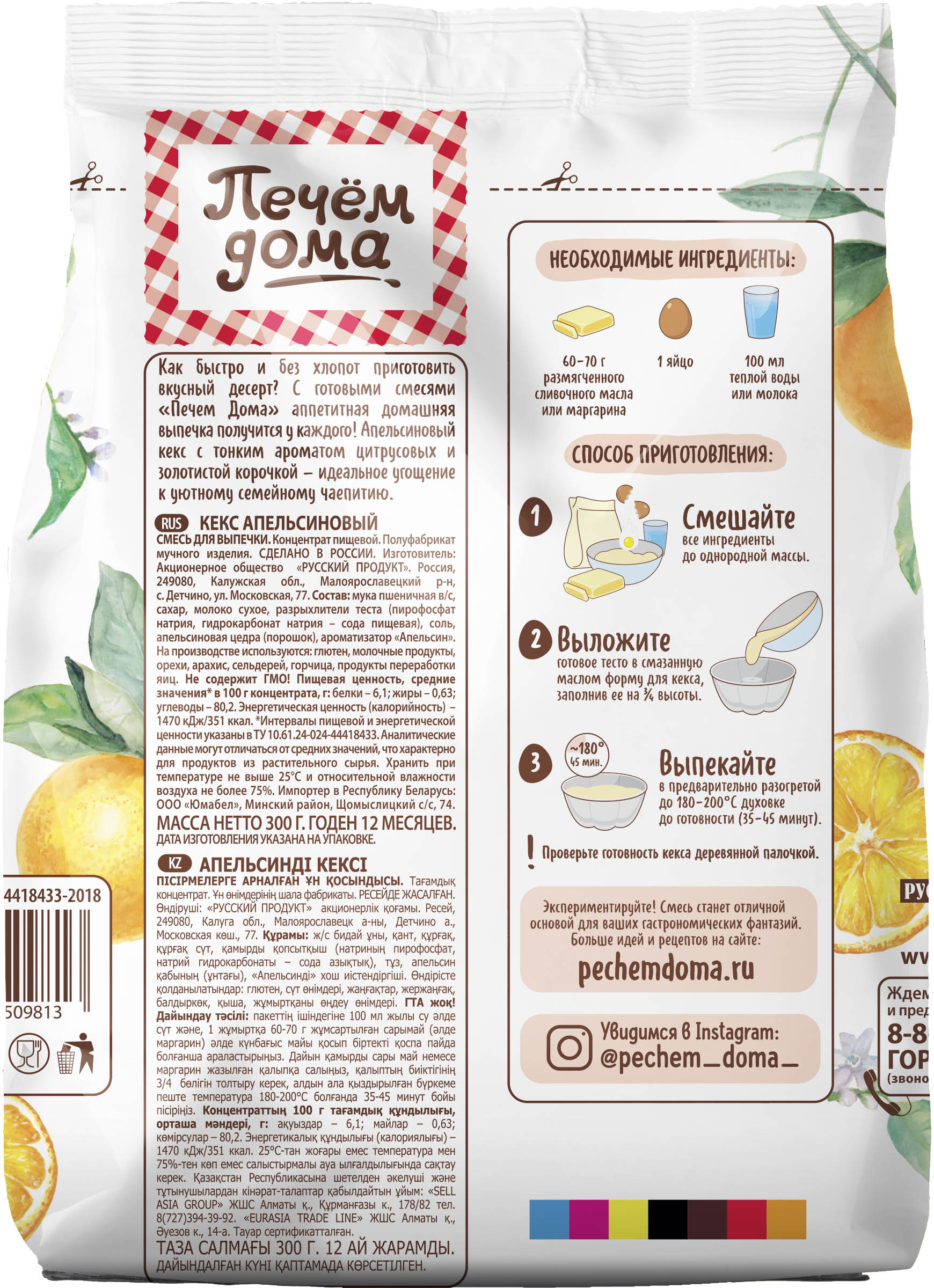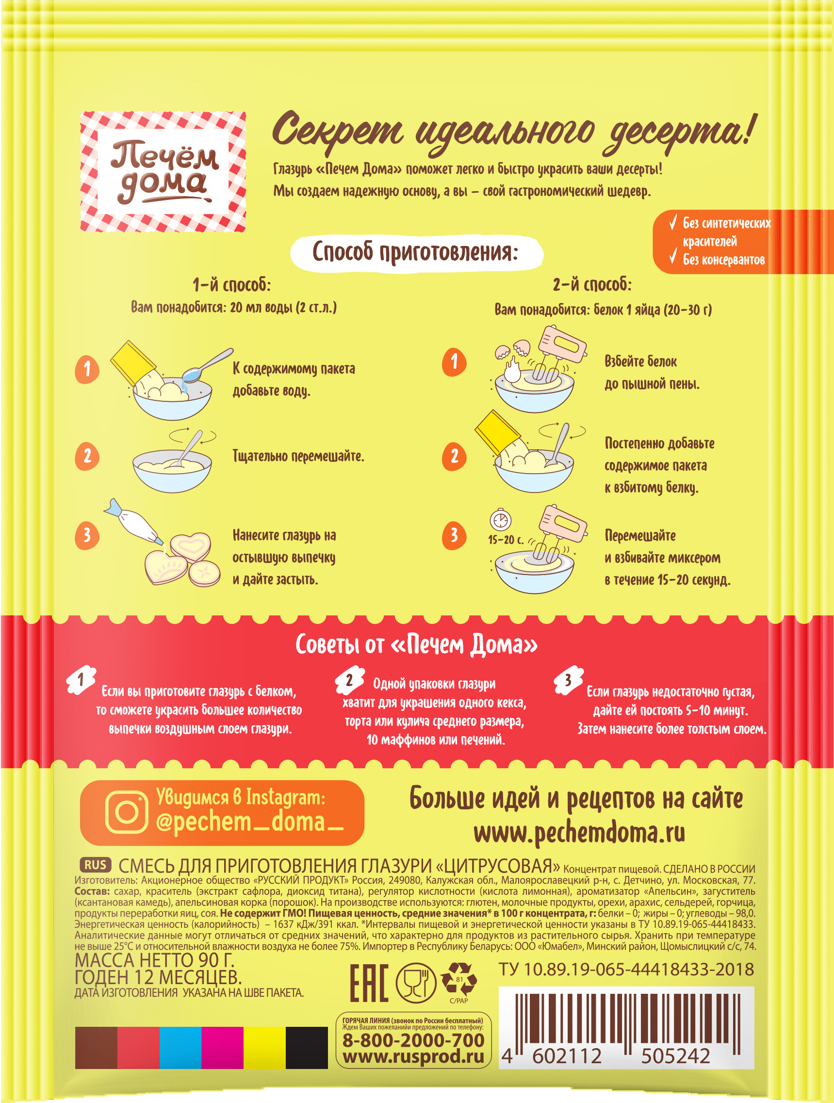 | Печем Дома | Бакалея | Кулинарные добавки | Глазурь Печем дома "Цитрусовая" 90г /15 уп в ш/б (Мирфудс) | 2726871 | Пакет |  4602112505242 | 90 | 0,00038 | 120 | 20 | 160 |  |  | 20 | Глазурь "Печем Дома" поможет легко и быстро украсить ваши де... | К содержимому пакета добавьте 20 мл воды (2 ст.л). Тщательно... | Сахар, краситель (экстракт сафлора, диоксид титана), регулят... | 3D Лицевая Оборотная Групповая уп | 391.0 | 0 | 0 | 98 | 12 |  | Хранить при температуре не выше 25°С и относительной влажнос... | 15 | шоу-бокс |  4602112505259 | 1,35 | 1,51 | 0,00657 | 126 | 305 | 171 | Слой | 360 | 24 | 3240 | 216 | 9 | 24 ш/б х 9 слоев | 1700 | ООО Мирфудс | 249080, Россия, Калужская обл, Малоярославецкий р-н, Детчино... | ЕАЭС N RU Д-RU.РА05.В.22893/25 | 18.06.2025 - 17.06.2030 | соответствует требованиям ТУ 10.89.19-065-44418433-2018 | Скачать | 1704909900 | 10.89.13.112 |