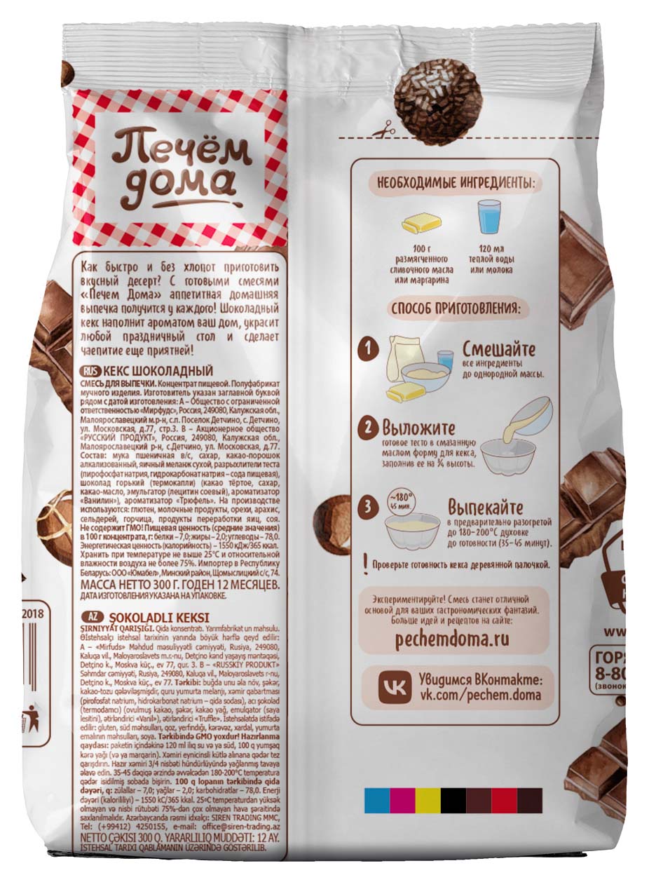 | Печем Дома | Бакалея | Кулинарные добавки | Глазурь Печем дома "Шоколадная" 90г /15 уп в ш/б (Мирфудс) | 2726872 | Пакет |  4602112505266 | 90 | 0,00038 | 120 | 20 | 160 |  |  | 20 | Глазурь "Печем Дома" поможет легко и быстро украсить ваши де... | К содержимому пакета добавьте 20 мл воды (2 ст.л). Тщательно... | Сахар, какао-порошок алкализованный,  антислеживающий агент ... | 3D Лицевая Оборотная Групповая уп | 392.0 | 1.2 | 0.9 | 97 | 12 |  | Хранить при температуре не выше 25°С и относительной влажнос... | 15 | шоу-бокс |  4602112505273 | 1,35 | 1,51 | 0,00657 | 126 | 305 | 171 | Слой | 360 | 24 | 3240 | 216 | 9 | 24 ш/б х 9 слоев | 1700 | ООО Мирфудс | 249080, Россия, Калужская обл, Малоярославецкий р-н, Детчино... | ЕАЭС N RU Д-RU.РА05.В.22893/25 | 18.06.2025 - 17.06.2030 | соответствует требованиям ТУ 10.89.19-065-44418433-2018 | Скачать | 1806909000 | 10.89.13.112 |