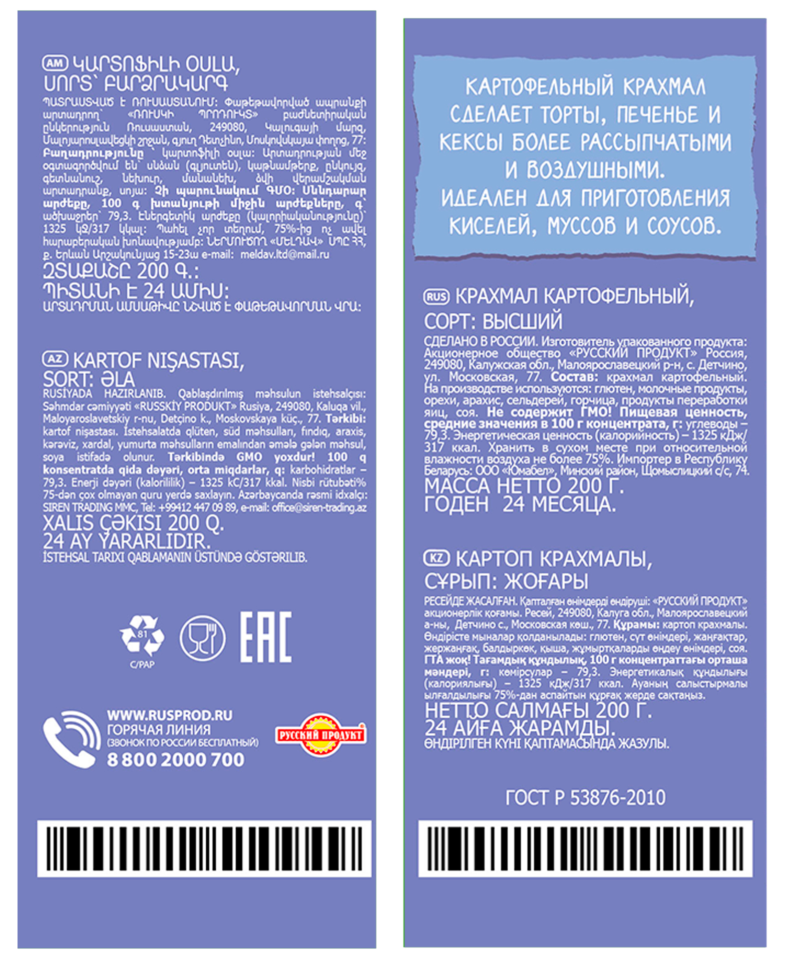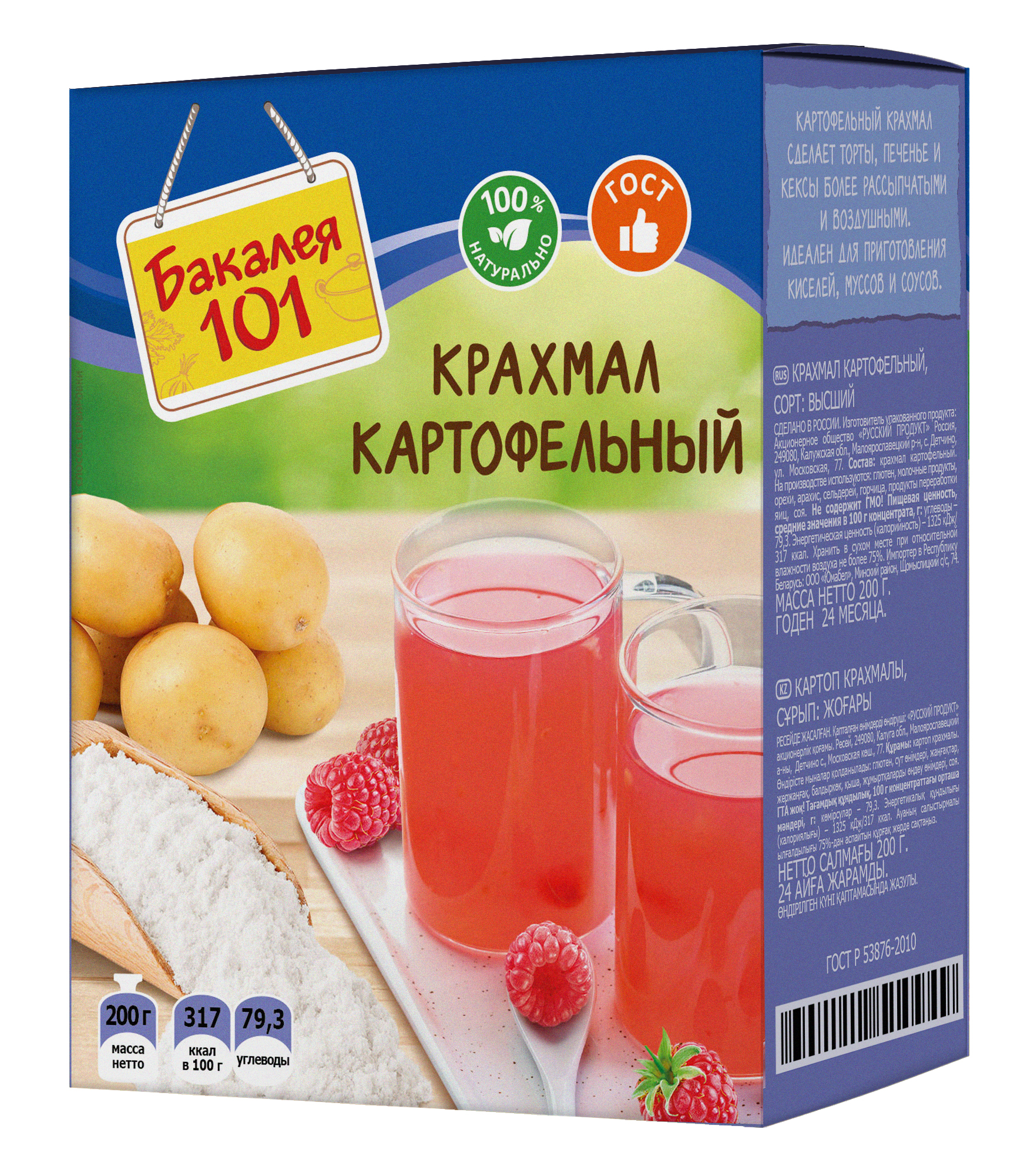 | Бакалея 101 | Бакалея | Крахмал (Собственного производства) | Крахмал картофельный Бакалея 101 200 г/ 14 уп в ш/б (Мирфудс... | 2726589 | коробка |  4602112510949 | 200 | 0,00056 | 92 | 51 | 119 |  |  | 20 | Картофельный крахмал  сделает торты, печенье и кексы более р... | Применяется в соответствии с кулинарными рецептами. | Крахмал картофельный. | Лицевая Оборотная Боковая Л Групповая уп | 317.0 | 0 | 0 | 79.3 | 24 |  | Хранить при температуре не выше 25°С и относительной влажнос... | 14 | шоу-бокс |  4602112510956 | 2,8 | 3,22 | 0,00905 | 192 | 380 | 124 | Слой | 168 | 12 | 2016 | 144 | 12 | 12 ш/б х 12 слоев | 1650 | ООО Мирфудс | 249080, Россия, Калужская обл, Малоярославецкий р-н, Детчино... | ЕАЭС N RU Д-RU.РА05.В.61620/25 | 02.07.2025 - 01.07.2030 | соответствует требованиям ГОСТ Р 53876-2010 | Скачать | 1108130000 | 10.62.11.111 |