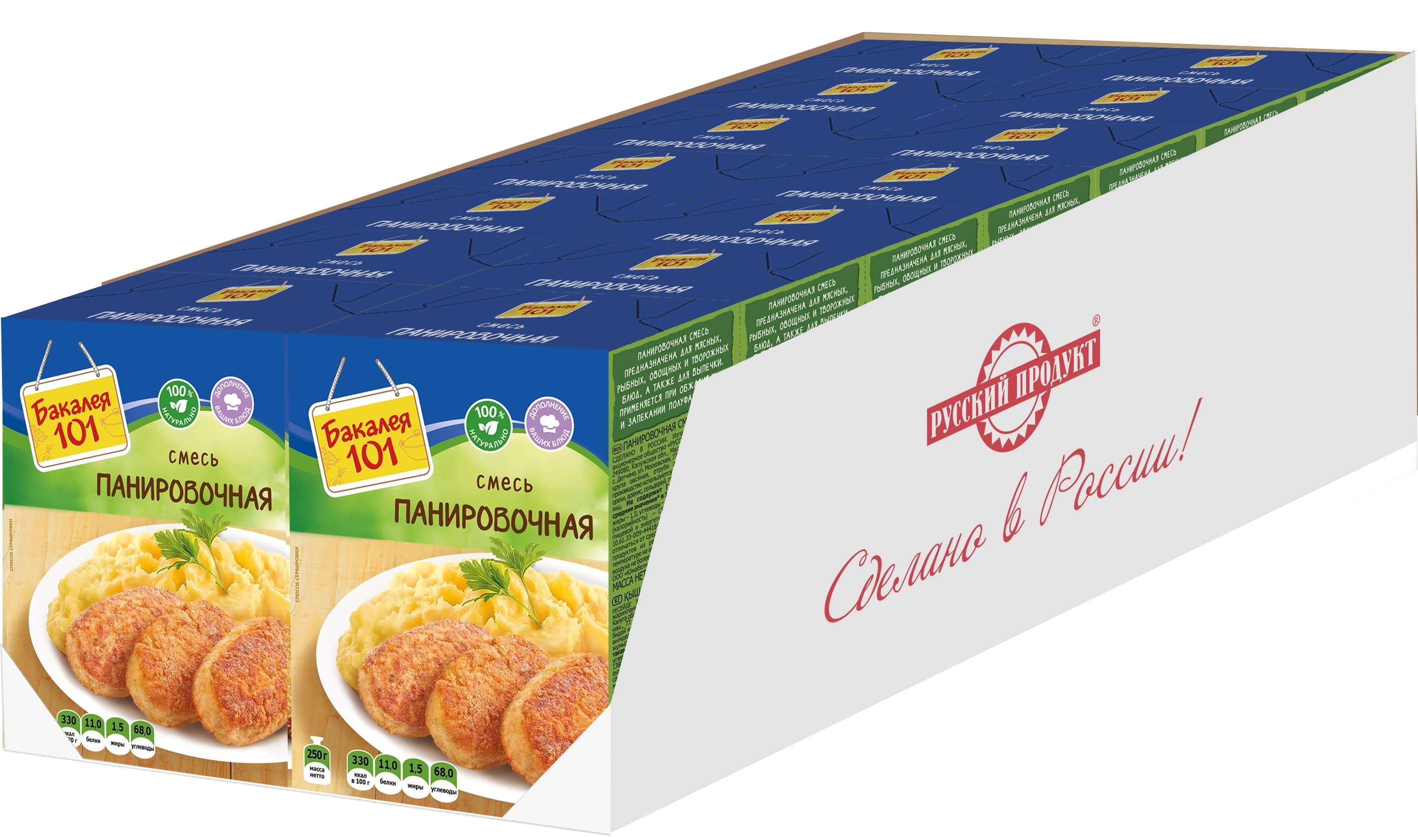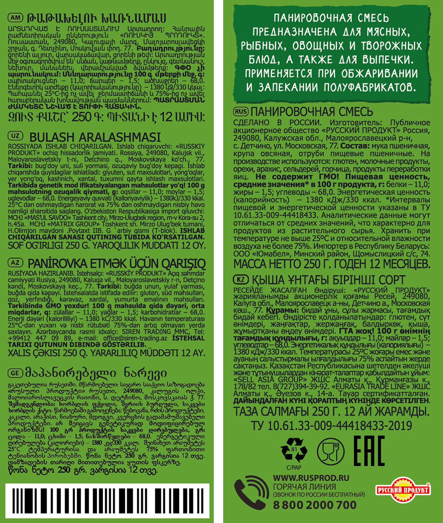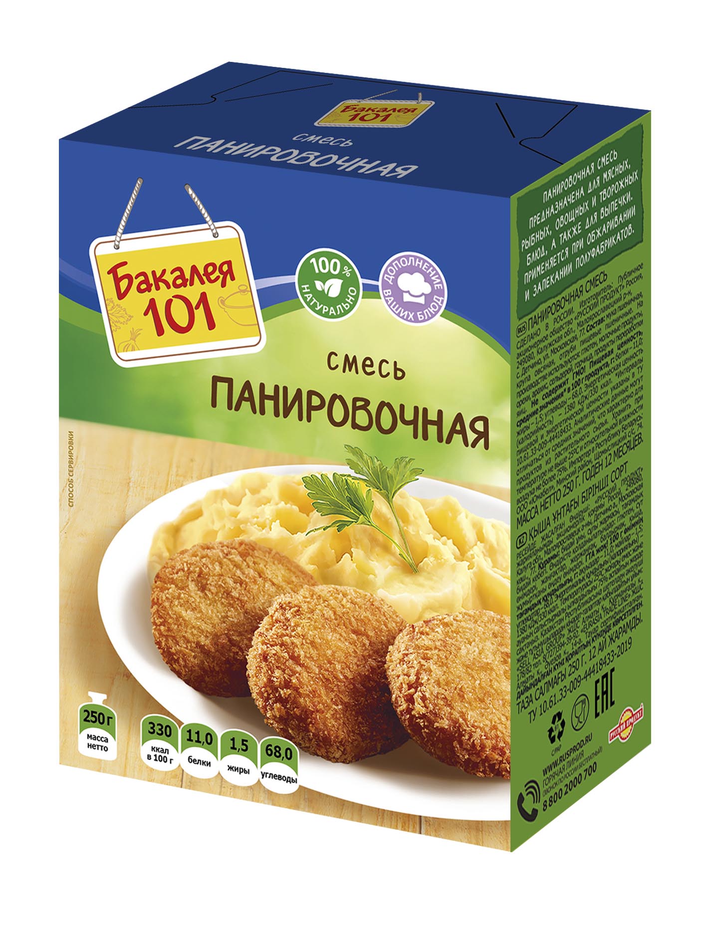 | Бакалея 101 | Бакалея | Панировочная смесь | Панировочная смесь Бакалея 101 250 г/14 уп в ш/б (Мирфудс) | 2726488 | Коробка |  4602112506942 | 250 | 0,00056 | 92 | 51 | 119 |  |  | 10 | Панировочная смесь предназначена для мясных, рыбных, овощных... | Использовать по вкусу. | Мука пшеничная, крупа овсяная, отруби пищевые пшеничные. | 3D Оборотная Боковая Л Групповая уп | 330.0 | 11 | 1.5 | 68 | 12 |  | Хранить при температуре не выше 25°С и относительной влажнос... | 14 | шоу-бокс |  4602112506959 | 3,5 | 3,92 | 0,00909 | 193 | 380 | 124 | Слой | 168 | 12 | 1848 | 132 | 11 | 12 ш/б х 11слоев | 1545 | ООО Мирфудс | 249080, Россия, Калужская обл, Малоярославецкий р-н, Детчино... | ЕАЭС N RU Д-RU.РА04.В.49547/25 | 20.05.2025 - 19.05.2028 | соответствует требованиям ТУ 10.61.33-009-44418433-2019 | Скачать | 1901909800 | 10.61.33.140 |