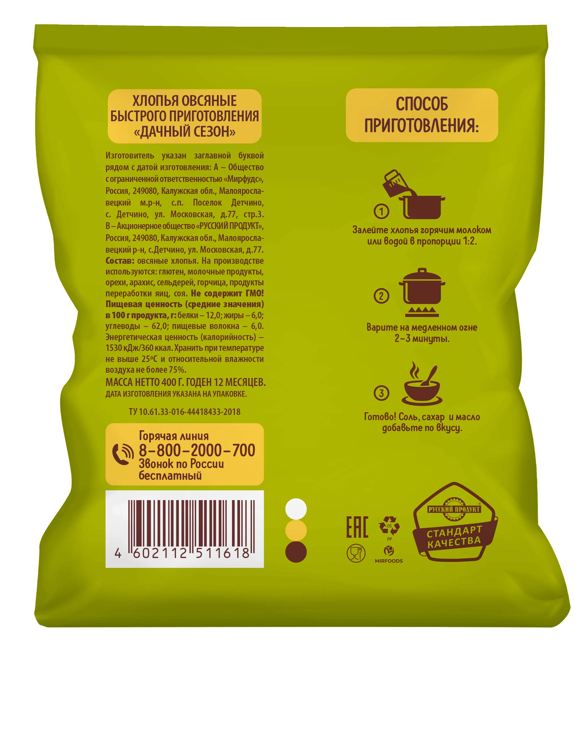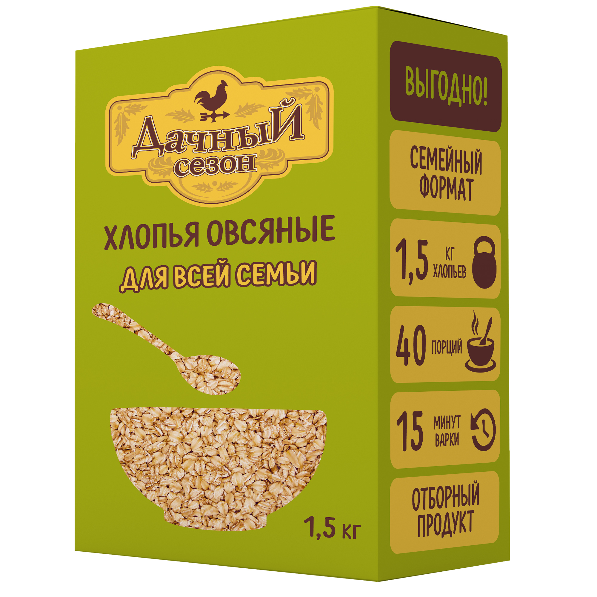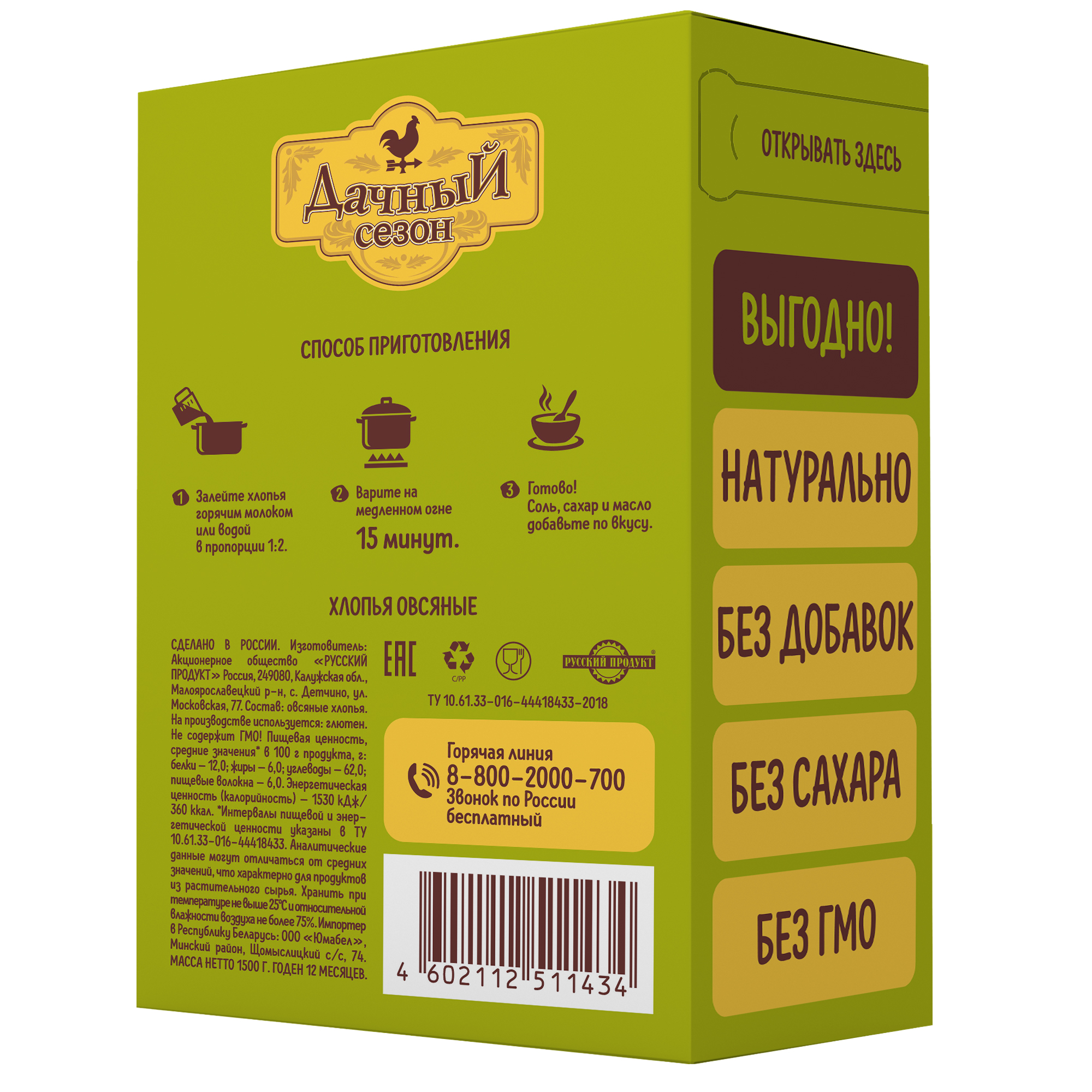 | Дачный Сезон | Бакалея | Каши варочные Хлопья овсяные/зерновые Дачный Сезон | Овсяные хлопья "Дачный сезон" 1500г х 4 шт в ш/б (Мирфудс) | 2726559 | коробка |  4602112511434 | 1500 | 0,00345 | 150 | 94 | 245 |  |  | 10 | Отборные хлопья из цельного овсяного зерна "Дачный сезон" в ... | 1. Залейте хлопья горячим молоком или водой в пропорции 1:3.... | Овсяные хлопья. На производстве используются: глютен, молочн... | 3D Лицевая Оборотная Групповая уп | 360.0 | 12 | 6 | 62 | 12 |  | Хранить при температуре не выше 25°С и относительной влажнос... | 4 | шоу-бокс |  4602112511441 | 6 | 6,52 | 0,01558 | 160 | 391 | 249 | 1 паллета | 56 | 14 | 336 | 84 | 6 | 14 ш/б х 6 слоев | 1650 | ООО Мирфудс | 249080, Россия, Калужская обл, Малоярославецкий р-н, Детчино... |  |  |  |  | 1104129000 | 10.61.33.110 |