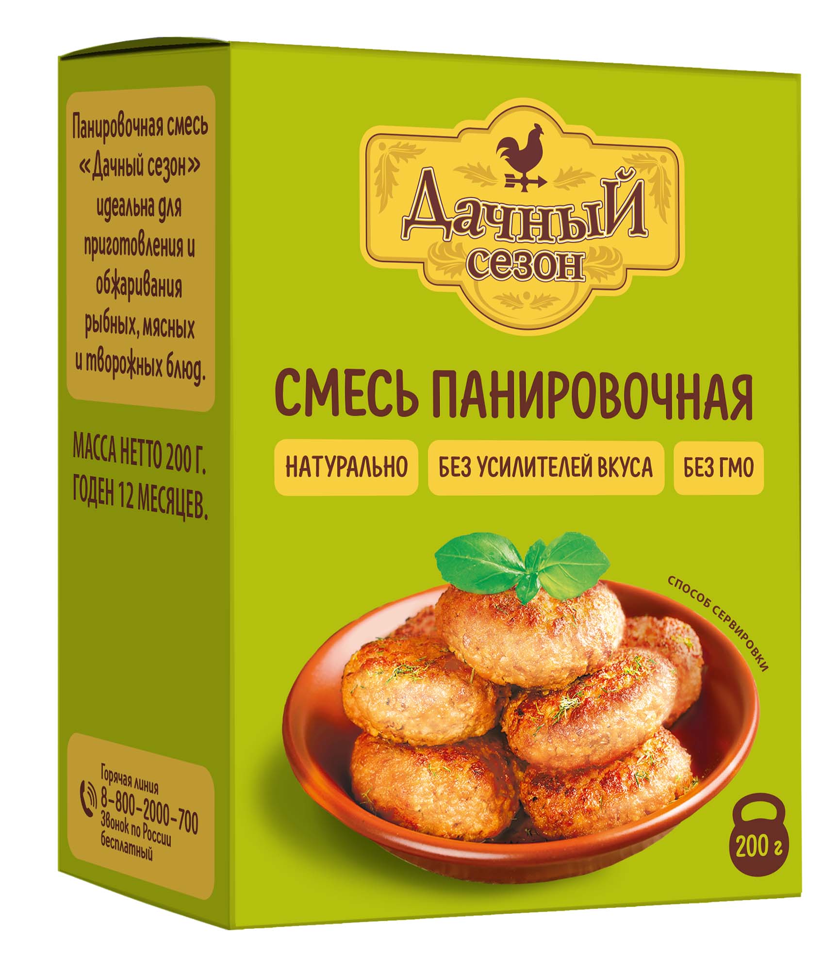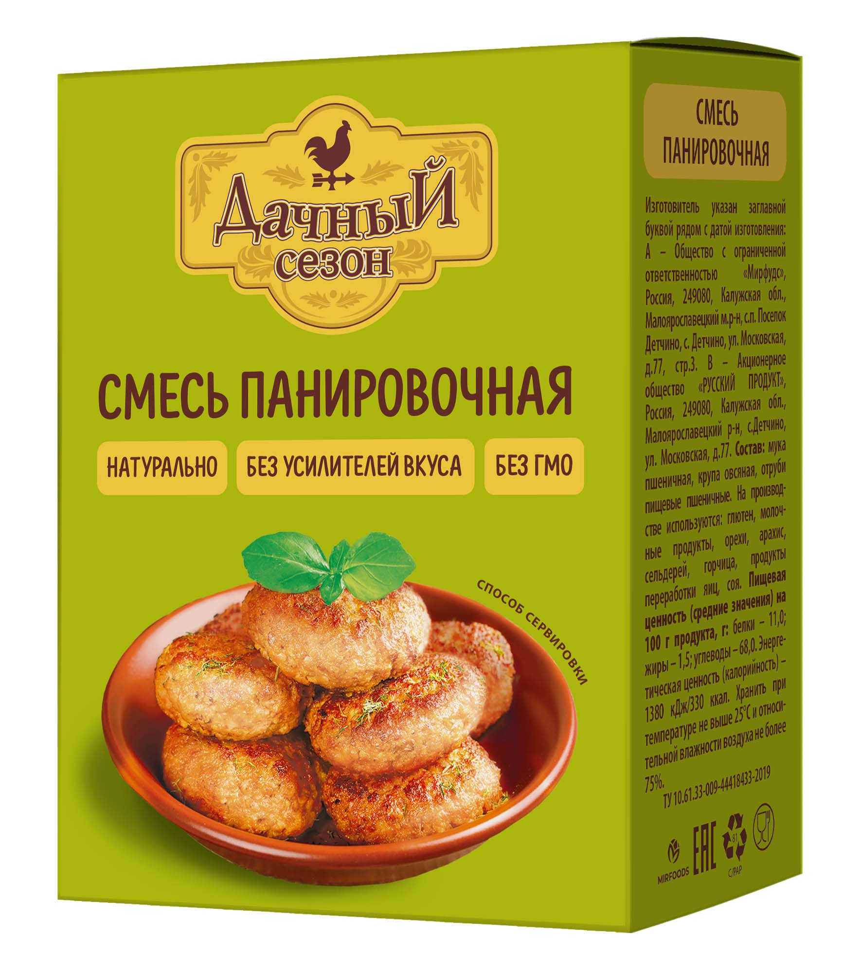 | Дачный Сезон | Бакалея | Панировочная смесь Дачный Сезон | Панировочная смесь "Дачный сезон" 200 г/14 уп в ш/б (Мирфудс... | 2726602 | Коробка |  4602112511977 | 200 | 0,00056 | 92 | 51 | 119 |  |  | 20 | Панировочная смесь "Дачный сезон" идеальна для приготовления... | Использовать по вкусу | Мука пшеничная, крупа овсяная, отруби пищевые пшеничные.