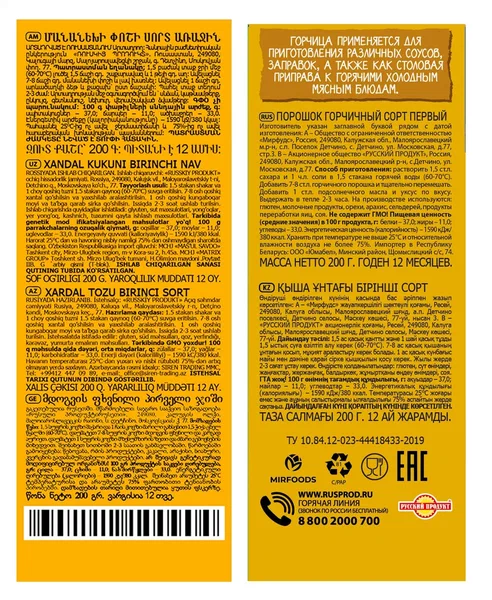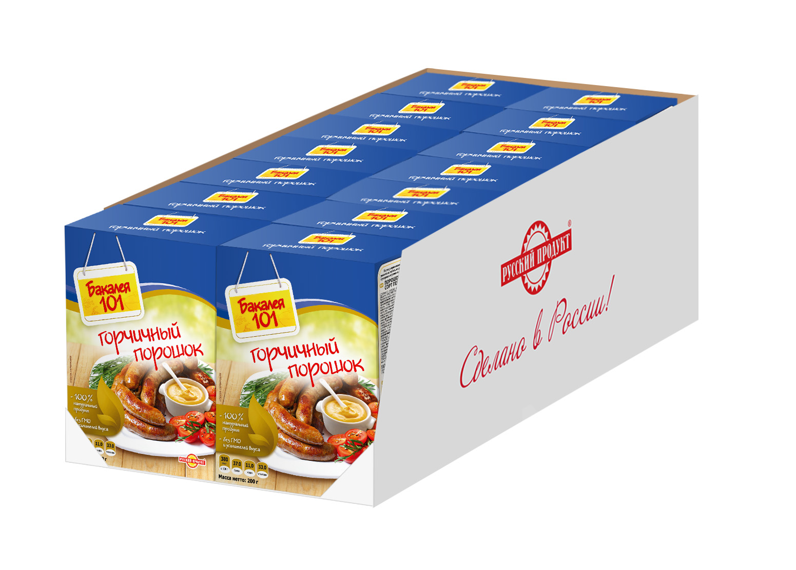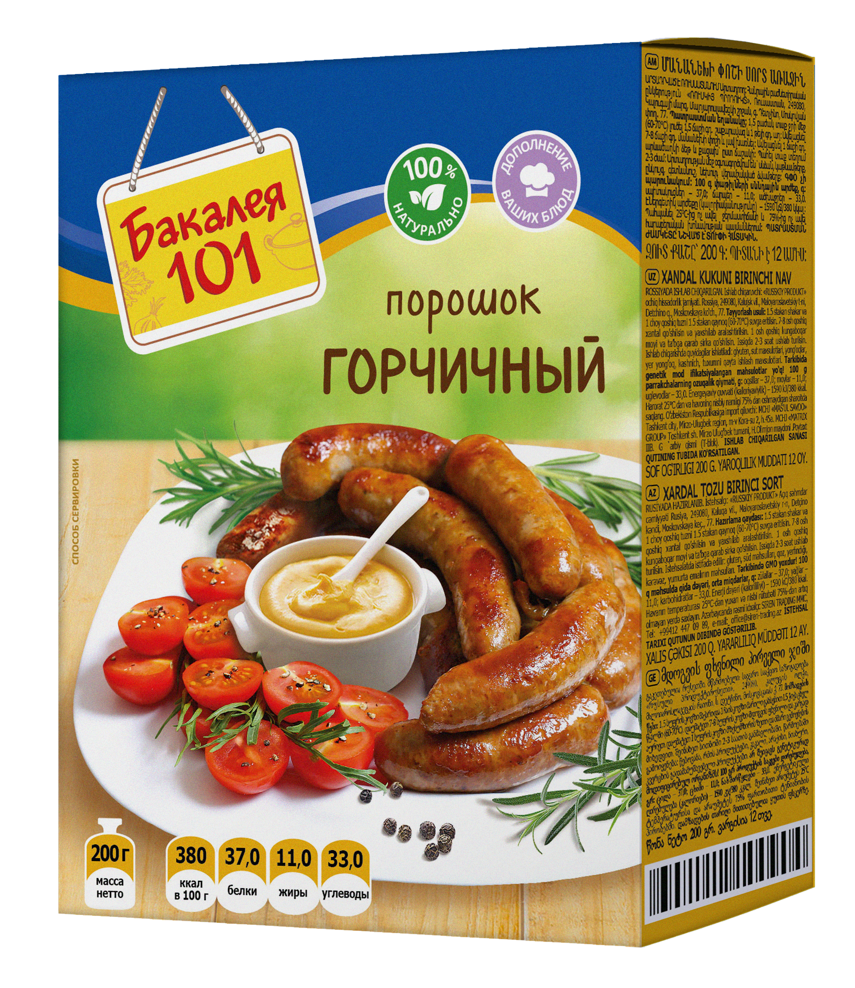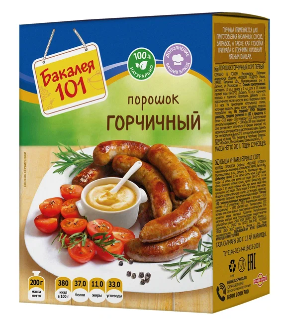 | Бакалея 101 | Бакалея | Горчичный порошок | Горчичный порошок Бакалея 101 200 г/14 уп в ш/б (Мирфудс) | 2726739 | Коробка |  4602112100904 | 200 | 0,00056 | 92 | 51 | 119 |  |  | 20 | Горчица применяется для приготовления различных соусов, запр... | Растворить 1,5 ст.л. сахара и 1 ч.л. соли в 1,5 стакана горя... | Порошок горчичный. | 3D Лицевая Оборотная Боковая Л Боковая П Групповая уп | 380.0 | 37 | 11 | 33 | 12 |  | Хранить при температуре не выше 25°С и относительной влажнос... | 14 | шоу-бокс |  4602112504443 | 2,8 | 3,22 | 0,00909 | 193 | 380 | 124 | Слой | 168 | 12 | 1848 | 132 | 11 | 12 ш/б х 11 слоев | 1545 | ООО Мирфудс | 249080, Россия, Калужская обл, Малоярославецкий р-н, Детчино... | ЕАЭС N RU Д-RU.РА04.В.50922/25 | 21.05.2025 - 20.05.2028 | соответствует требованиям ТУ 10.84.12-023-44418433-2019 | Скачать | 2103301000 | 10.84.12.160 |