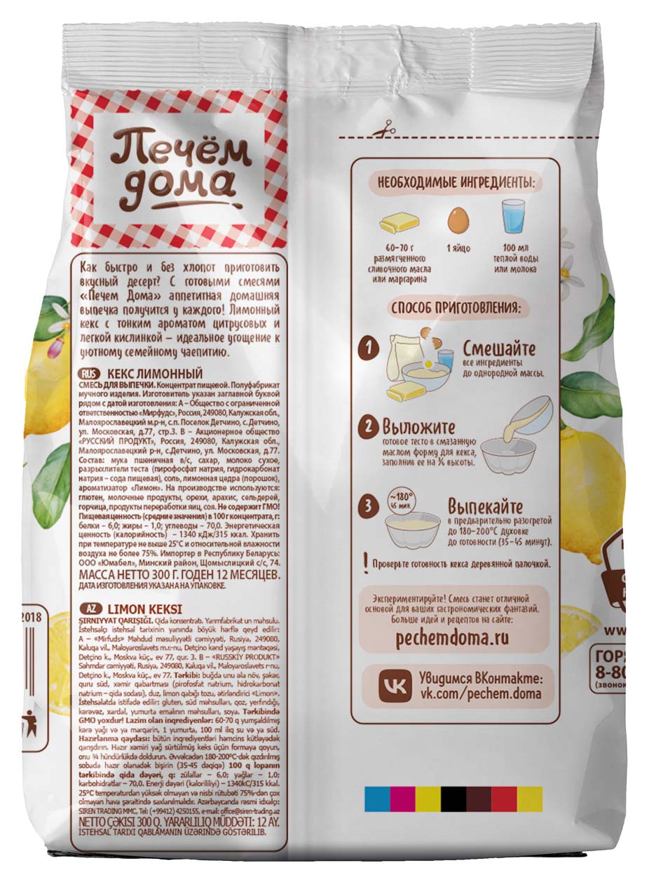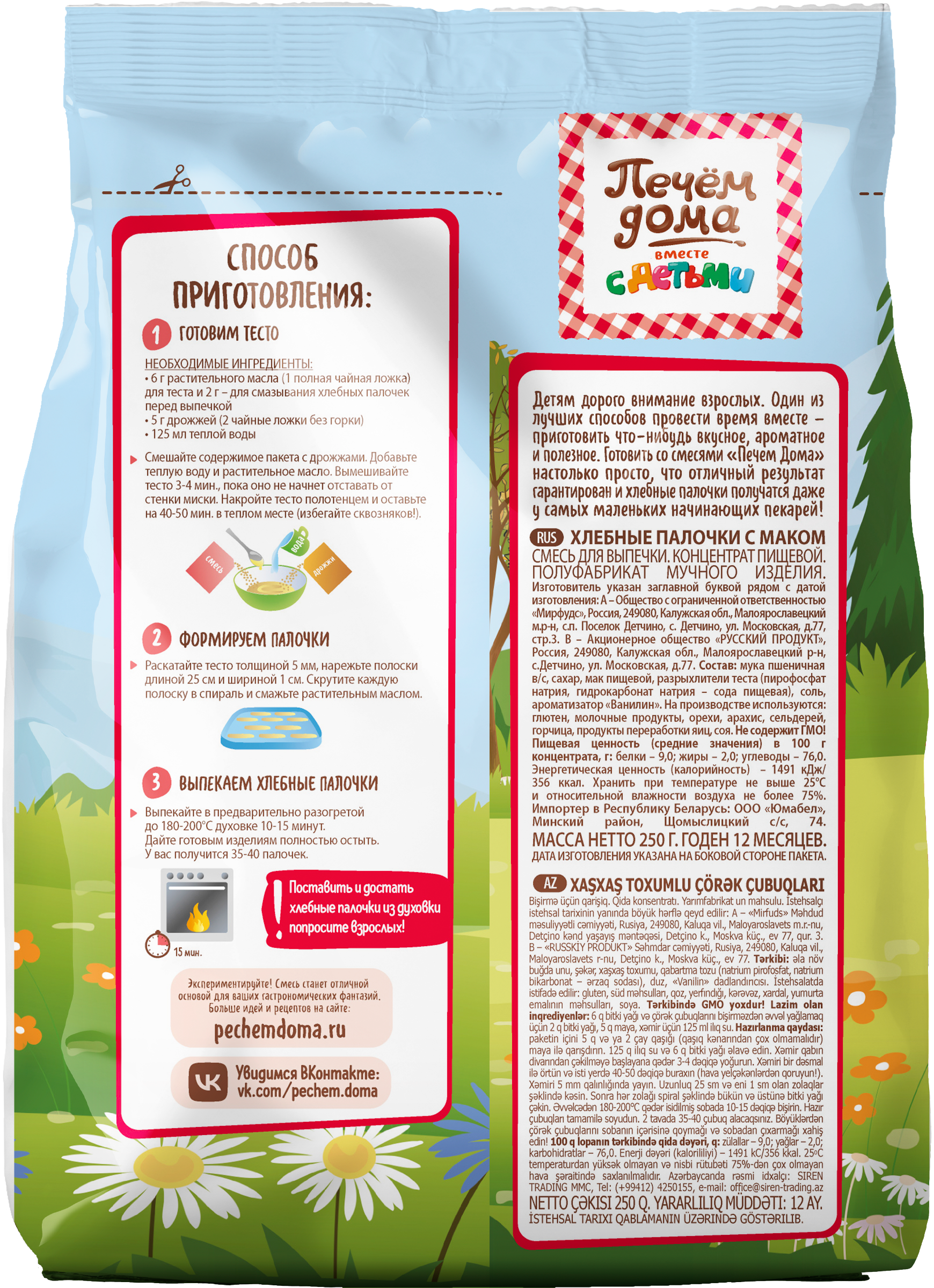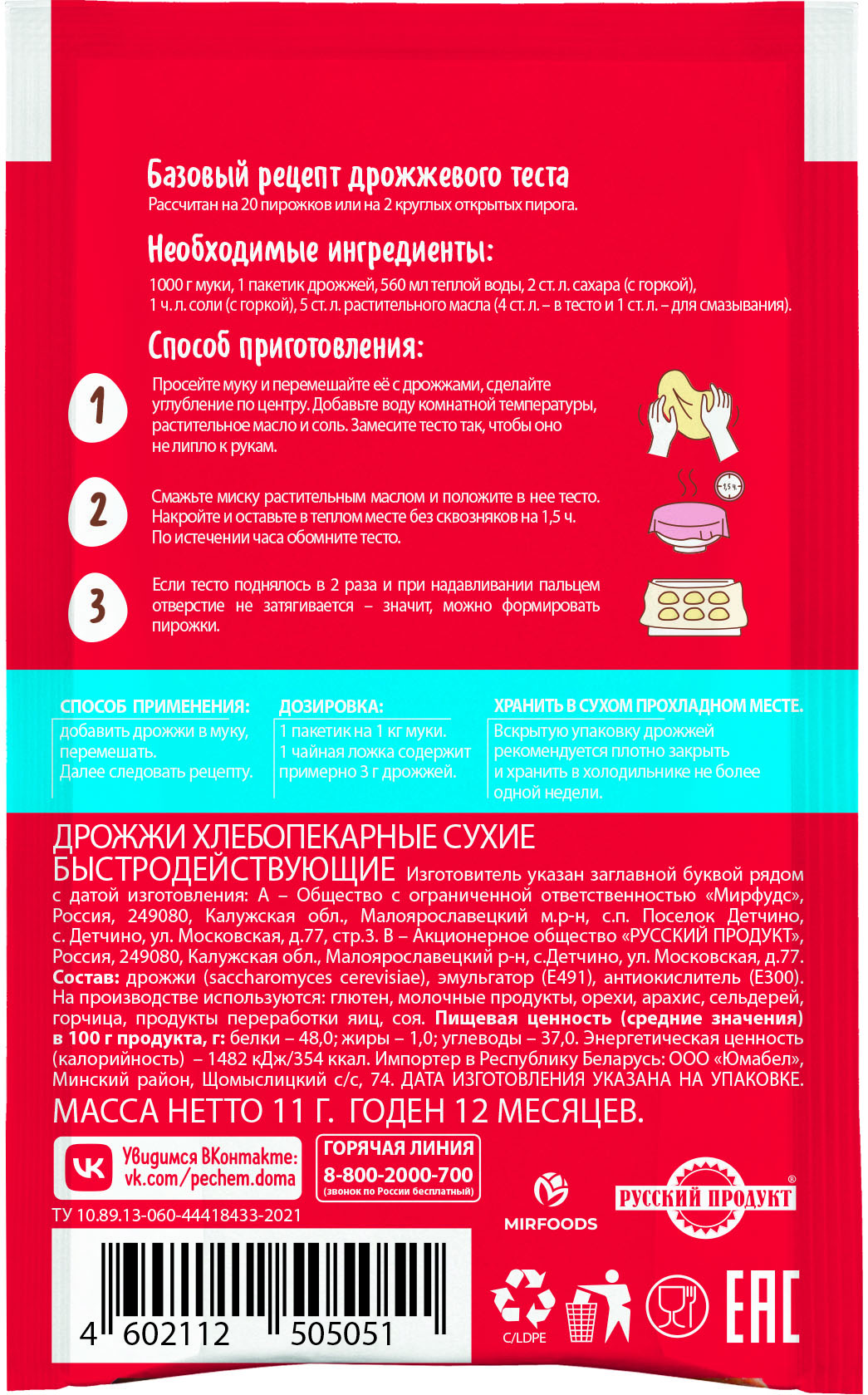 | Печем Дома | Бакалея | Кулинарные добавки | Кулин. добавка Печем дома Дрожжи 11г /30 уп в ш/б (Мирфудс) | 2726842 | Пакет |  4602112505051 | 11 | 0,0001 | 75 | 7 | 120 |  |  | 20 | Пышные пирожки, блины, сдобные булочки и пасхальный кулич - ... | добавить дрожжи в муку, перемешать. Далее следовать рецепту.... | дрожжи (saccharomyces cerevisiae), эмульгатор (Е491), антиок... | 3D Лицевая Оборотная Групповая уп | 410.0 | 49 | 6 | 40 | 12 |  | Хранить в сухом прохладном месте. | 30 | шоу-бокс |  4602112505068 | 0,33 | 0,426 | 0,00293 | 85 | 265 | 130 | Слой | 1260 | 42 | 15120 | 504 | 12 | 42 ш/б х 12 слоев | 1720 | ООО Мирфудс | 249080, Россия, Калужская обл, Малоярославецкий р-н, Детчино... | ЕАЭС N RU Д-RU.РА02.В.23789/23 | 06.03.2023 - 05.03.2026 | соответствует требованиям ТУ 10.89.13-060-44418433-2021 | Скачать | 2102103100 | 10.89.13.112 |