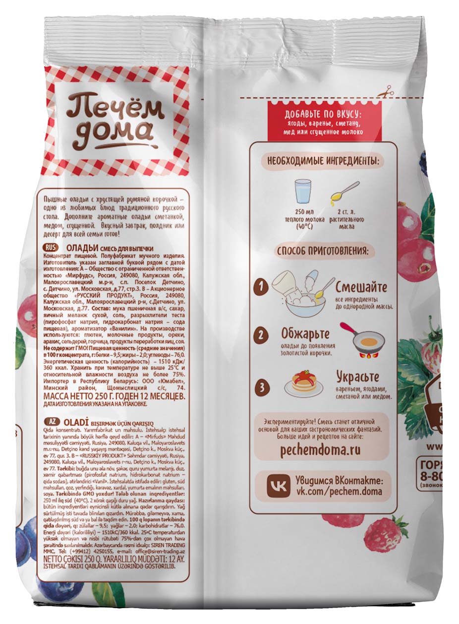 1. К содержимому пакета добавить 60 м... | Состав: сахар, мука пшеничная в/с, крахмал кукурузный, молок... | 3D Лицевая Оборотная Групповая уп | 420.0 | 6 | 7.5 | 81 | 6 |  | Хранить при температуре не выше 25°С и относительной влажнос... | 15 | шоу-бокс |  4602112506317 | 1,35 | 1,61 | 0,00648 | 125 | 305 | 170 | Слой | 360 | 24 | 3240 | 216 | 9 | 24 ш/б х 9 слоев | 1700 | ООО Мирфудс | 249080, Россия, Калужская обл, Малоярославецкий р-н, Детчино... | ЕАЭС N RU Д-RU.РА04.В.93428/25 | 05.06.2025 - 04.06.2028 | соответствует требованиям ТУ 10.89.19-013-44418433-2019 | Скачать | 2106909809 | 10.89.19.230 |