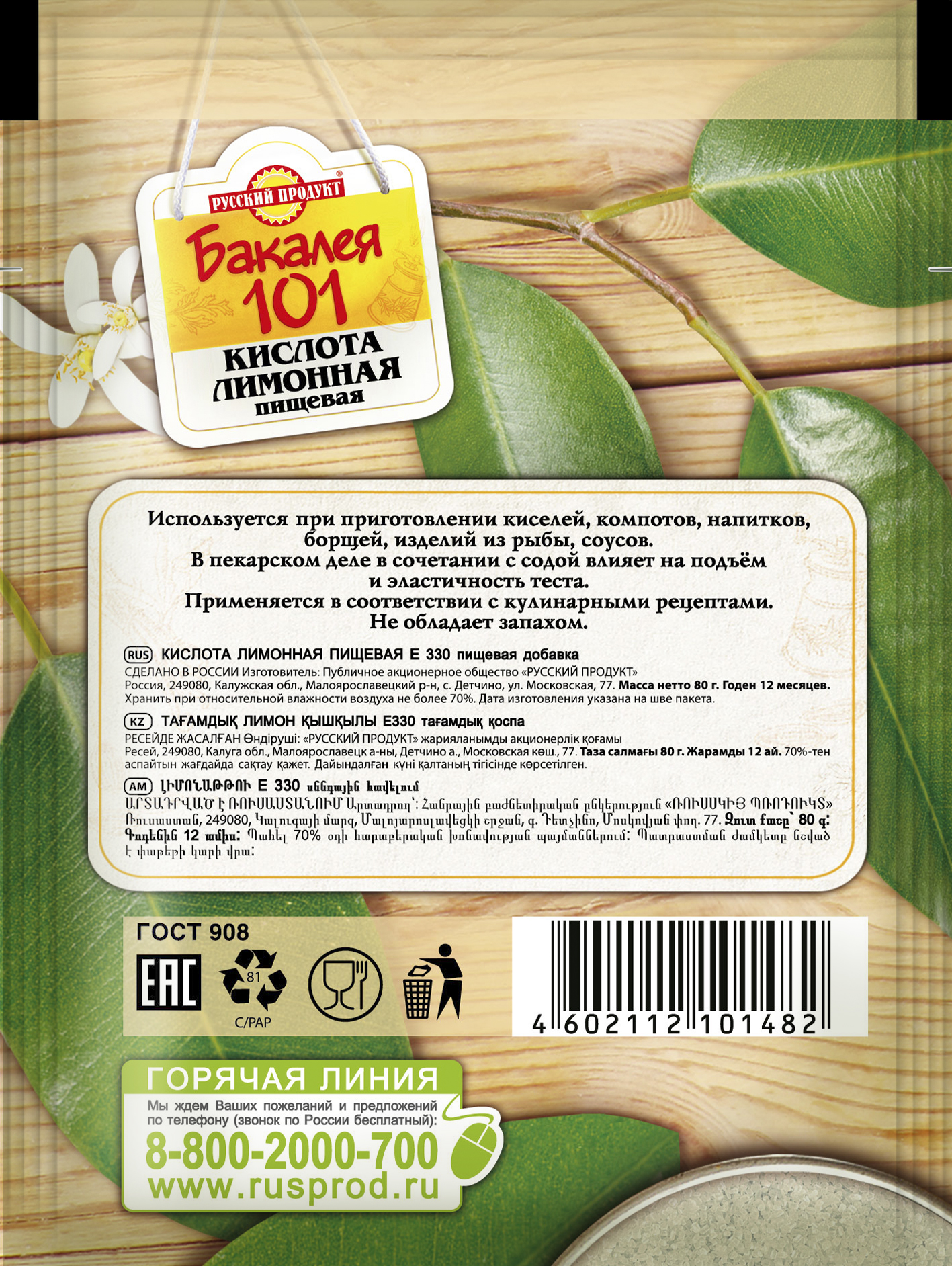 | Бакалея 101 | Бакалея | Лимонная кислота | Лимонная кислота Бакалея 101 80 г/18 уп в ш/б (Мирфудс) | 2726690 | Пакет |  4602112101482 | 80 | 0,00019 | 120 | 10 | 160 |  |  | 20 | Лимонная кислота "БАКАЛЕЯ 101" используется в кулинарных и х... | Использовать по вкусу. | Кислота лимонная пищевая Е330. | 3D Оборотная Групповая уп | 0.0 | 0 | 0 | 0 | 12 |  | Хранить при относительной влажности воздуха не более 70% | 18 | шоу-бокс |  4602112210511 | 1,44 | 1,6 | 0,00648 | 125 | 305 | 170 | Слой | 432 | 24 | 3888 | 216 | 9 | 24 ш/Б х 9 слоев | 1700 | ООО Мирфудс | 249080, Россия, Калужская обл, Малоярославецкий р-н, Детчино... | ЕАЭС N RU Д-RU.РА04.В.45035/25 | 19.05.2025 - 18.05.2030 | соответствует требованиям ГОСТ 908-2004 | Скачать | 2918140000 | 20.14.34.231 |