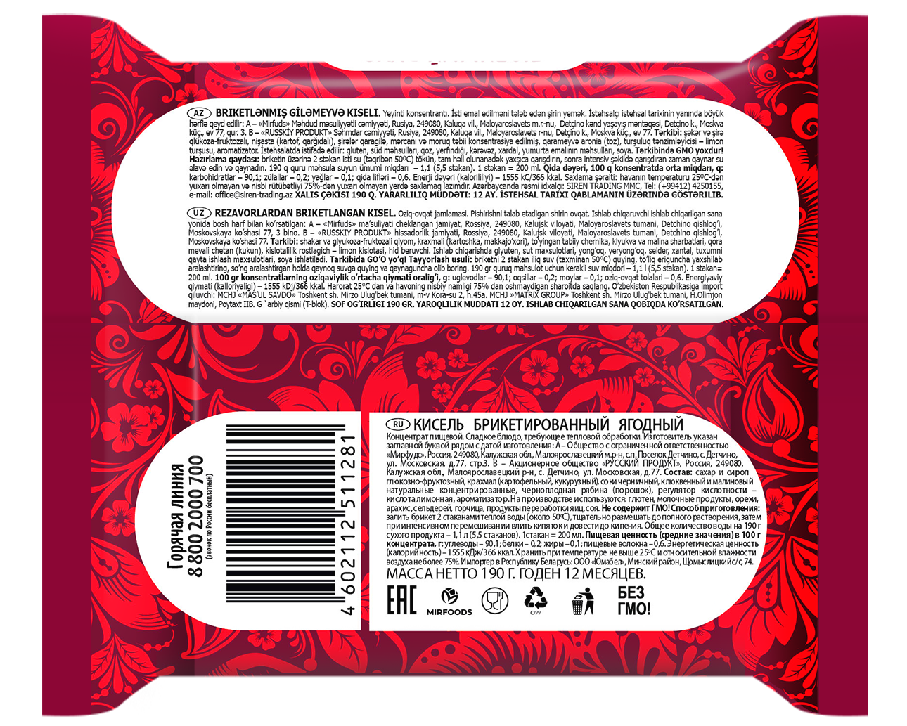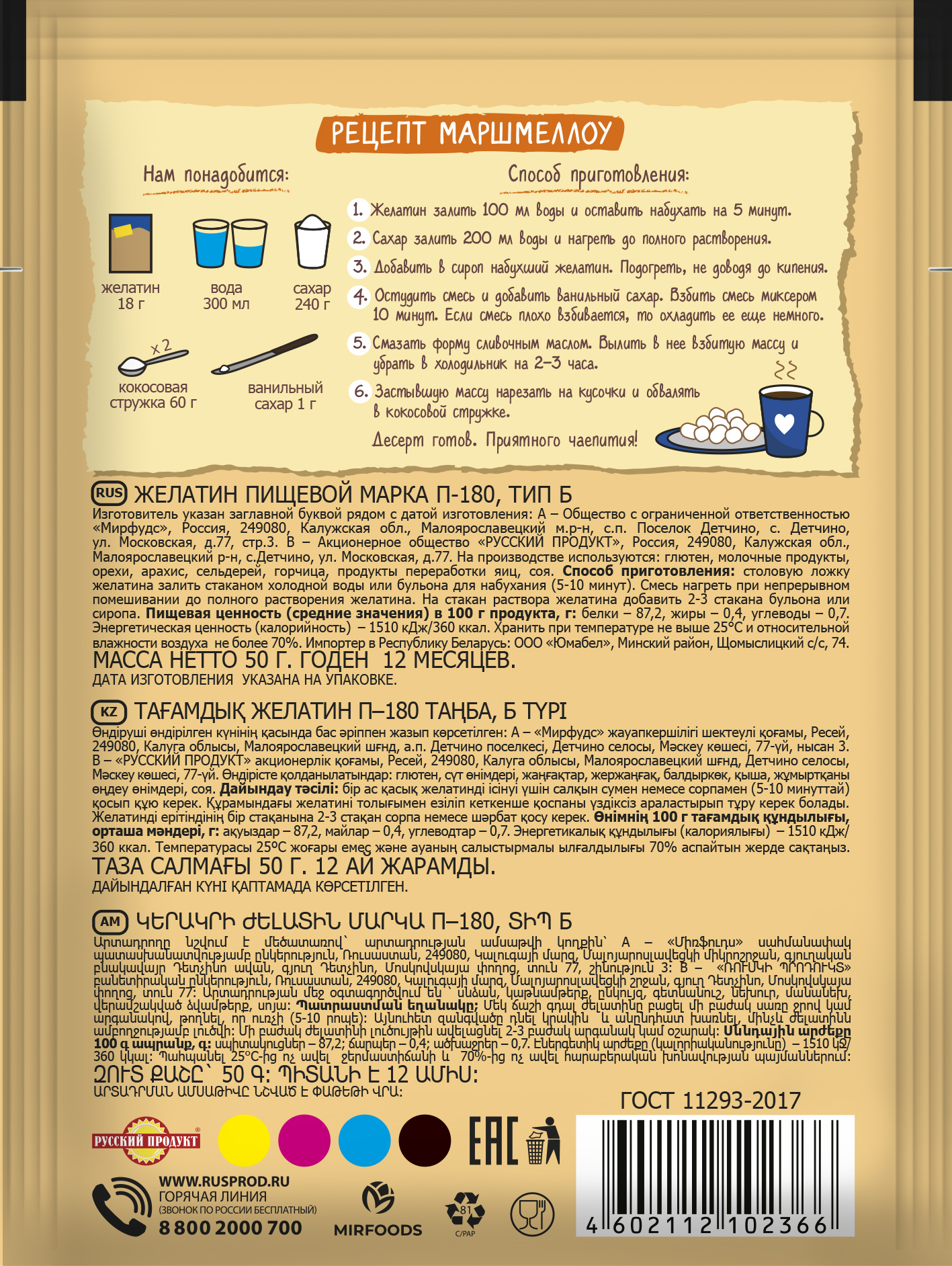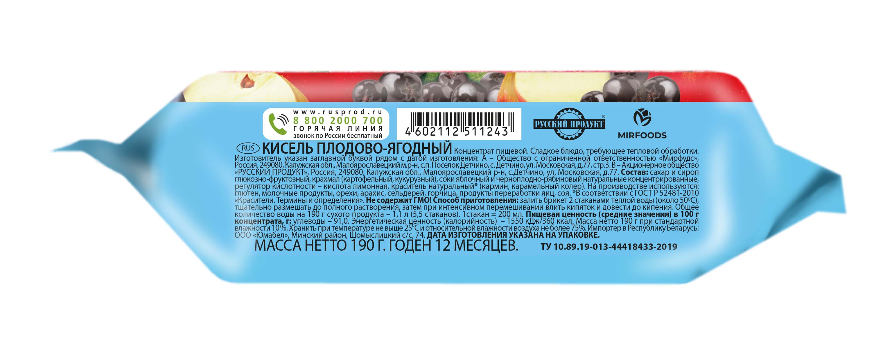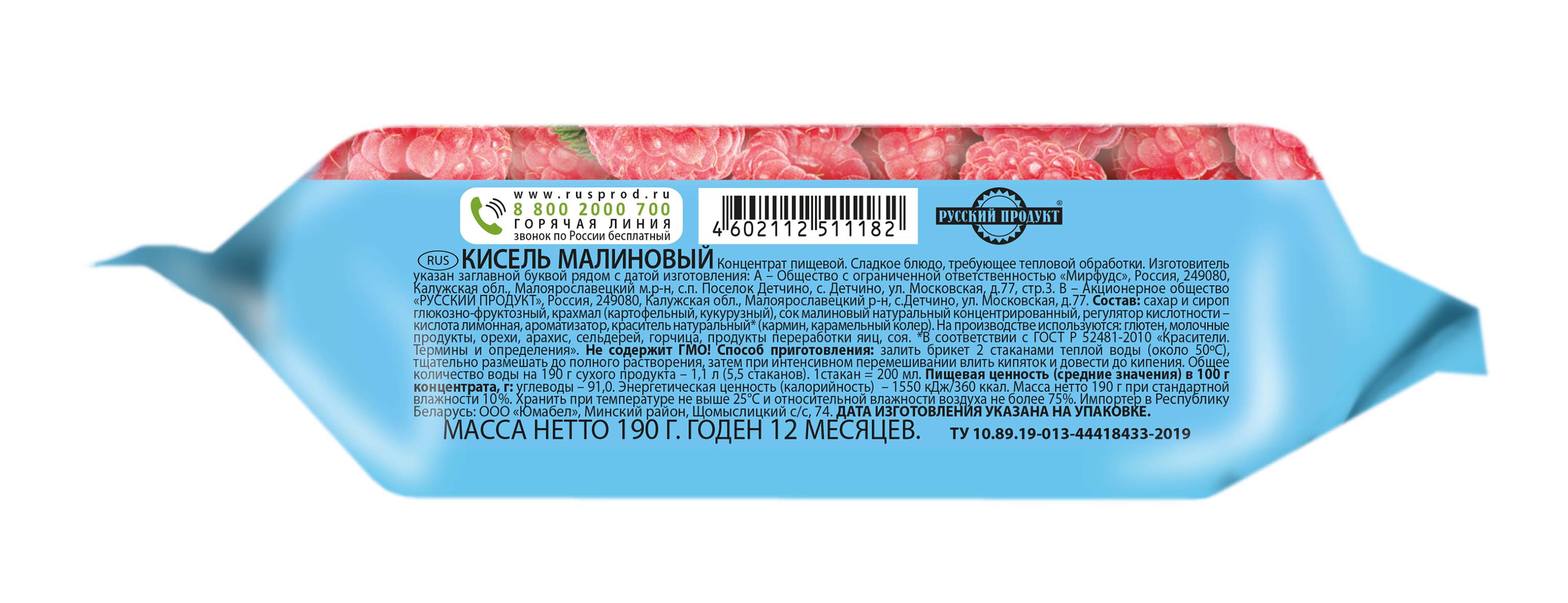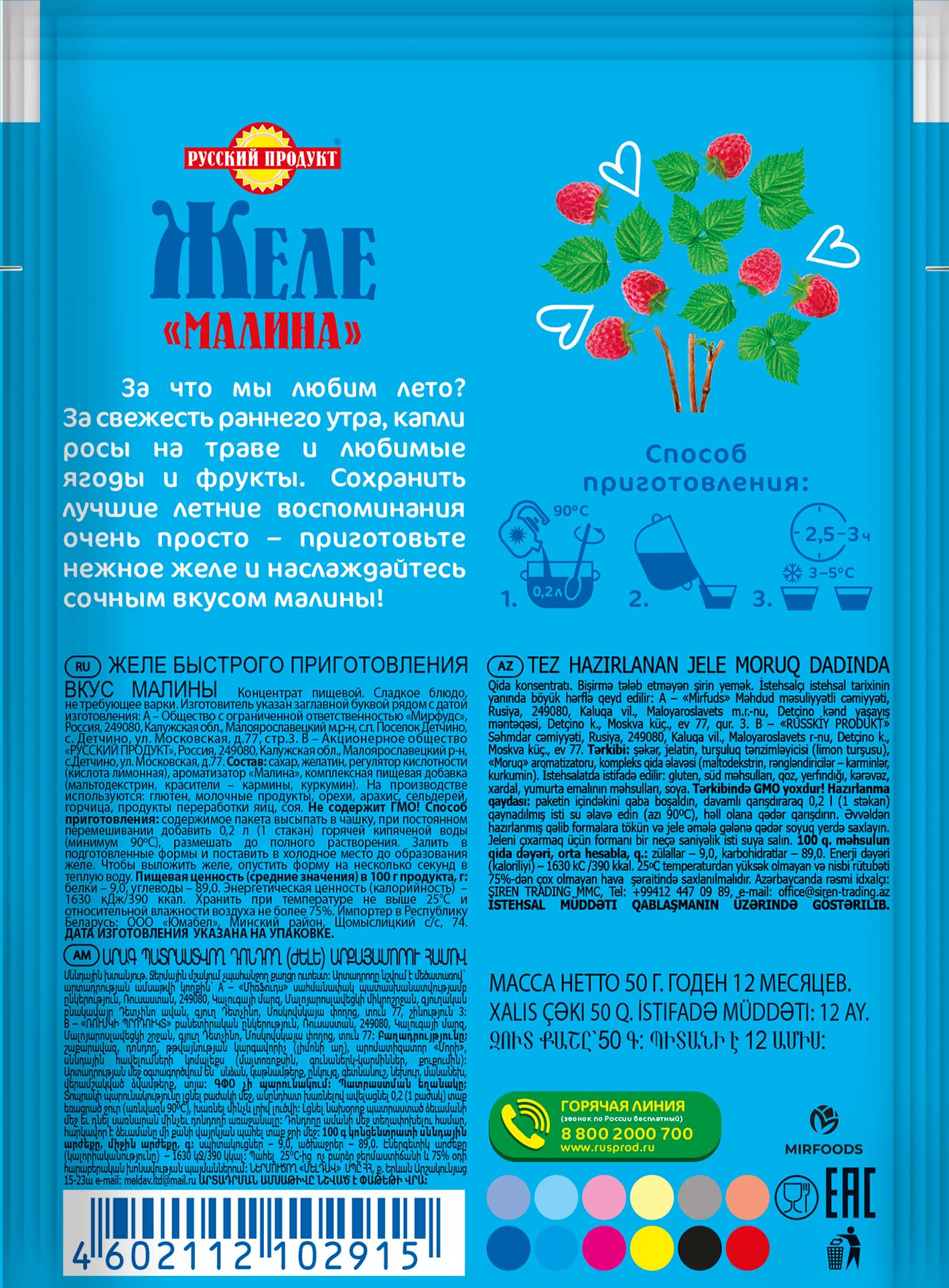 | Русский Продукт | Бакалея | Желе. | Желе быстрого пригот. "Вкус малины" 50 г/35 уп в ш/б (Мирфуд... | 2726954 | Пакет |  4602112102915 | 50 | 0,00019 | 120 | 10 | 160 |  |  | 20 | Для приготовления желе "РУССКИЙ ПРОДУКТ" со вкусом малины не... | Содержимое пакета высыпать в чашку, при постоянном перемешив... | сахар, желатин, регулятор кислотности (кислота лимонная), ар... | 3D Лицевая Оборотная Групповая уп | 390.0 | 9 | 0 | 89 | 12 |  | Хранить при температуре не выше 25°С и относительной влажнос... | 35 | шоу-бокс |  4602112209515 | 1,75 | 2,12 | 0,00648 | 125 | 305 | 170 | Слой | 840 | 24 | 7560 | 216 | 9 | 24 ш/б х 9 слоев | 1690 | ООО Мирфудс | 249080, Россия, Калужская обл, Малоярославецкий р-н, Детчино... | ЕАЭС N RU Д-RU.РА05.В.93558/25 | 14.07.2025 - 13.07.2030 | соответствует требованиям ТУ 10.89.19-002-50948224-2022 | Скачать | 2106909808 | 10.89.19.230 |