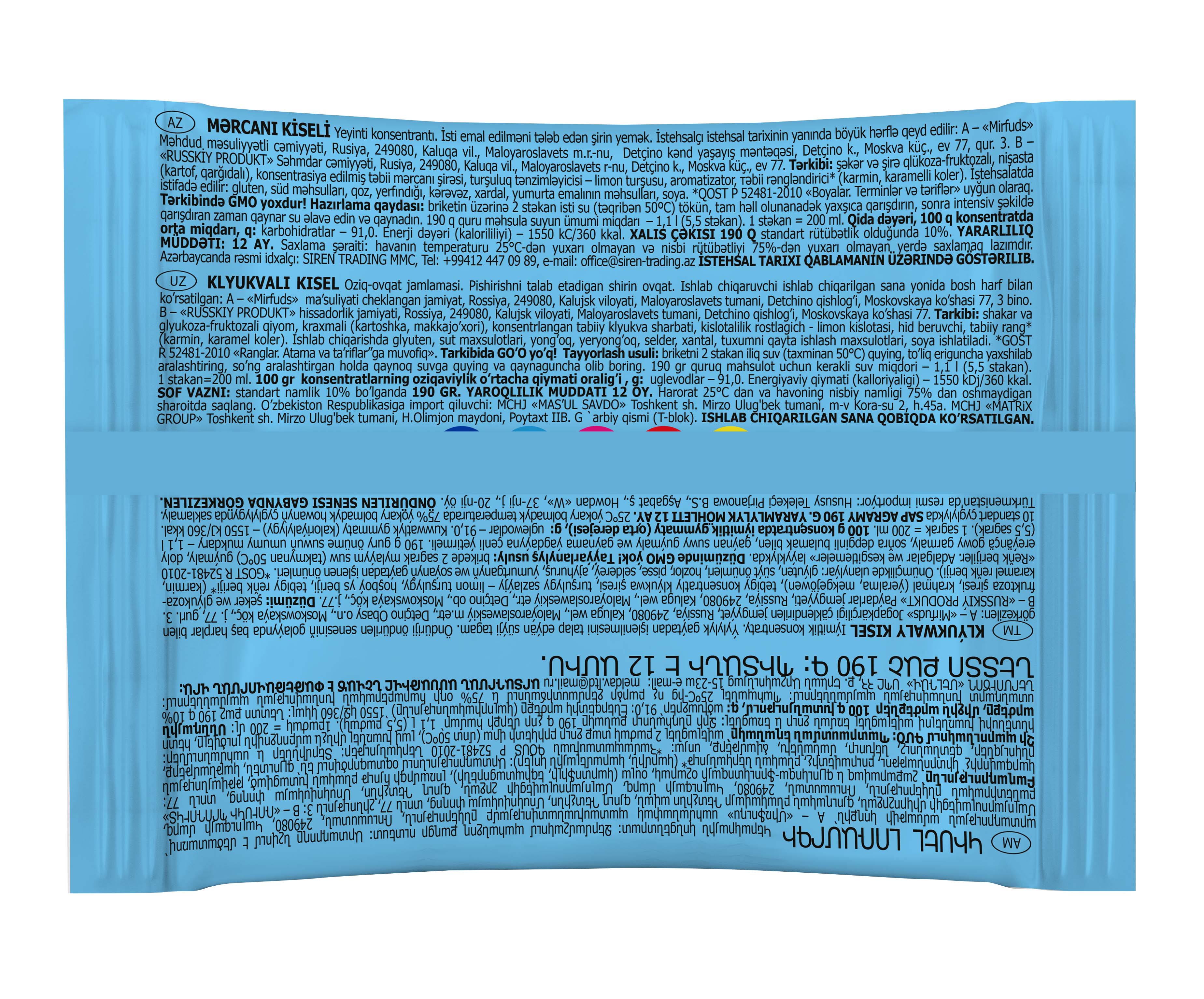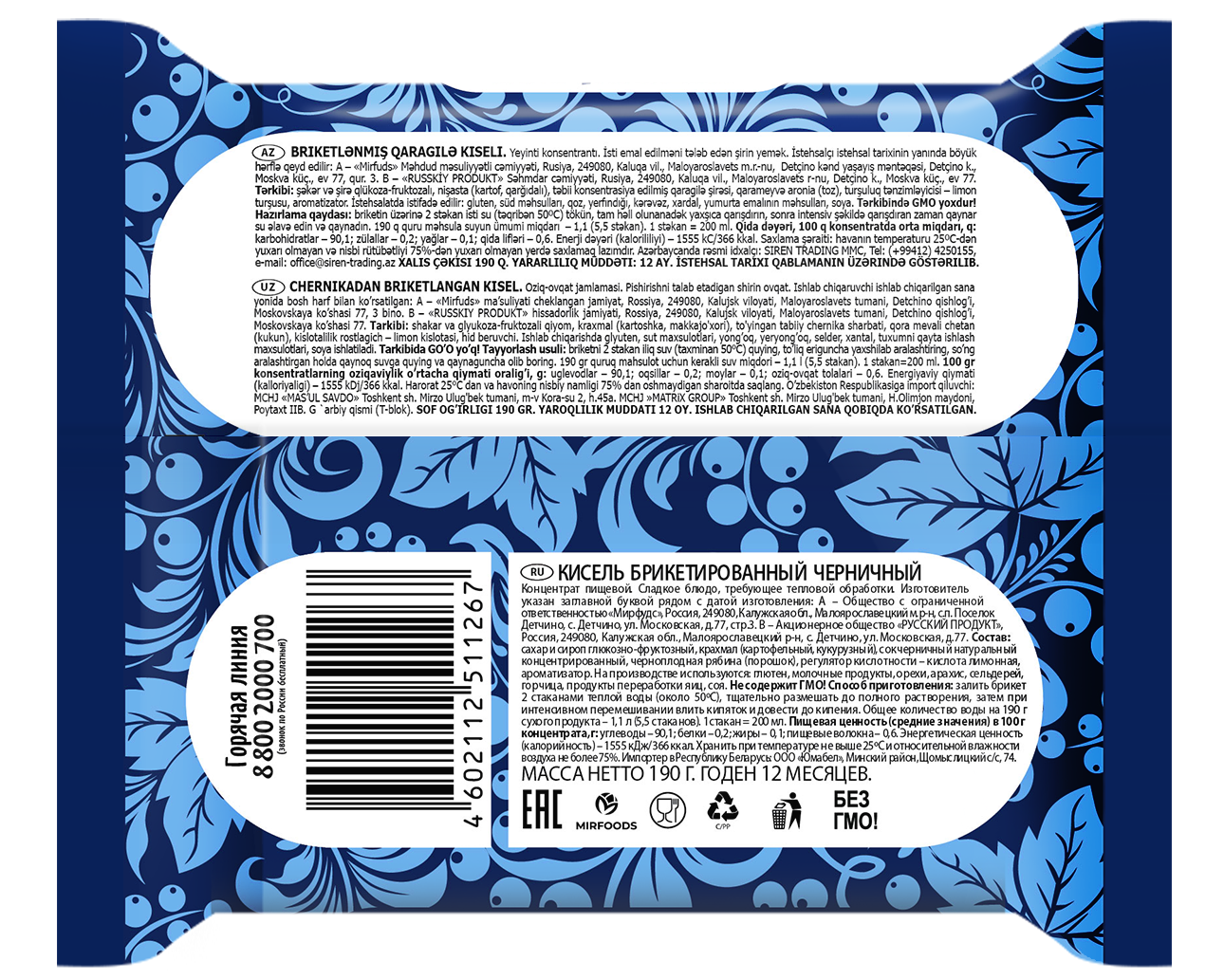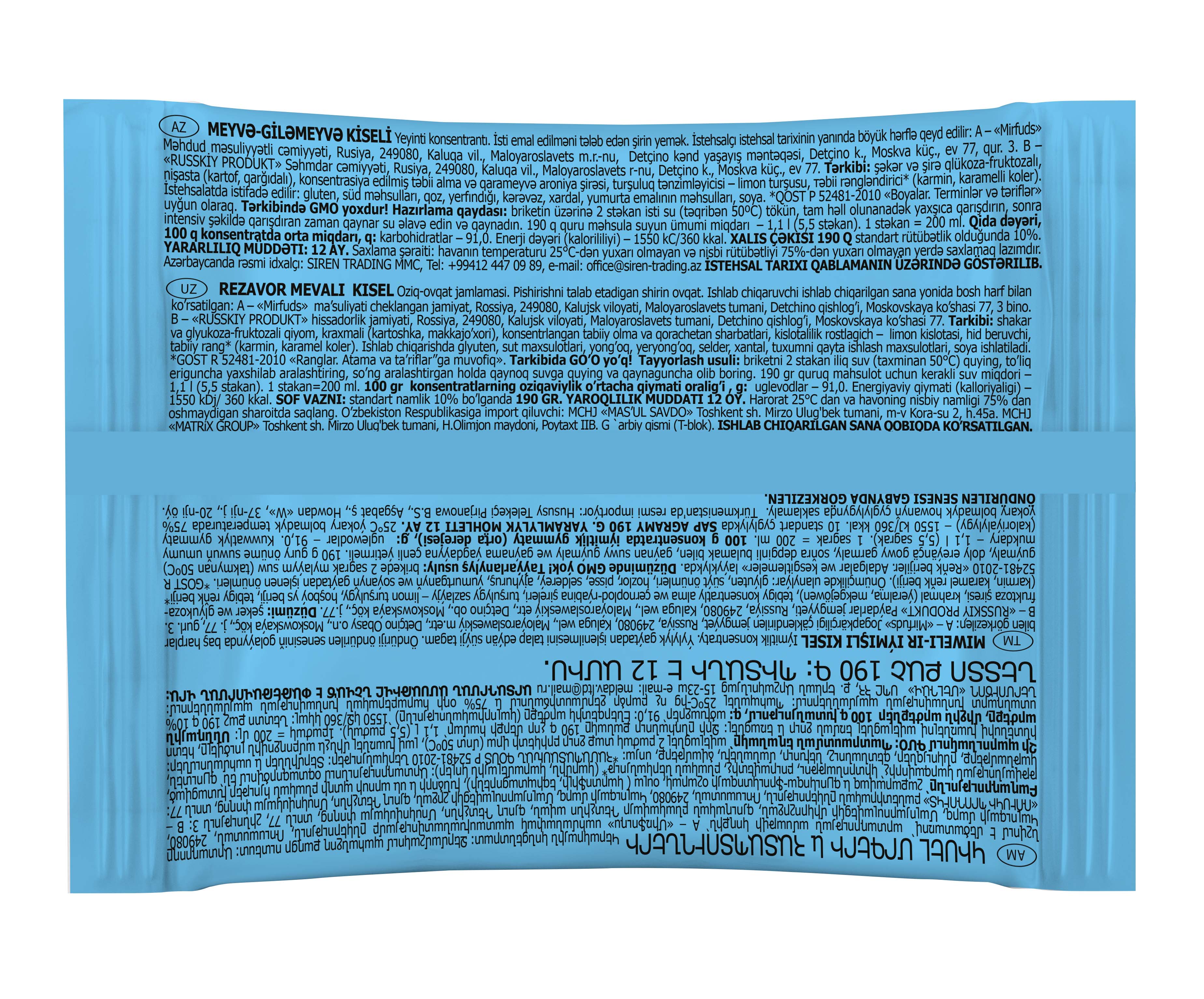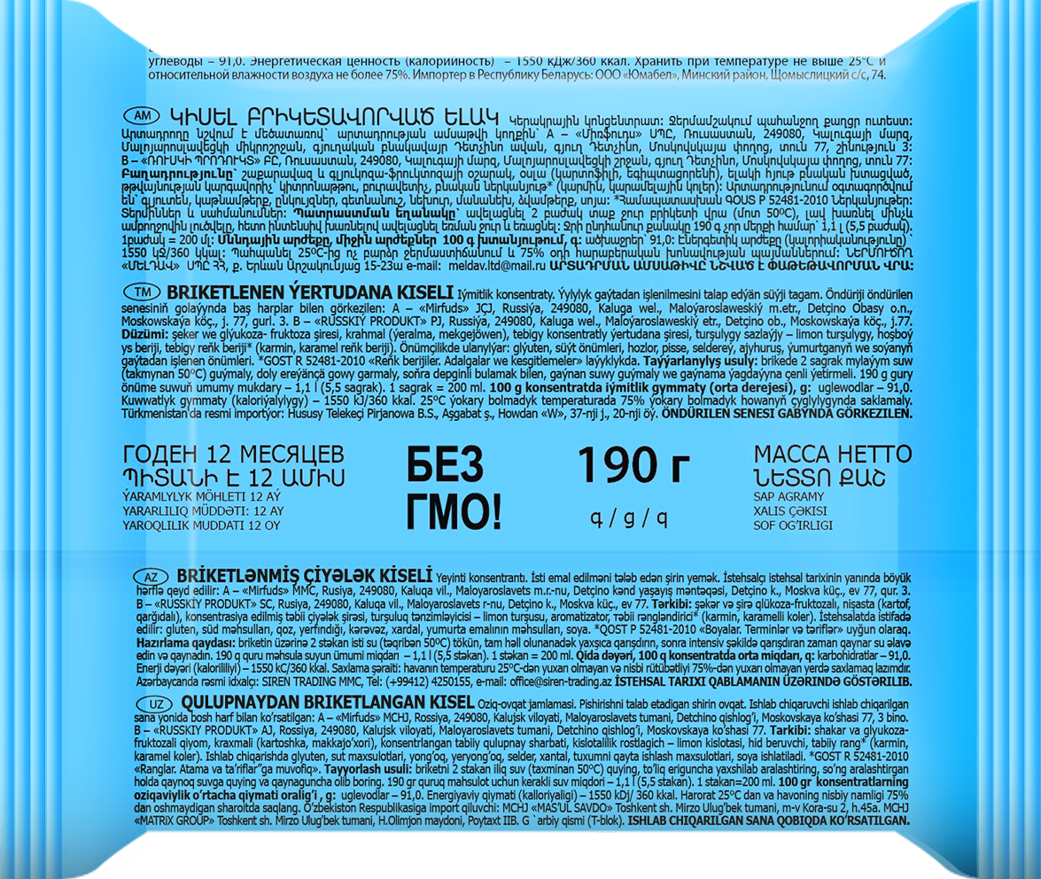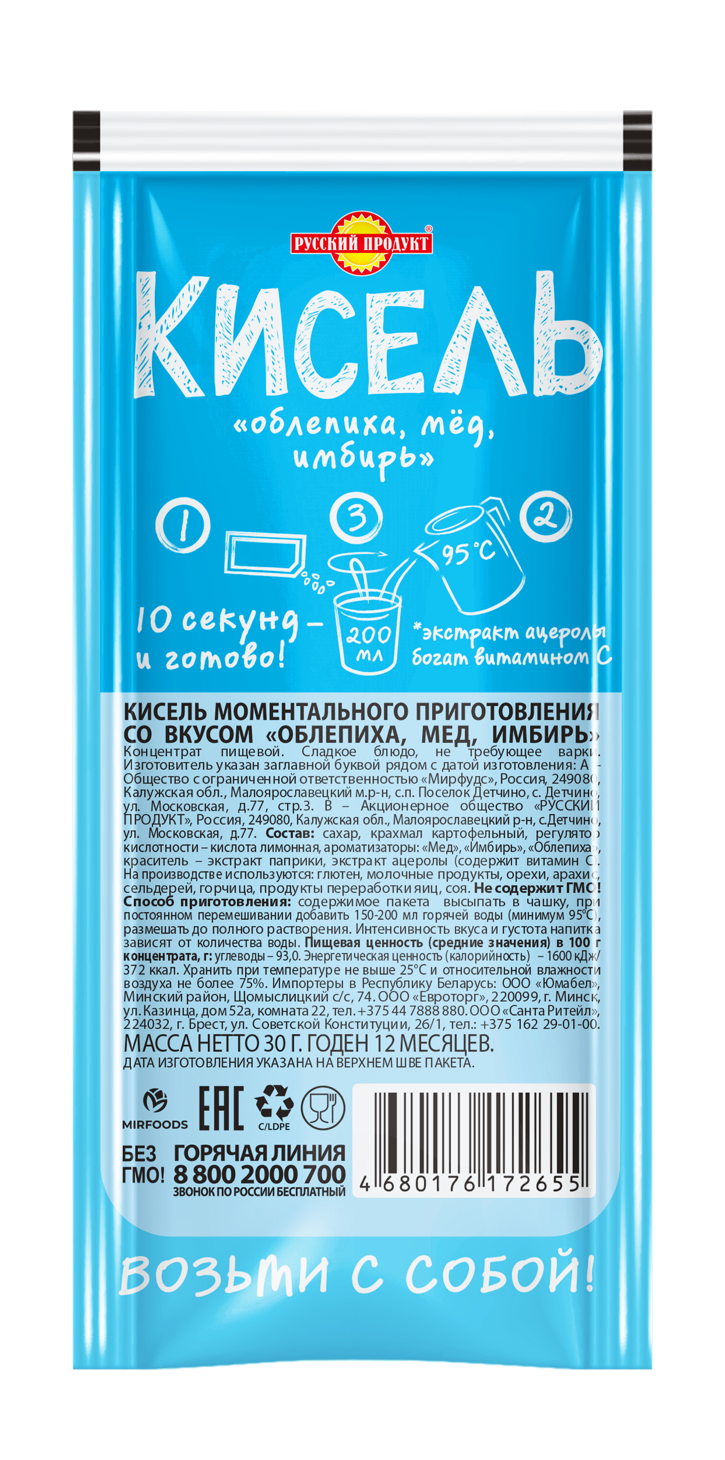 | Русский Продукт | Бакалея | Желе. | Желе быстрого пригот. "Вкус малины" 50 г/35 уп в ш/б (Мирфуд... | 2726954 | Пакет |  4602112102915 | 50 | 0,00019 | 120 | 10 | 160 |  |  | 20 | Для приготовления желе "РУССКИЙ ПРОДУКТ" со вкусом малины не... | Содержимое пакета высыпать в чашку, при постоянном перемешив... | сахар, желатин, регулятор кислотности (кислота лимонная), ар... | 3D Лицевая Оборотная Групповая уп | 390.0 | 9 | 0 | 89 | 12 |  | Хранить при температуре не выше 25°С и относительной влажнос... | 35 | шоу-бокс |  4602112209515 | 1,75 | 2,12 | 0,00648 | 125 | 305 | 170 | Слой | 840 | 24 | 7560 | 216 | 9 | 24 ш/б х 9 слоев | 1690 | ООО Мирфудс | 249080, Россия, Калужская обл, Малоярославецкий р-н, Детчино... | ЕАЭС N RU Д-RU.РА05.В.93558/25 | 14.07.2025 - 13.07.2030 | соответствует требованиям ТУ 10.89.19-002-50948224-2022 | Скачать | 2106909808 | 10.89.19.230 |