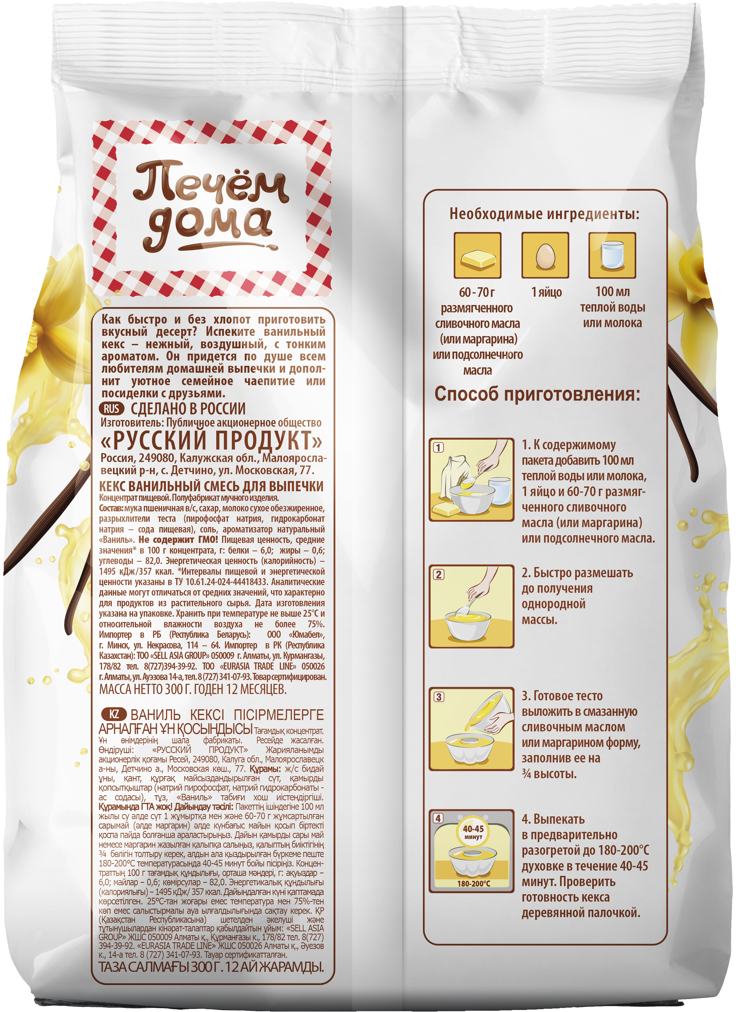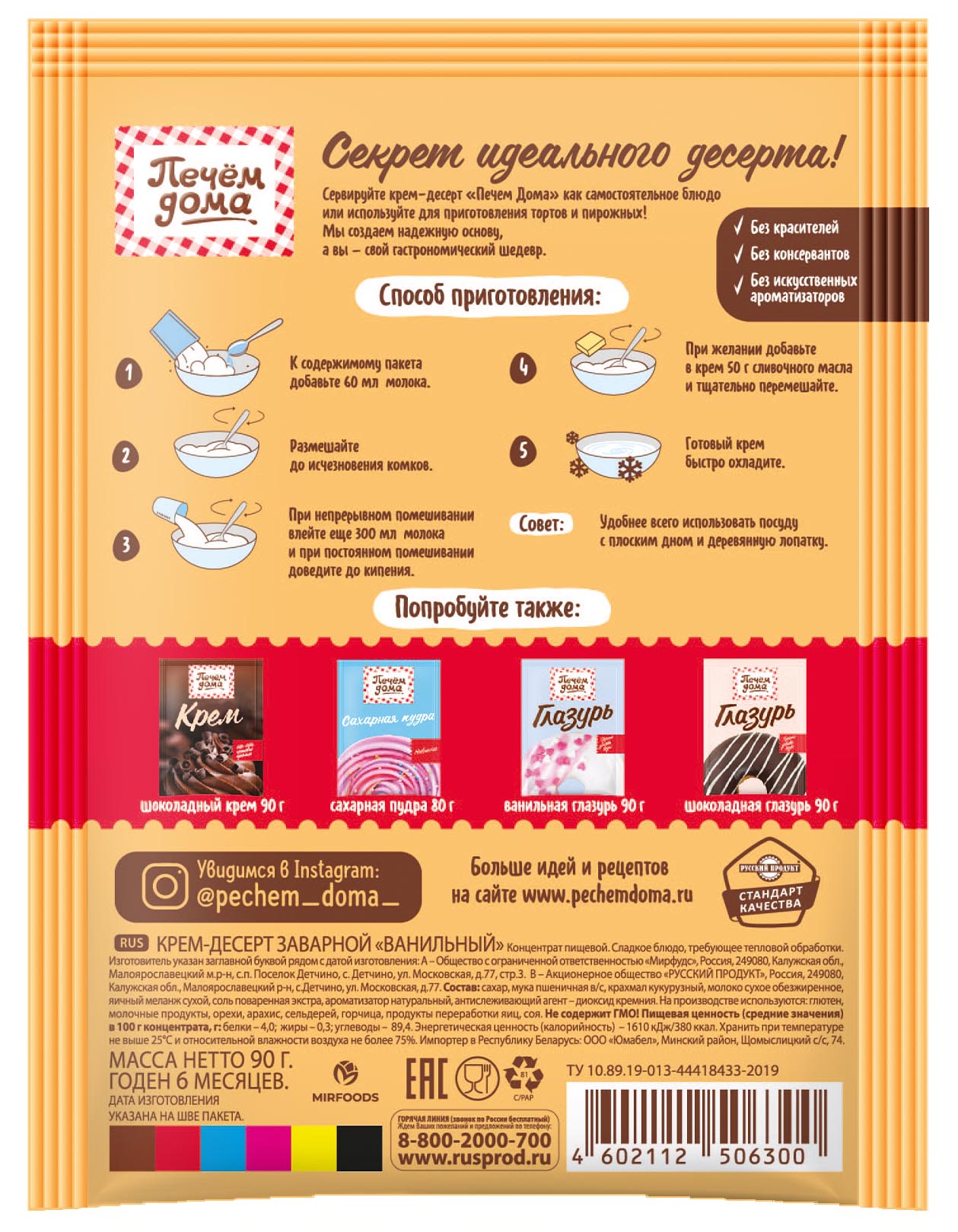 | Печем Дома | Бакалея | Кремы | Крем-десерт Печем дома "Ванильный" 90г/15 уп в ш/б (Мирфудс) | 2726846 | Пакет |  4602112506300 | 90 | 0,00027 | 120 | 14 | 160 |  |  | 20 | Сервируйте крем-десерт "Печем Дома" как самостоятельное блюд... | Способ приготовления: