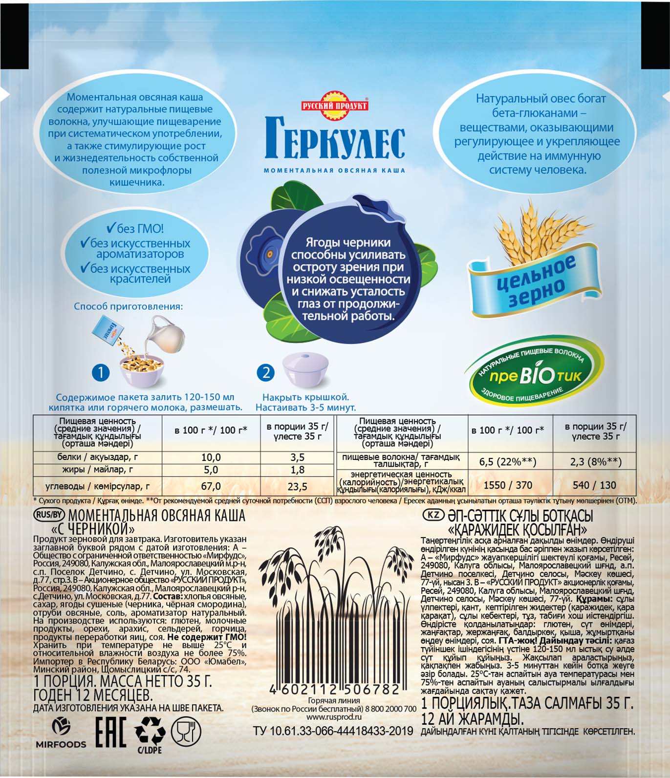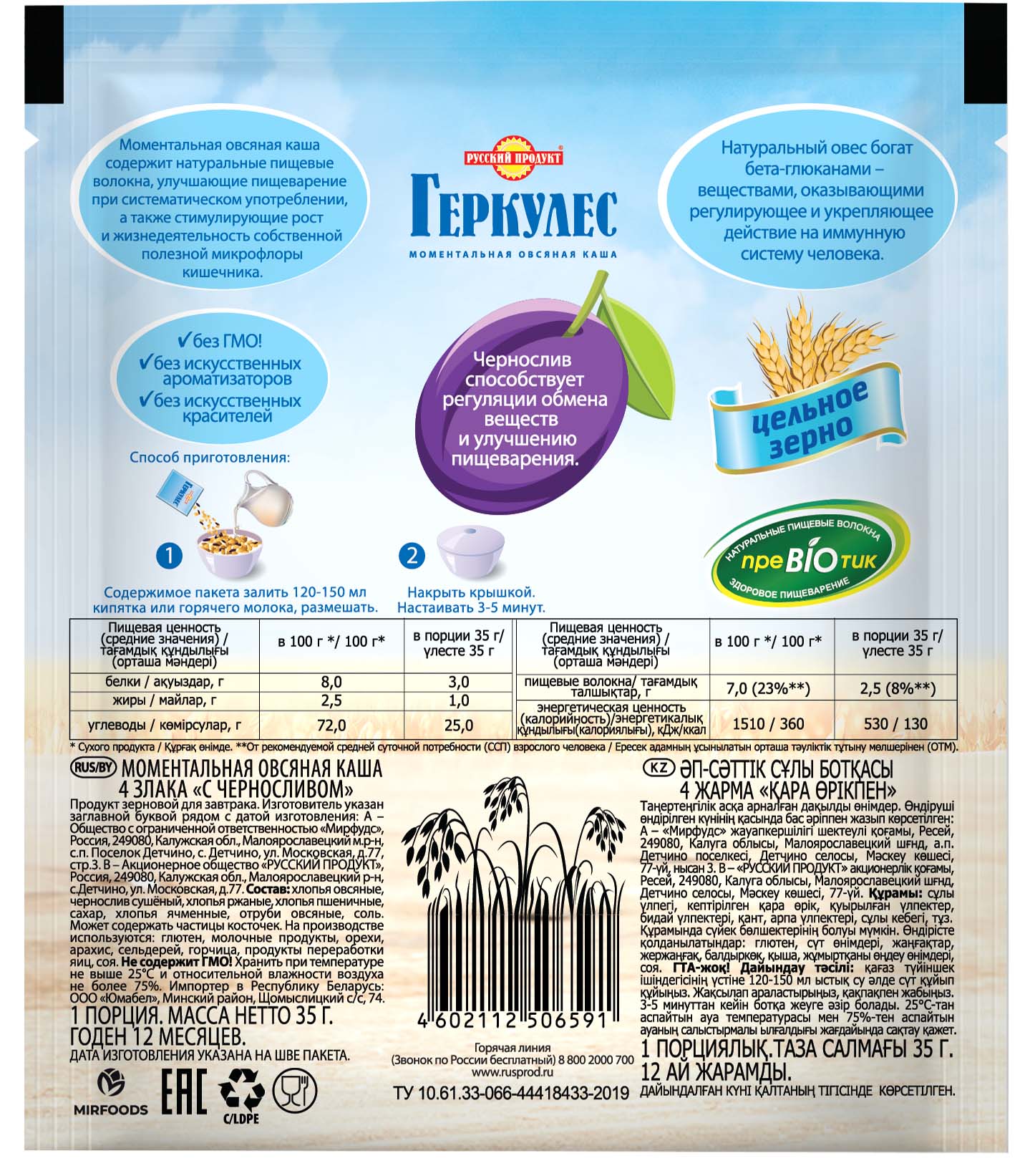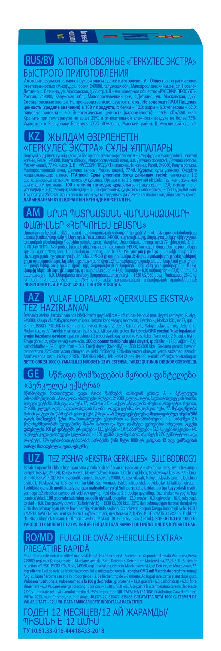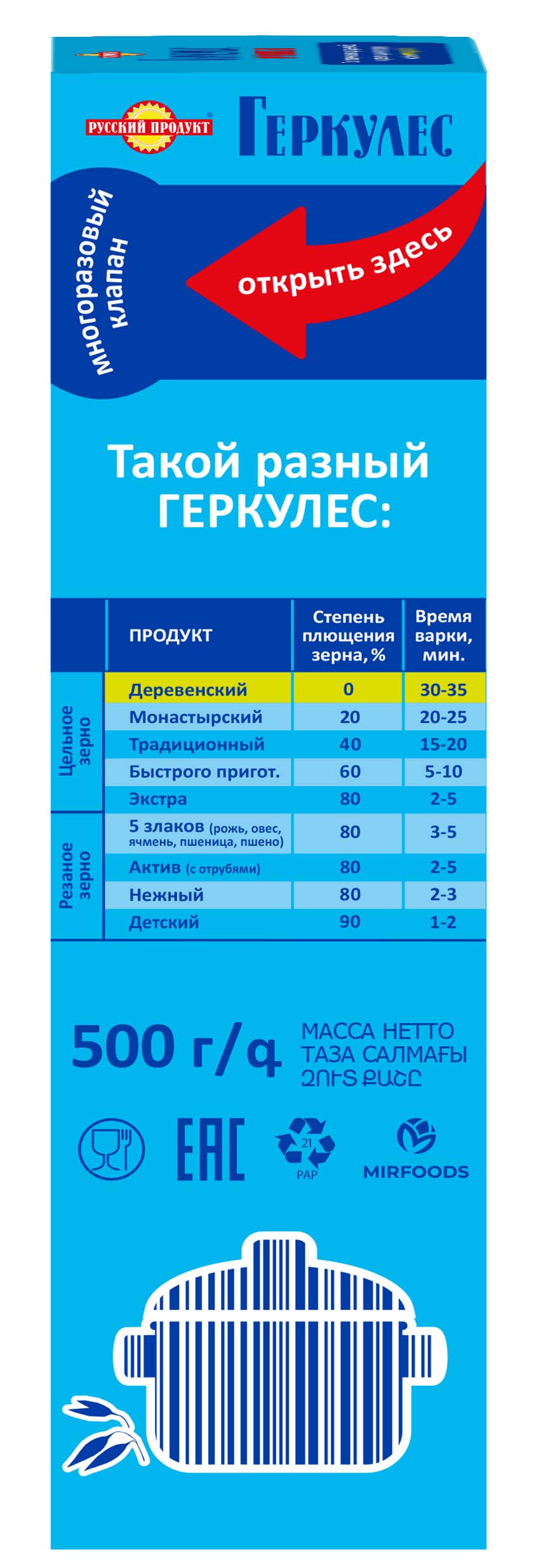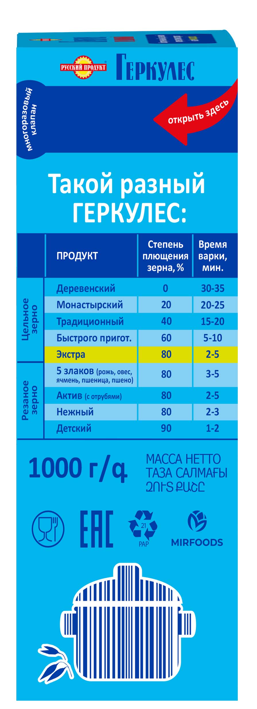 | Геркулес | Бакалея | Геркулес | Геркулес Экстра быстрого приготовления 1000 гр/1*4 шт в SRP ... | 2726740 | Коробка |  4602112510260 | 1000 | 0,00345 | 150 | 94 | 245 |  |  | 10 | Сколько хорошего может поместиться в одной ложке каши? Оказы... | Залейте хлопья горячим молоком или водой в пропорции 1:2. Ва... | Овсяные хлопья. | 3D Оборотная Боковая Л Боковая П Групповая уп | 360.0 | 12 | 6 | 62 | 12 |  | Хранить при температуре не выше 25°С и относительной влажнос... | 4 | шоу-бокс |  4602112510277 | 4 | 4,52 | 0,01558 | 160 | 391 | 249 | Паллета | 56 | 14 | 336 | 84 | 6 | 14 ш/б х 6 слоев | 1650 | ООО Мирфудс | 249080, Россия, Калужская обл, Малоярославецкий р-н, Детчино... | ЕАЭС N RU Д-RU.РА06.В.95069/25 | 11.08.2025 - 10.08.2030 | соответствует требованиям ТУ 10.61.33-016-44418433-2018 | Скачать | 1104129000 | 10.61.33.110 |