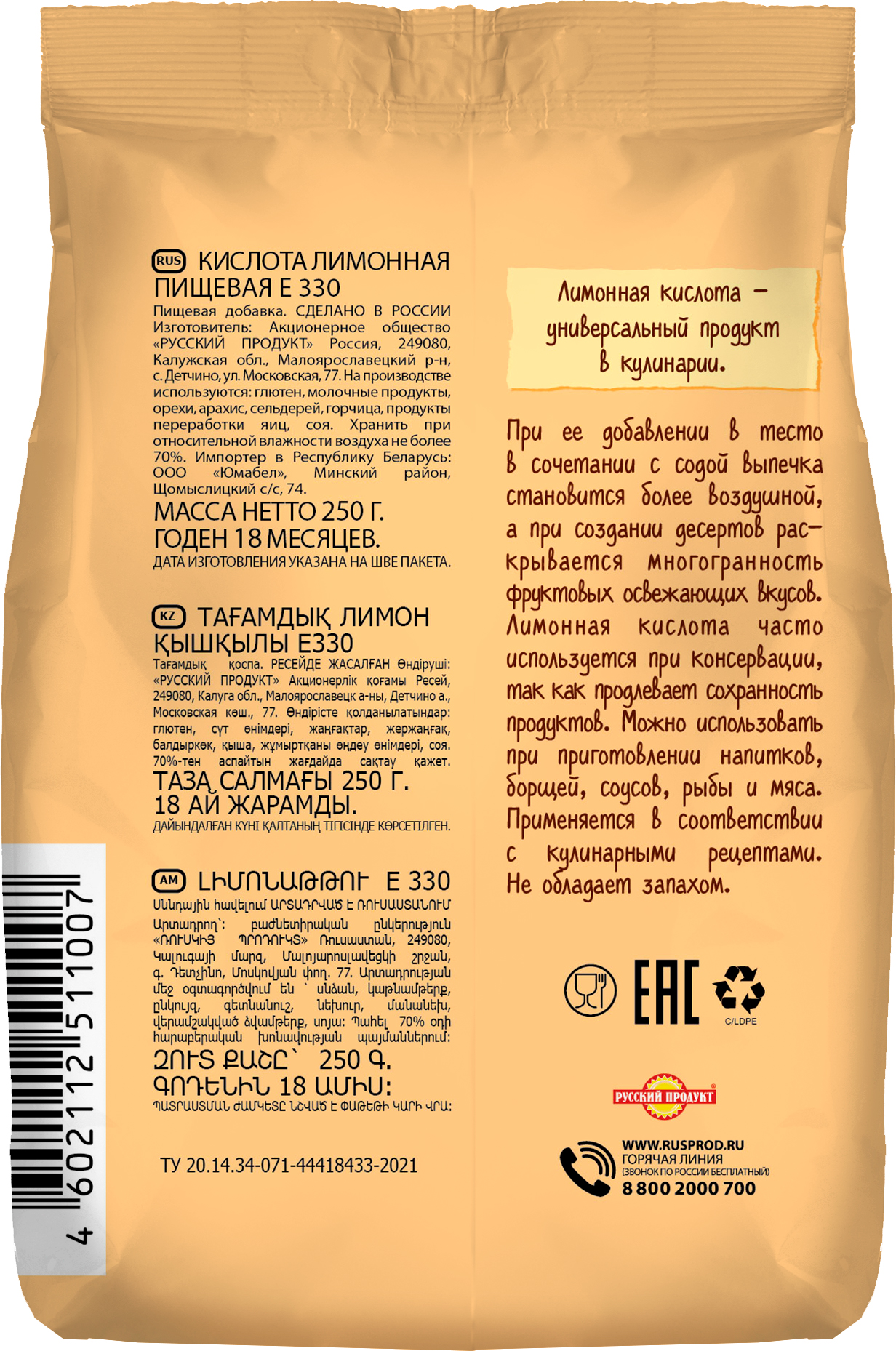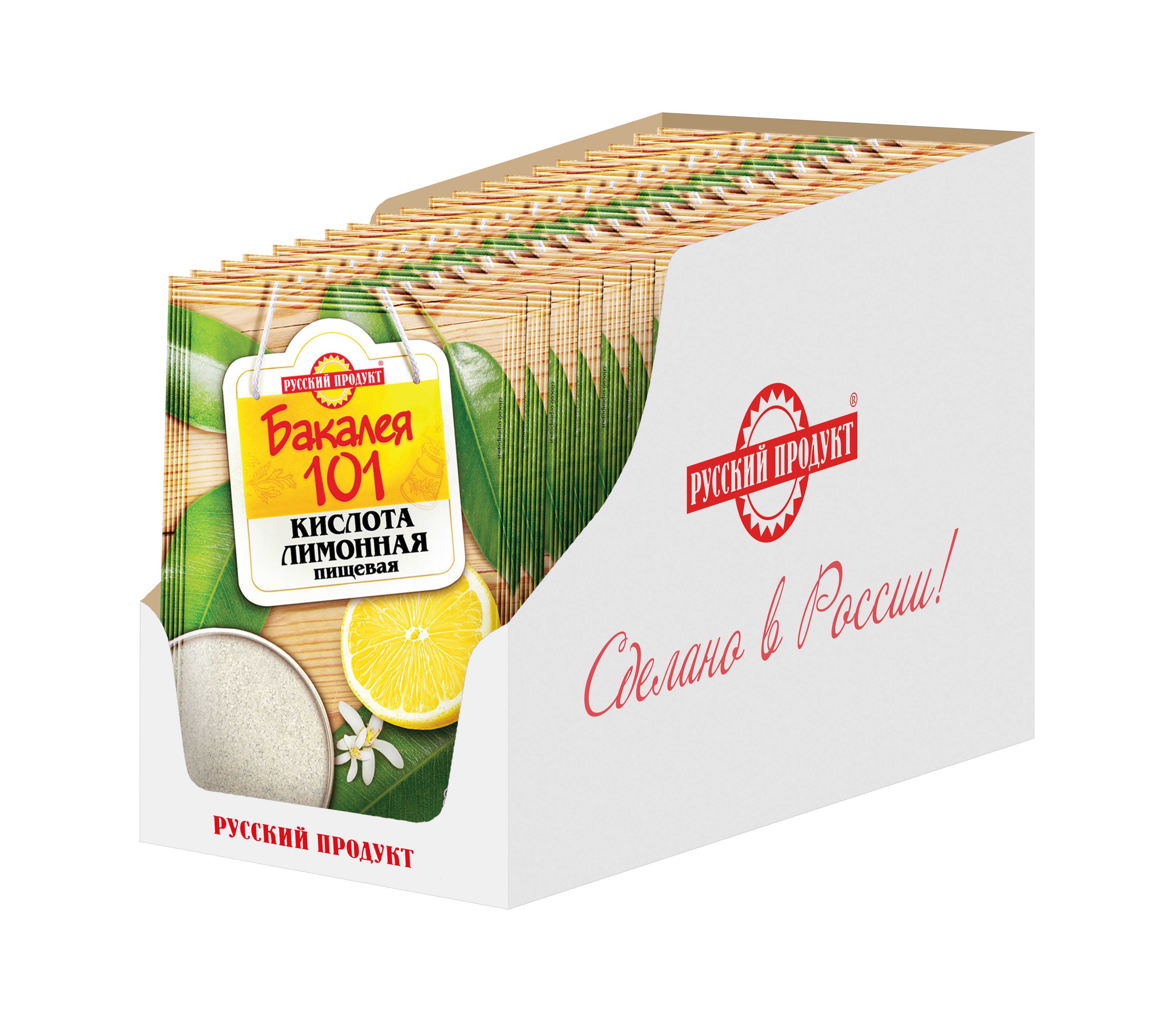 | Бакалея 101 | Бакалея | Лимонная кислота | Лимонная кислота Бакалея 101 250 г/10 уп в ш/б (Мирфудс) | 2726605 | Пакет-подушка |  4602112511007 | 250 | 0,00064 | 115 | 40 | 140 |  |  | 20 | Лимонная кислота - универсальный продукт в кулинарии. При ее... | Применяется в соответствии с кулинарными рецептами. | Кислота лимонная пищевая. | Лицевая Оборотная Групповая уп | 0.0 | 0 | 0 | 0 | 18 |  | Хранить при относительной влажности воздуха не более 70% | 10 | шоу-бокс |  4602112511014 | 2,5 | 2,64 | 0,00683 | 124 | 388 | 142 | Слой | 180 | 18 | 1800 | 180 | 10 | 18 ш/б х 10 слоев | 1590 | ООО Мирфудс | 249080, Россия, Калужская обл, Малоярославецкий р-н, Детчино... | ЕАЭС N RU Д-RU.РА04.В.45250/25 | 19.05.2025 - 18.05.2030 | соответствует требованиям ТУ20.14.34-071-44418433-2021 | Скачать | 2918140000 | 20.14.34.231 |