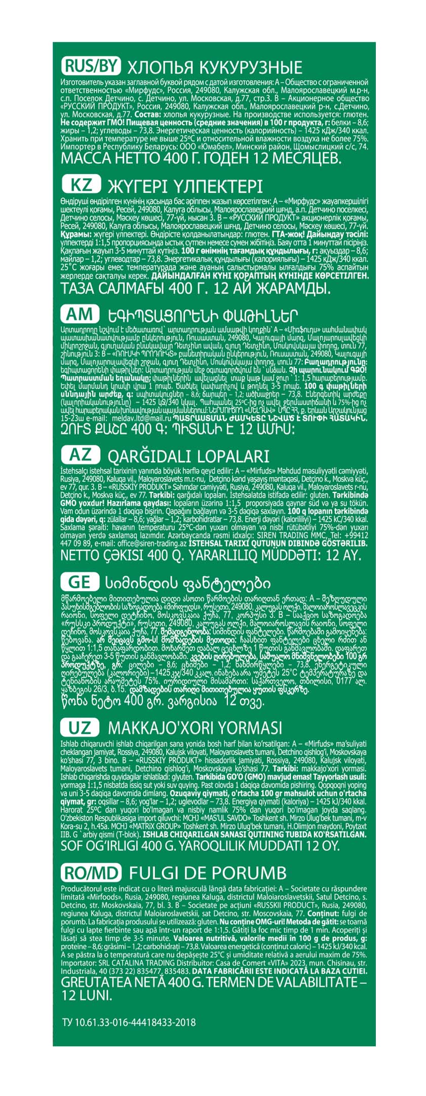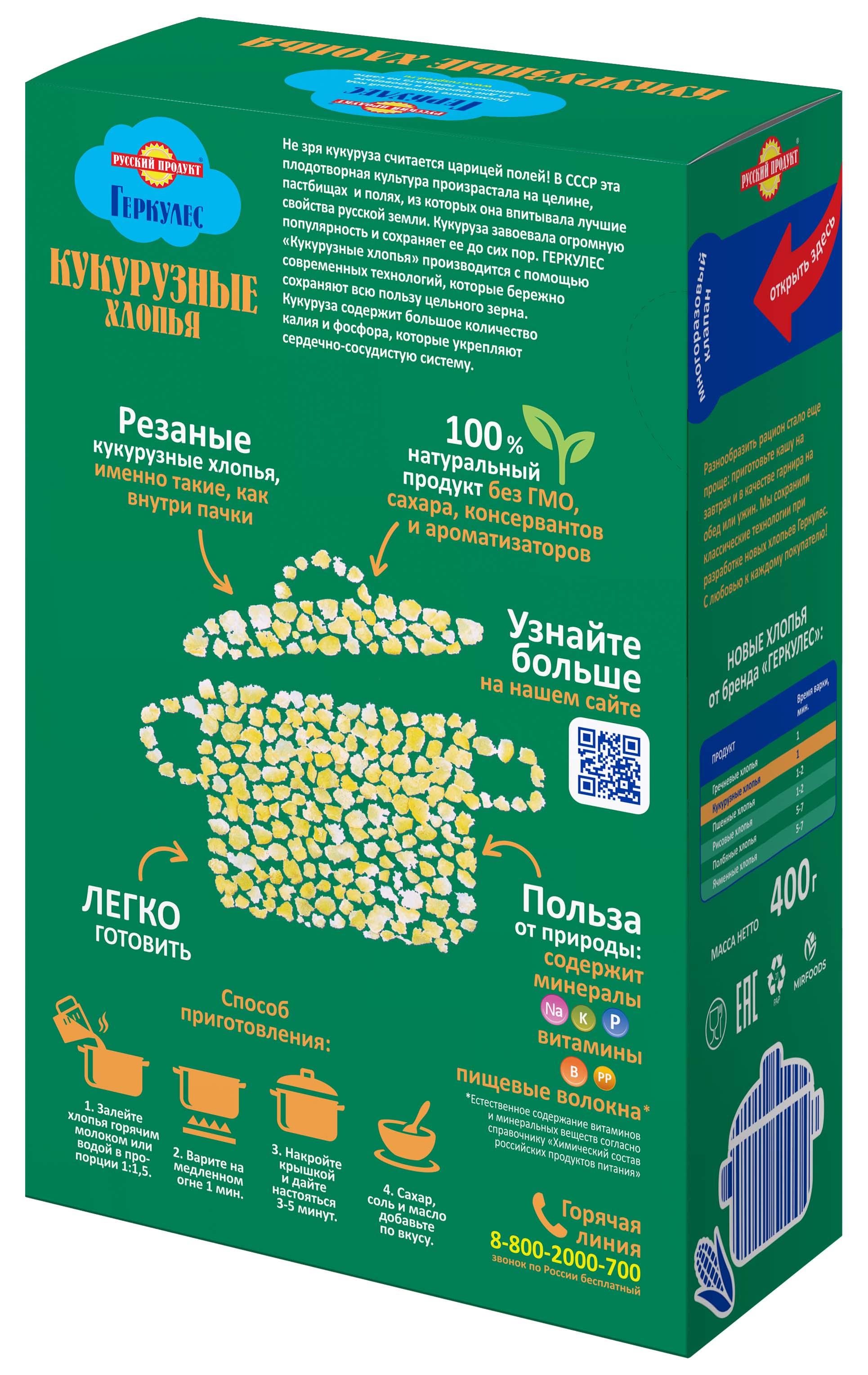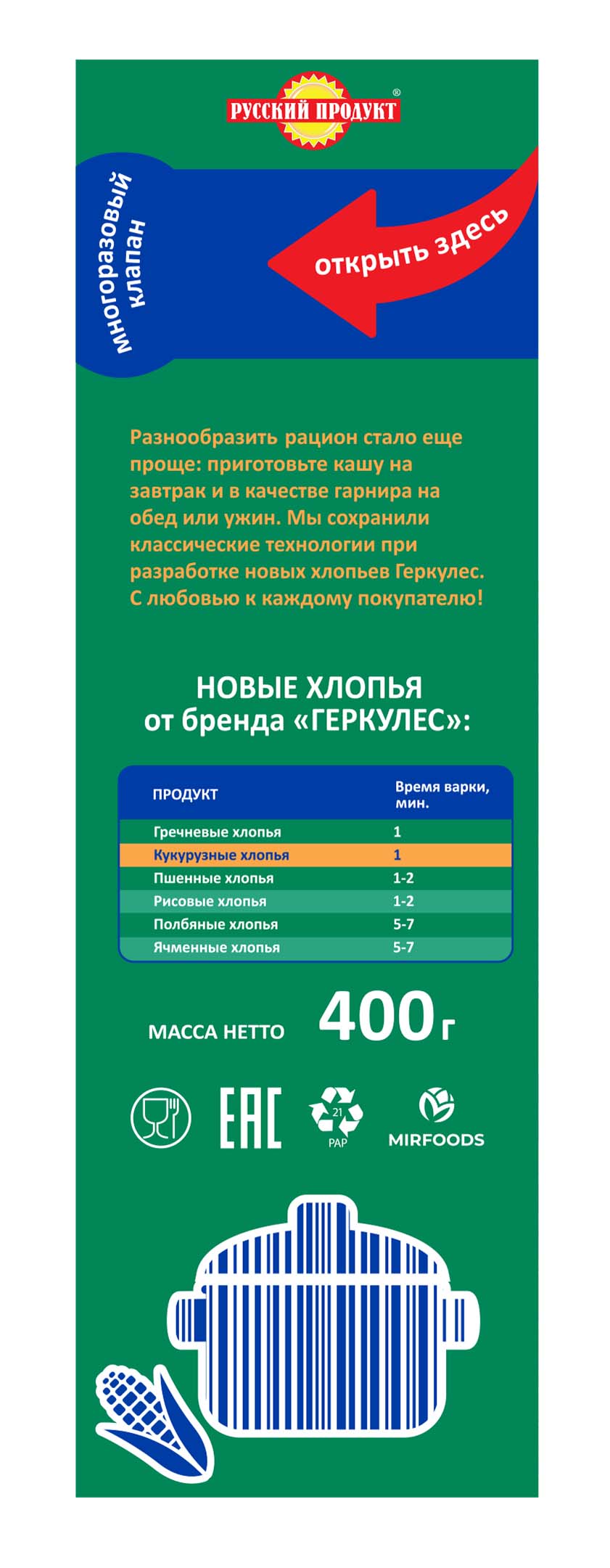 | Геркулес | Бакалея | Геркулес | Геркулес Хлопья Кукурузные 400г/1*6 шт в SRP ш/б (Мирфудс) | 2726746 | Коробка |  4602112510048 | 400 | 0,00144 | 120 | 63 | 190 |  |  | 10 | Не зря кукуруза считается царицей полей! В СССР эта плодотво... | Залейте хлопья горячим молоком или водой в пропорции 1:1,5. ... | Хлопья кукурузные. | 3D Лицевая Оборотная Боковая Л Боковая П Групповая уп | 340.0 | 8.6 | 1.2 | 73.8 | 12 |  | Хранить при температуре не выше 25°С и относительной влажнос... | 6 | шоу-бокс |  4602112510055 | 2,4 | 2,761 | 0,00999 | 130 | 396 | 194 | Слой | 108 | 18 | 864 | 144 | 8 | 18 ш/б х 8 слоев | 1710 | ООО Мирфудс | 249080, Россия, Калужская обл, Малоярославецкий р-н, Детчино... | ЕАЭС N RU Д-RU.РА06.В.95069/25 | 11.08.2025 - 10.08.2030 | соответствует требованиям ТУ 10.61.33-016-44418433-2018 | Скачать | 1104195000 | 10.61.33.110 |