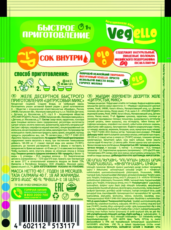 | Русский Продукт | Бакалея | Желе. | Желе десертное быстрого приготовления "Цитрусовый микс" 40г/... | 2726900 | Пакет |  4602112513117 | 40 | 0,00019 | 120 | 10 | 160 |  |  | 20 | Желе с приятным цитрусовым ароматом за счет натуральных соко... | содержимое пакета высыпать в чашку, при постоянном помешиван... | сахар-песок, каррагинан, псиллиум мука (пищевые волокна семя... | 3D Лицевая Оборотная Групповая уп | 370.0 | 0 | 0 | 91 | 18 |  | Хранить при температуре не выше 25°С и относительной влажнос... | 25 | шоу-бокс |  4602112513124 | 1 | 1,2 | 0,00648 | 125 | 305 | 170 | Слой | 600 | 24 | 5400 | 216 | 9 | 24 ш/б х 9 слоев | 1690 | ООО Мирфудс | 249080, Россия, Калужская обл, Малоярославецкий р-н, Детчино... | ЕАЭС N RU Д-RU.РА05.В.93558/25 | 14.07.2025 - 13.07.2030 | соответствует требованиям ТУ 10.89.19-002-50948224-2022 | Скачать | 2106909808 | 10.89.19.230 |