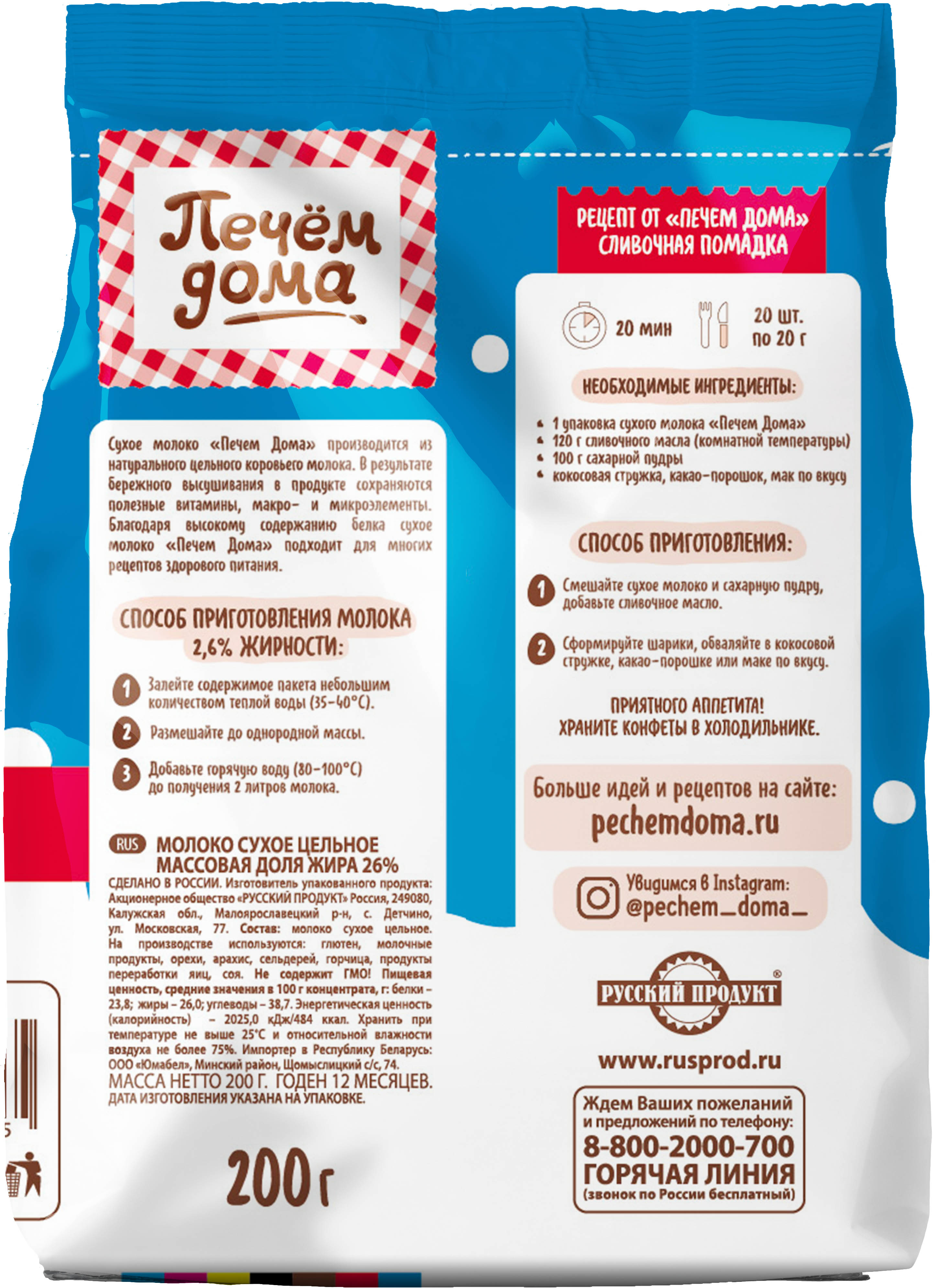 | Печем Дома | Бакалея | Сухие сливки | Сухое молоко Печем дома ГОСТ 200 г/ 8 уп в ш/б (Мирфудс) | 2726521 | Пакет-подушка |  4602112510765 | 200 | 0,001 | 125 | 50 | 160 |  |  | 10 | Сухое молоко "Печем Дома" призводится из натурального цельно... | Залейте содержимое пакета небольшим количеством теплой  воды... | Молоко сухое цельное | 3D Лицевая Оборотная Боковая Л Боковая П Групповая уп | 484.0 | 23.8 | 26 | 38.7 | 12 |  | Хранить при температуре не выше 25°С и относительной влажнос... | 8 | шоу-бокс |  4602112510772 | 1,6 | 1,85 | 0,00867 | 132 | 398 | 165 | Слой | 144 | 18 | 1440 | 180 | 10 | 18 ш/б х 10 слоев | 1800 | ООО Мирфудс | 249080, Россия, Калужская обл, Малоярославецкий р-н, Детчино... | ЕАЭС N RU Д-RU.РА05.В.20669/25 | 18.06.2025 - 17.06.2030 | соответствует требованиям ГОСТ 33629-2015 | Скачать | 0402211100 | 10.51.22.112 |