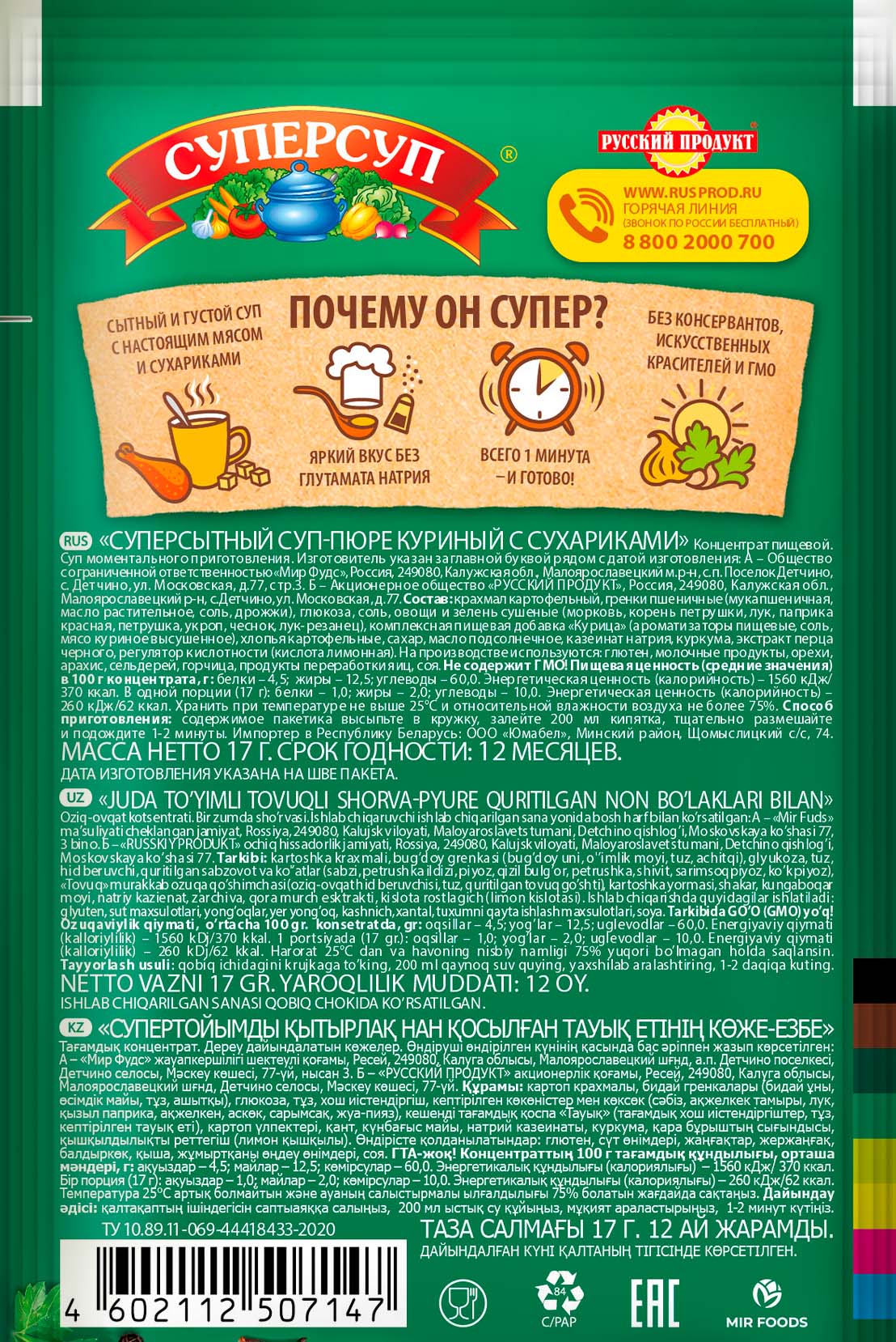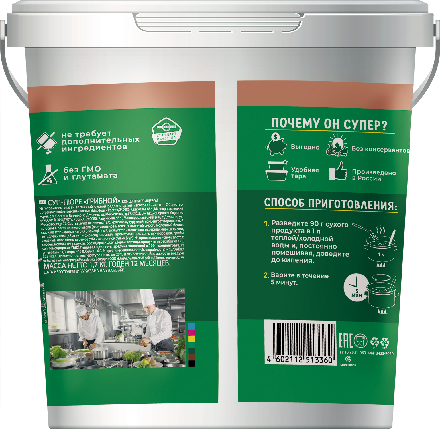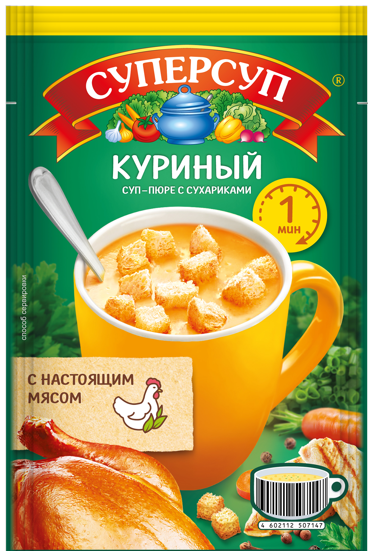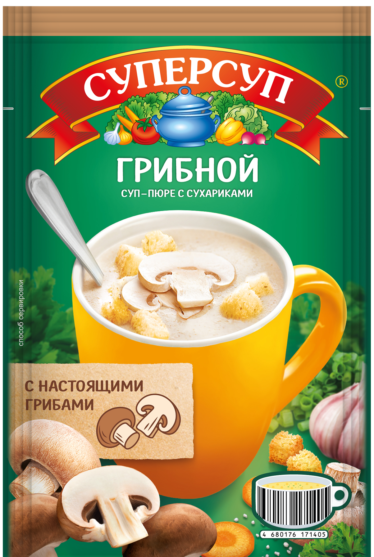 | Супершеф | HoReCa | Супы концентраты | Суп-пюре "Грибной" 1700г/4 уп в кор | 2700029 | ведро |  4602112513360 | 1700 | 0,007 | 200 | 200 | 175 |  |  | 10 | Ваш профессиональный помощник: