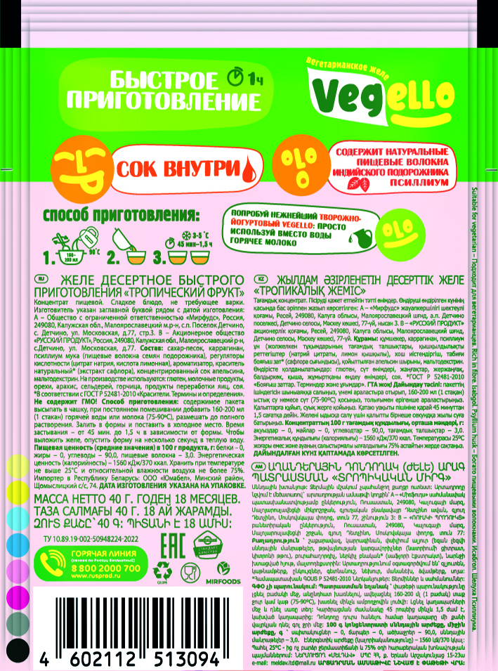 | Русский Продукт | Бакалея | Желе. | Желе десертное быстрого приготовления "Тропический фрукт" 40... | 2726899 | Пакет |  4602112513094 | 40 | 0,00019 | 120 | 10 | 160 |  |  | 20 | Желе с приятным ароматом тропических фруктов за счет натурал... | содержимое пакета высыпать в чашку, при постоянном помешиван... | сахар-песок, каррагинан, псиллиум мука (пищевые волокна семя... | 3D Лицевая Оборотная Боковая Л Групповая уп | 370.0 | 0 | 0 | 90 | 18 |  | Хранить при температуре не выше 25°С и относительной влажнос... | 25 | шоу-бокс |  4602112513100 | 1 | 1,2 | 0,00648 | 125 | 305 | 170 | Слой | 600 | 24 | 5400 | 216 | 9 | 24 ш/б х 9 слоев | 1690 | ООО Мирфудс | 249080, Россия, Калужская обл, Малоярославецкий р-н, Детчино... | ЕАЭС N RU Д-RU.РА05.В.93558/25 | 14.07.2025 - 13.07.2030 | соответствует требованиям ТУ 10.89.19-002-50948224-2022 | Скачать | 2106909808 | 10.89.19.230 |