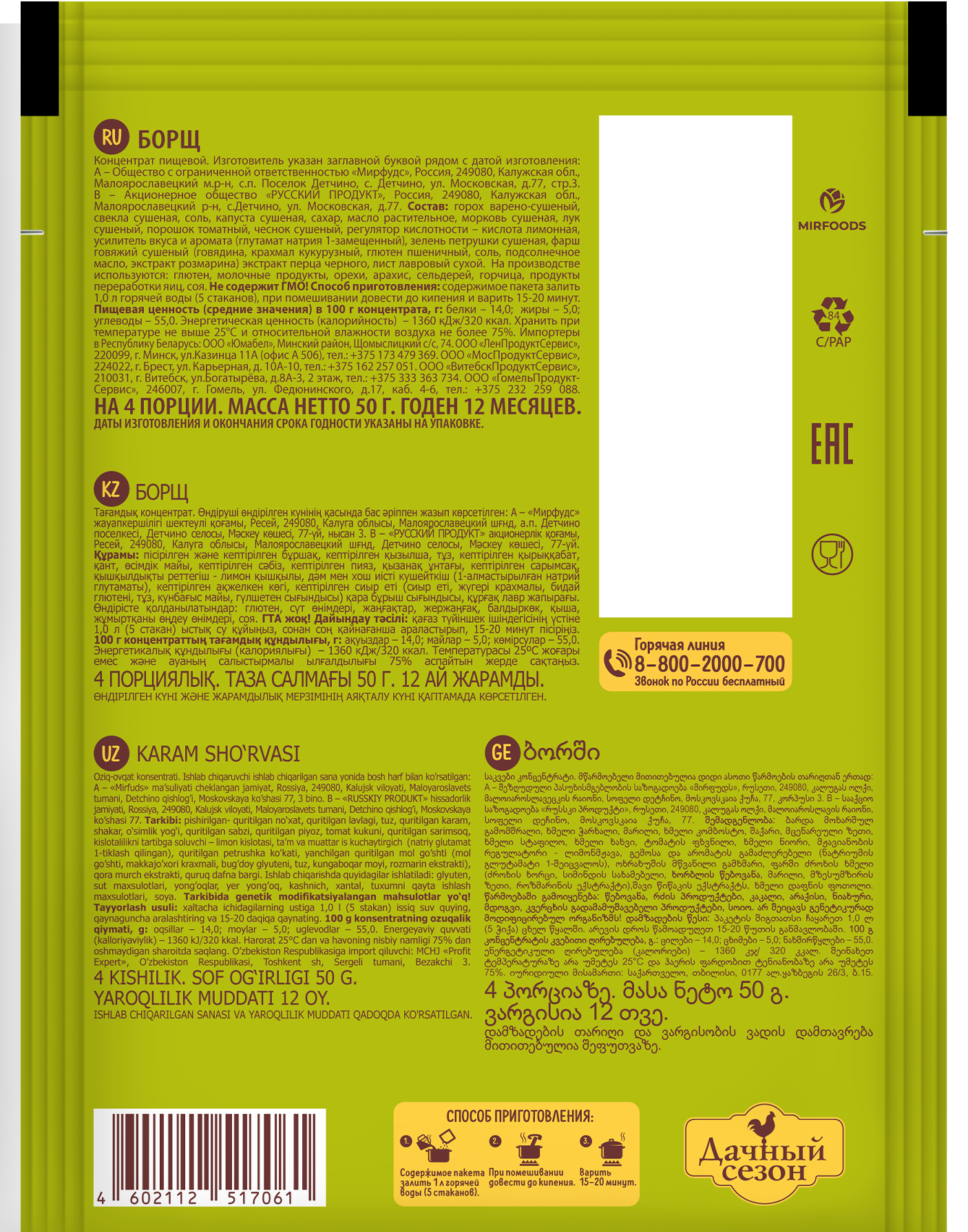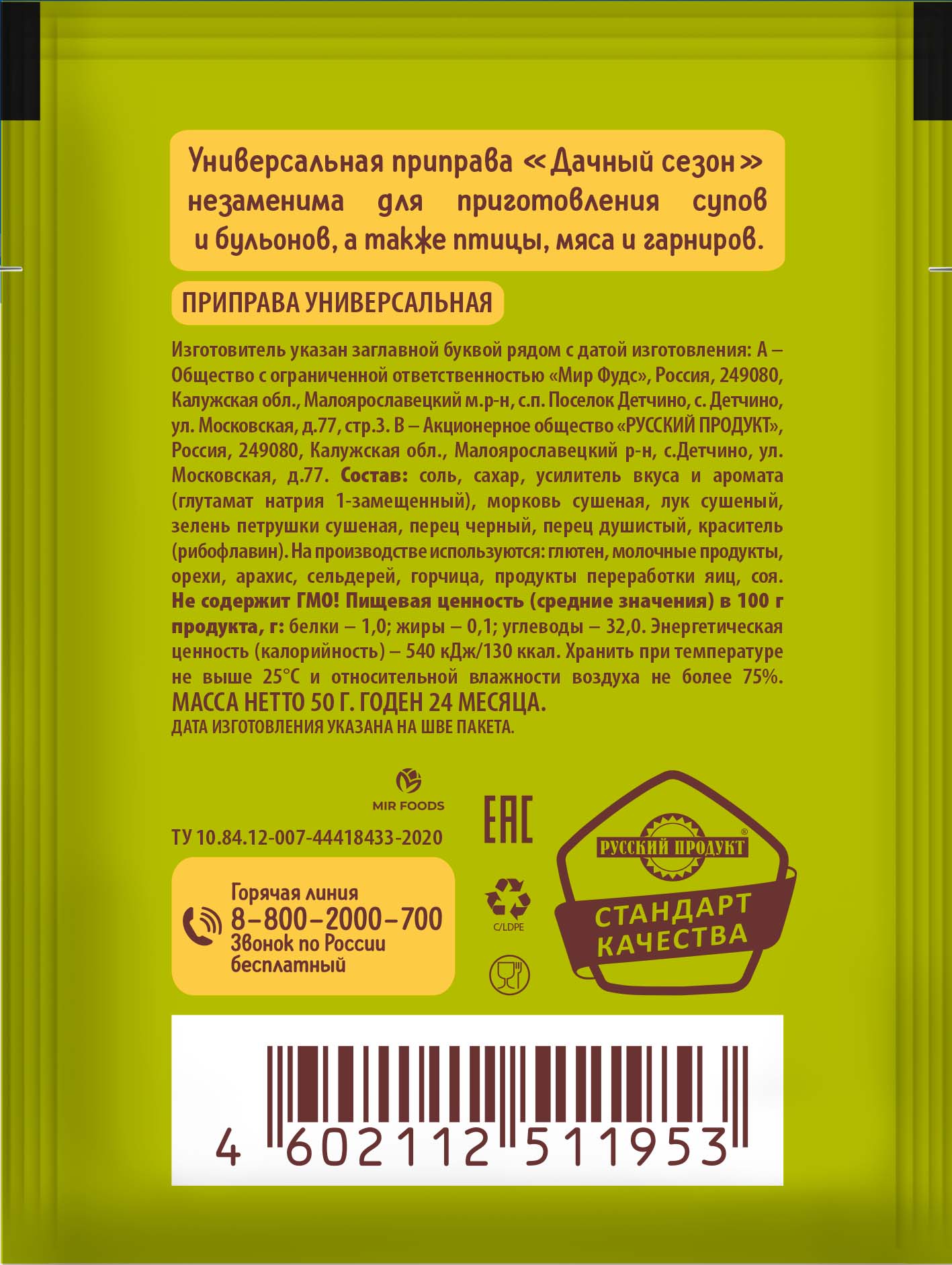 | Дачный Сезон | Бакалея | Идеальная приправа Дачный Сезон | Универсальная приправа "Дачный сезон" 50г /30 уп в ш/б (Мирф... | 2726601 | 3-х шовный пакет |  4602112511953 | 50 | 0,0001 | 120 | 5 | 160 |  |  | 20 | Универсальная приправа "Дачный сезон" незаменима для пригото... | Готовый продукт | соль, сахар, усилитель вкуса и аромата (глутамат натрия 1-за... | Лицевая Оборотная Групповая уп | 130.0 | 1 | 0.1 | 32 | 24 |  | Хранить при температуре не выше 25°С и относительной влажнос... | 30 | шоу-бокс |  4602112511960 | 1,5 | 1,79 | 0,00663 | 130 | 300 | 170 | Слой | 720 | 24 | 6480 | 216 | 9 | 24 ш/б х 9 слоев | 1680 | ООО Мирфудс | 249080, Россия, Калужская обл, Малоярославецкий р-н, Детчино... | ЕАЭС N RU Д-RU.РА02.В.16556/23 | 02.03.2023 - 01.03.2026 | соответствует требованиям ТУ 10.84.12-007-44418433-2020 | Скачать | 2103909009 | 10.84.12.150 |