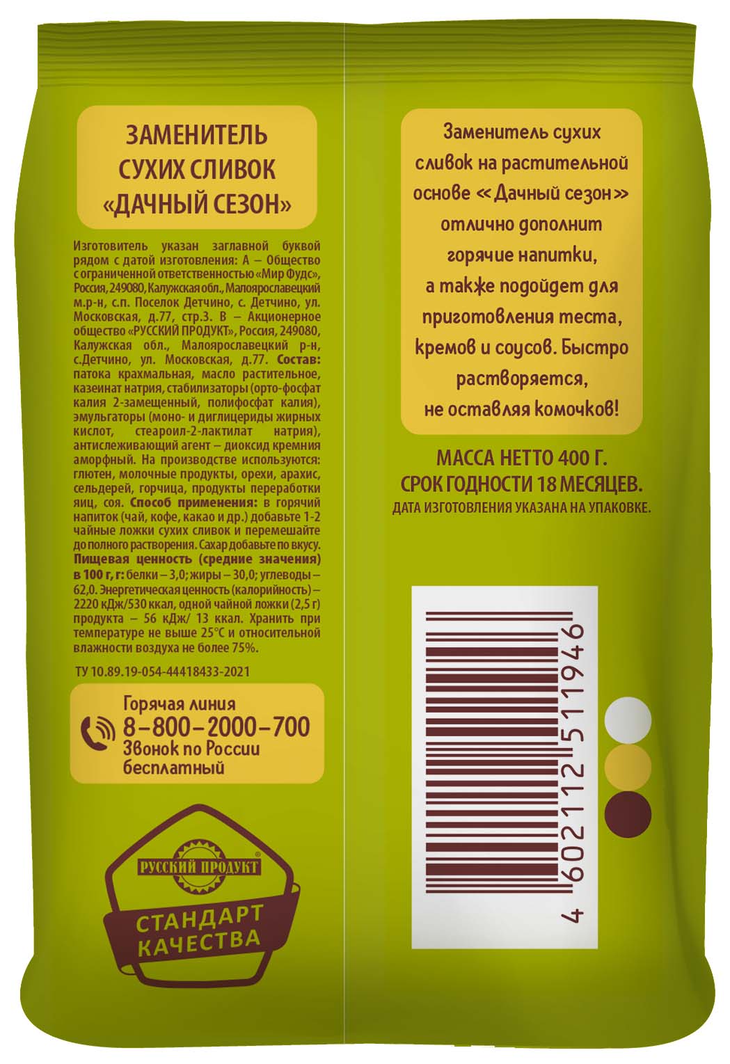 | Дачный Сезон | Бакалея | Сухие сливки Дачный Сезон | Сливок сухих заменитель "Дачный Сезон" 400г/14 шт в кор (Мир... | 2726615 | пакет |  4602112511946 | 400 | 0,00076 | 120 | 45 | 140 |  |  | 20 | Сухие сливки на растительной основе "Дачный сезон" являются ... | В горячий напиток (чай, кофе, какао и др.) добавьте 1-2 чайн... | Патока крахмальная, масло растительное, казеинат натрия, ста... | 3D Оборотная Групповая уп | 530.0 | 3 | 30 | 62 | 18 |  | Хранить при температуре не выше 25°С и относительной влажнос... | 14 | шоу-бокс |  4602112512080 | 5,6 | 5,81 | 0,01796 | 293 | 388 | 158 | Слой | 112 | 8 | 1120 | 80 | 10 | 8 ш/б х 10 слоев | 1730 | ООО Мирфудс | 249080, Россия, Калужская обл, Малоярославецкий р-н, Детчино... |  |  |  |  | 2106909809 | 10.89.19.290 |