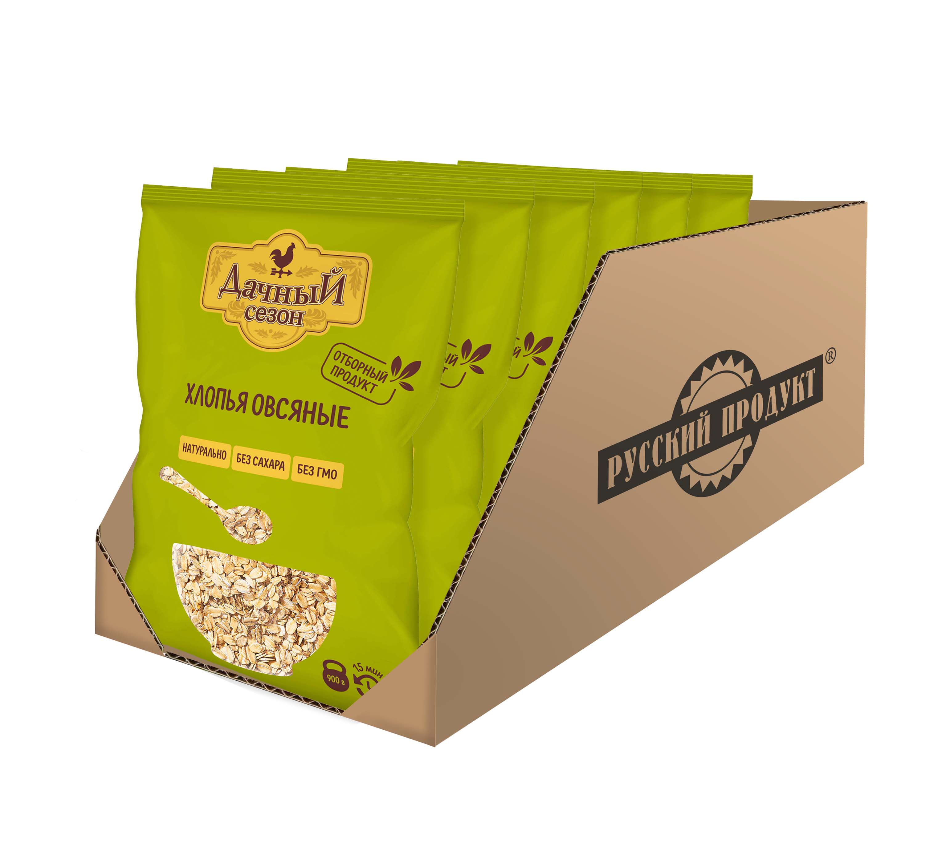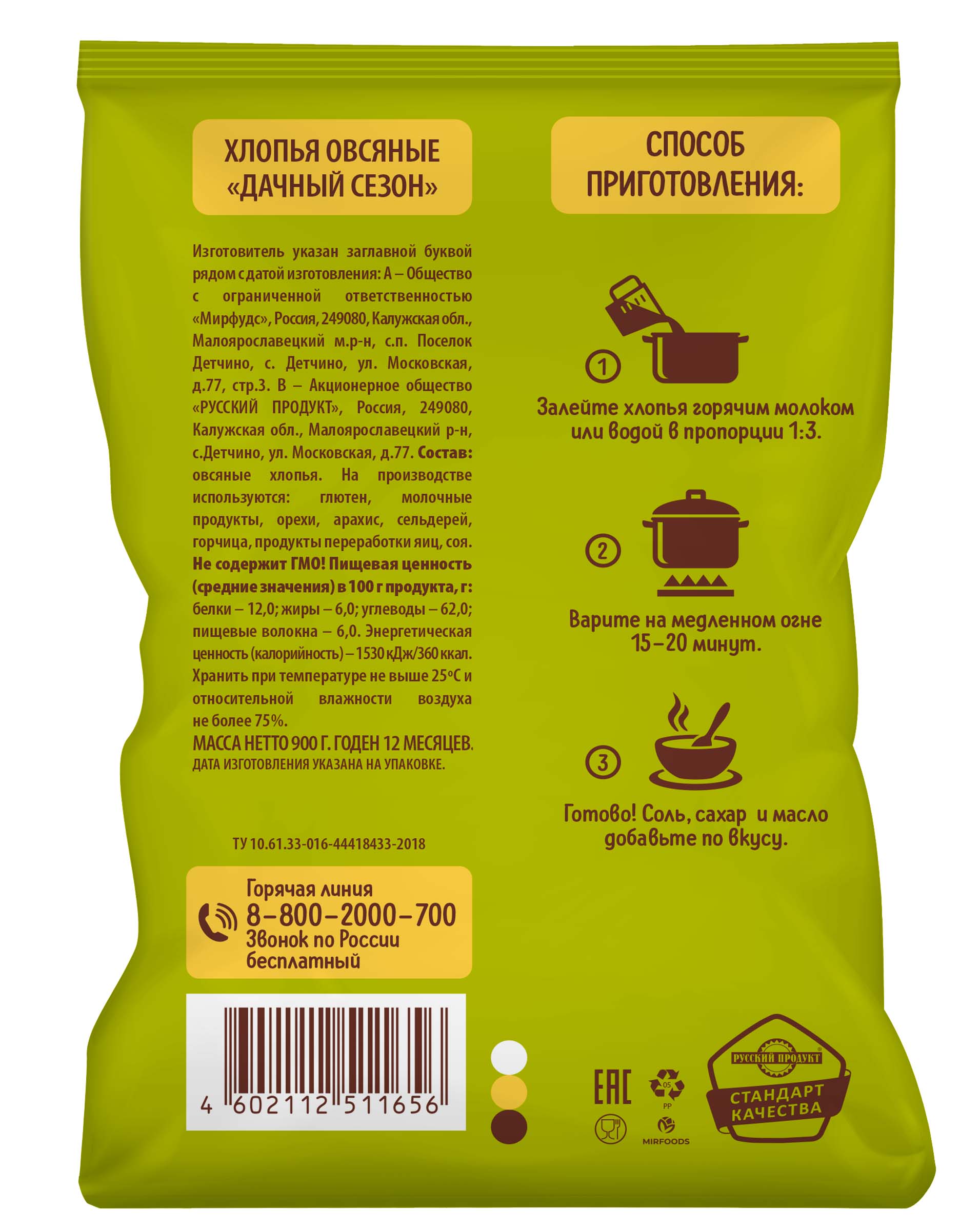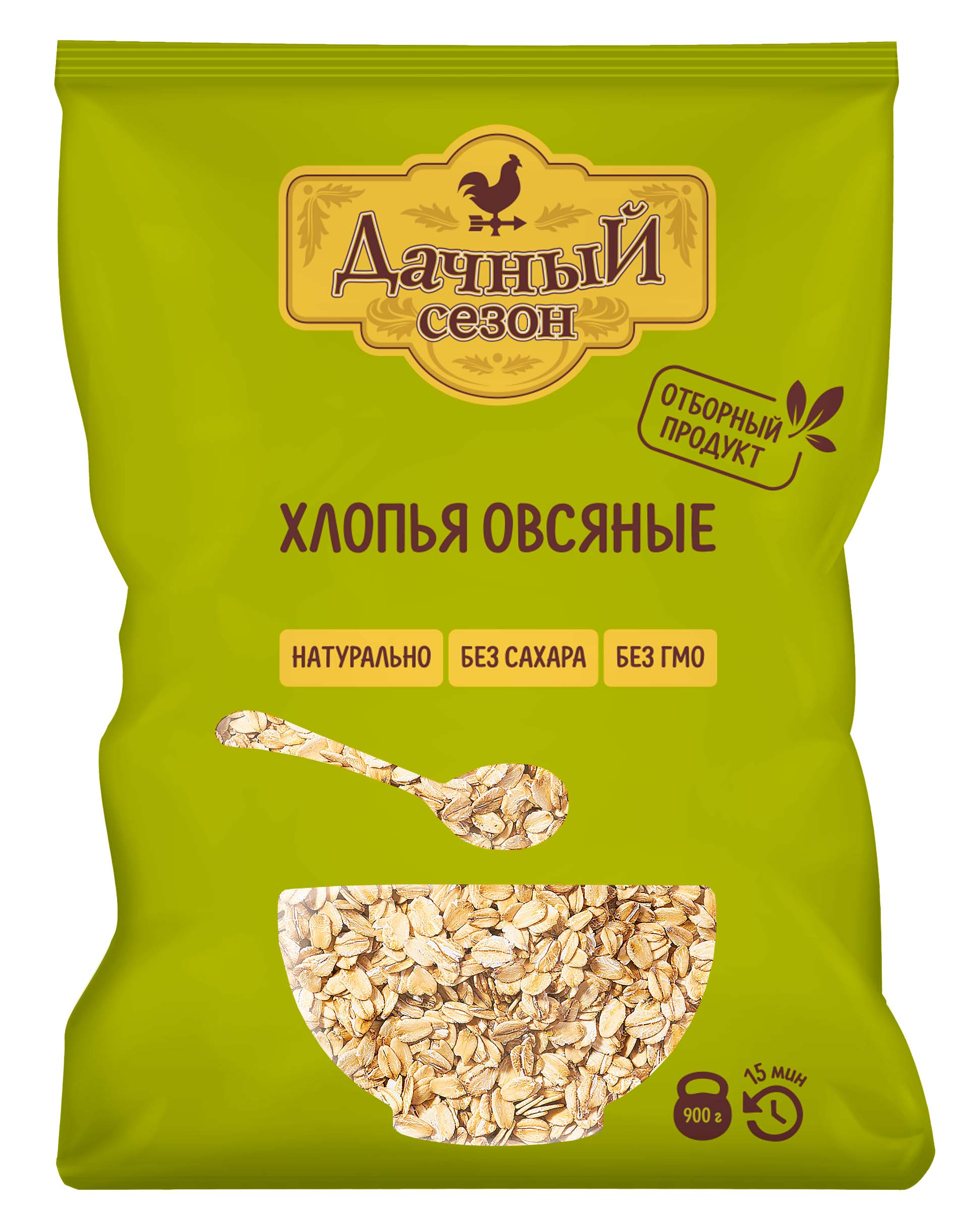| Дачный Сезон | Бакалея | Каши варочные Хлопья овсяные/зерновые Дачный Сезон | Хлопья овсяные "Дачный сезон" 900 г /6шт в кор (Мирфудс) | 2726570 | коробка |  4602112511656 | 900 | 0,00272 | 150 | 55 | 330 |  |  | 10 | Отборные овсяные хлопья быстрого приготовления "Дачный сезон... | 1. Залейте хлопья горячим молоком или водой в пропорции 1:3.... | Овсяные хлопья.