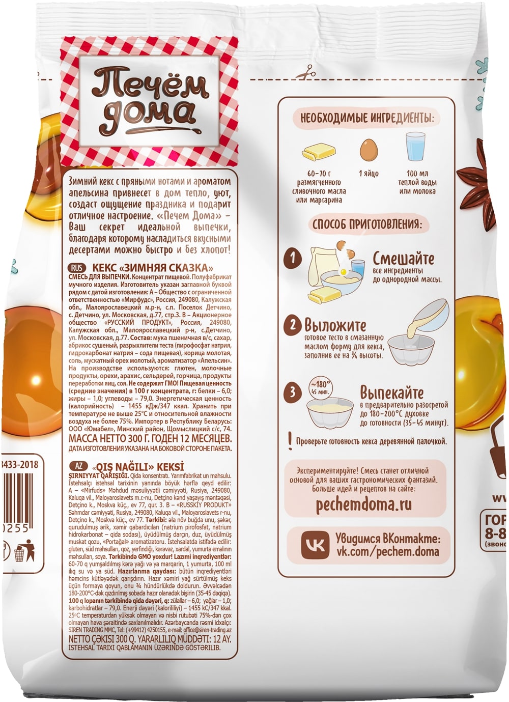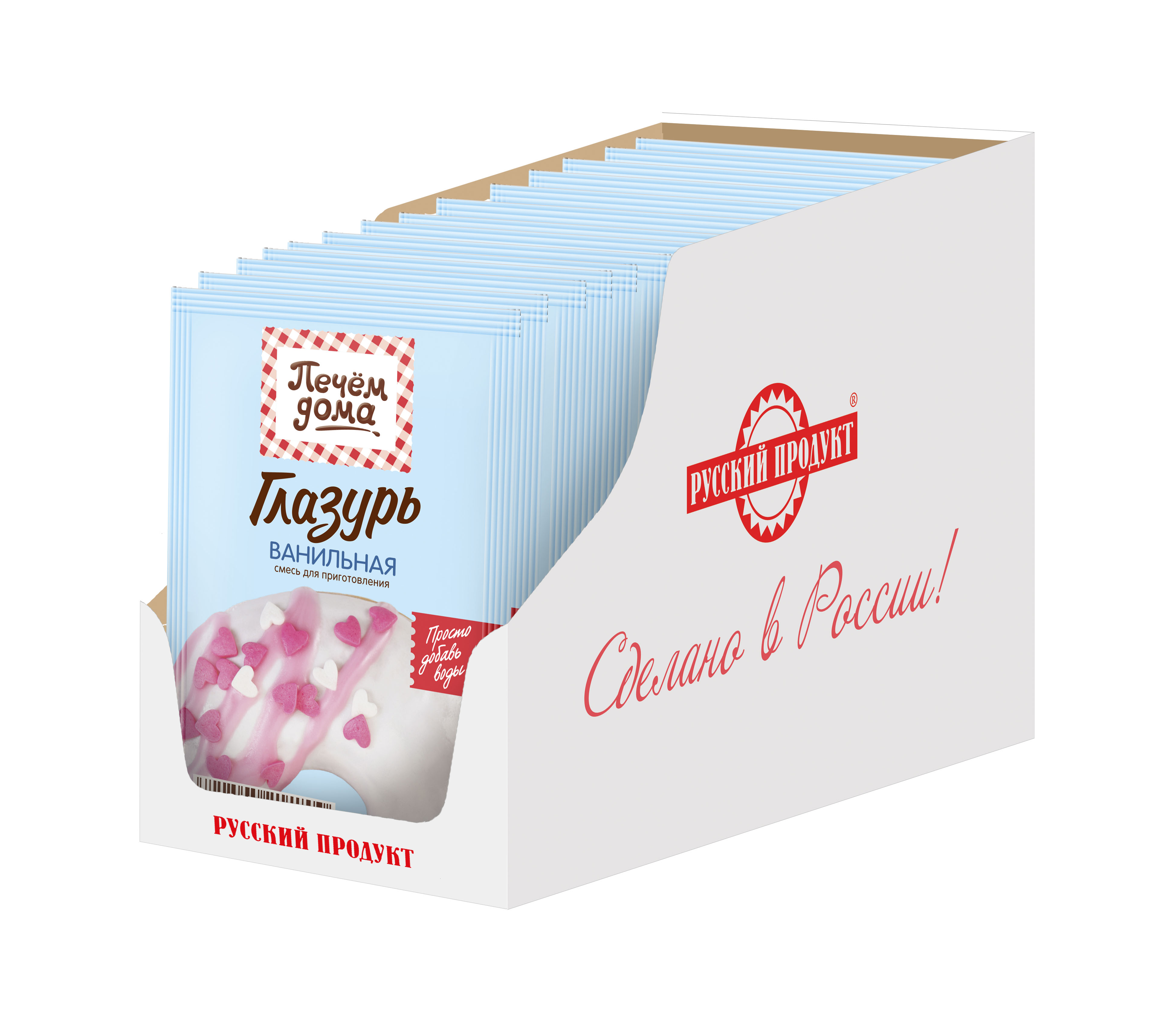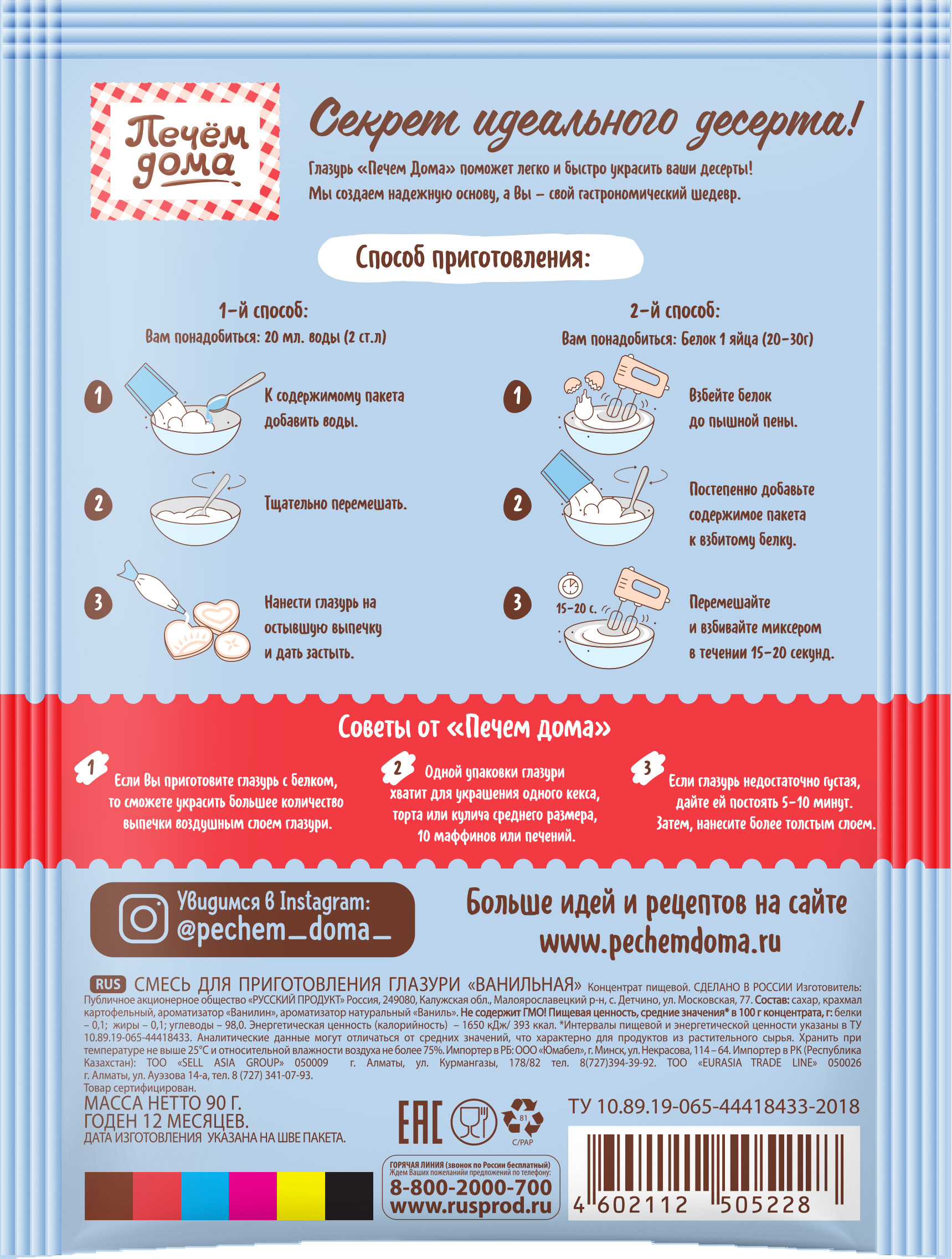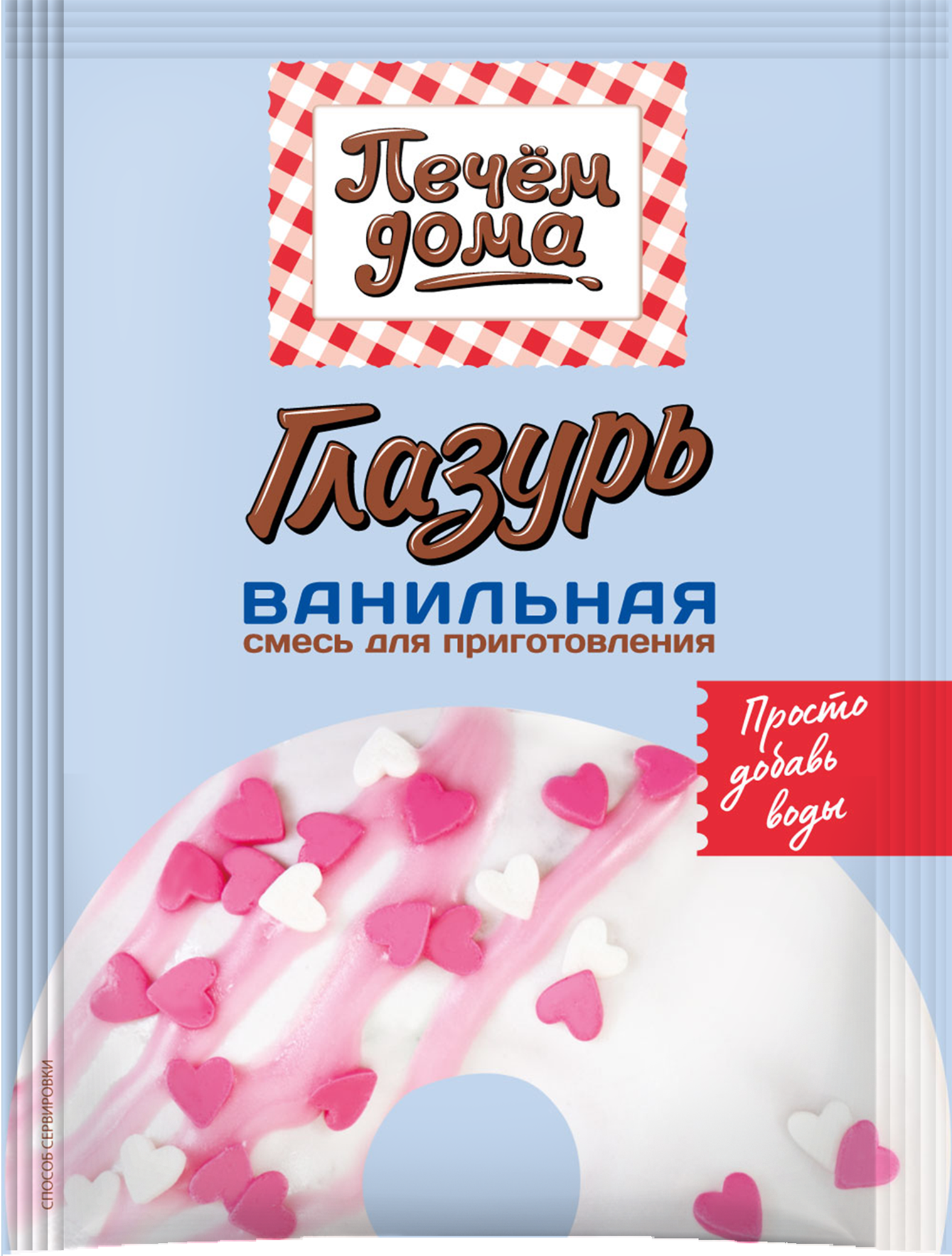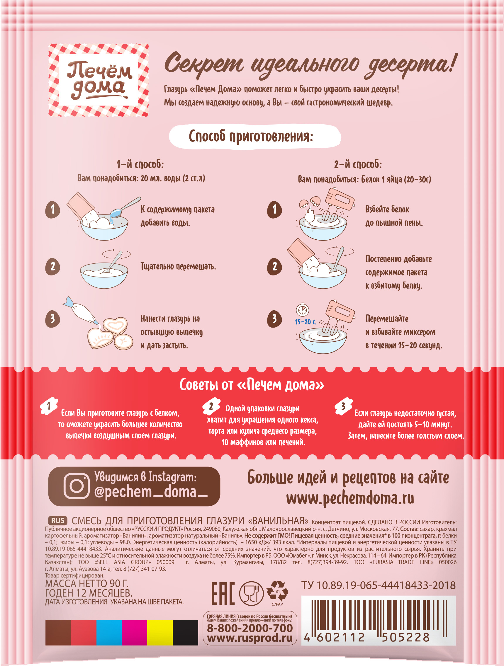 | Печем Дома | Бакалея | Кулинарные добавки | Глазурь Печем дома "Ванильная" 90г /15 уп в ш/б (Мирфудс) | 2726873 | Пакет |  4602112505228 | 90 | 0,00038 | 120 | 20 | 160 |  |  | 20 | Глазурь "Печем Дома" поможет легко и быстро украсить ваши де... | К содержимому пакета добавьте 20 мл воды (2 ст.л). Тщательно... | Сахар, красители (диоксид титана, карбонат кальция), загусти... | 3D Лицевая Оборотная Групповая уп | 394.0 | 0 | 0 | 98.5 | 12 |  | Хранить при температуре не выше 25°С и относительной влажнос... | 15 | шоу-бокс |  4602112505235 | 1,35 | 1,51 | 0,00657 | 126 | 305 | 171 | Слой | 360 | 24 | 3240 | 216 | 9 | 24 ш/б х 9 слоев | 1700 | ООО Мирфудс | 249080, Россия, Калужская обл, Малоярославецкий р-н, Детчино... | ЕАЭС N RU Д-RU.РА05.В.22893/25 | 18.06.2025 - 17.06.2030 | соответствует требованиям ТУ 10.89.19-065-44418433-2018 | Скачать | 1704909900 | 10.89.13.112 |
