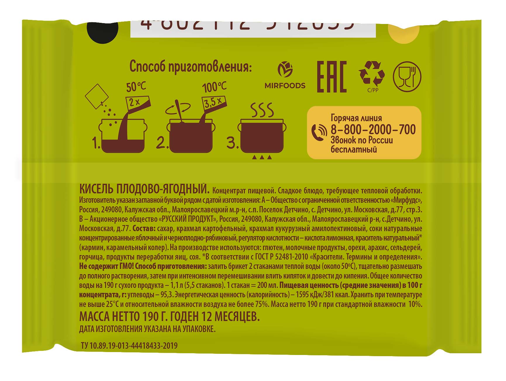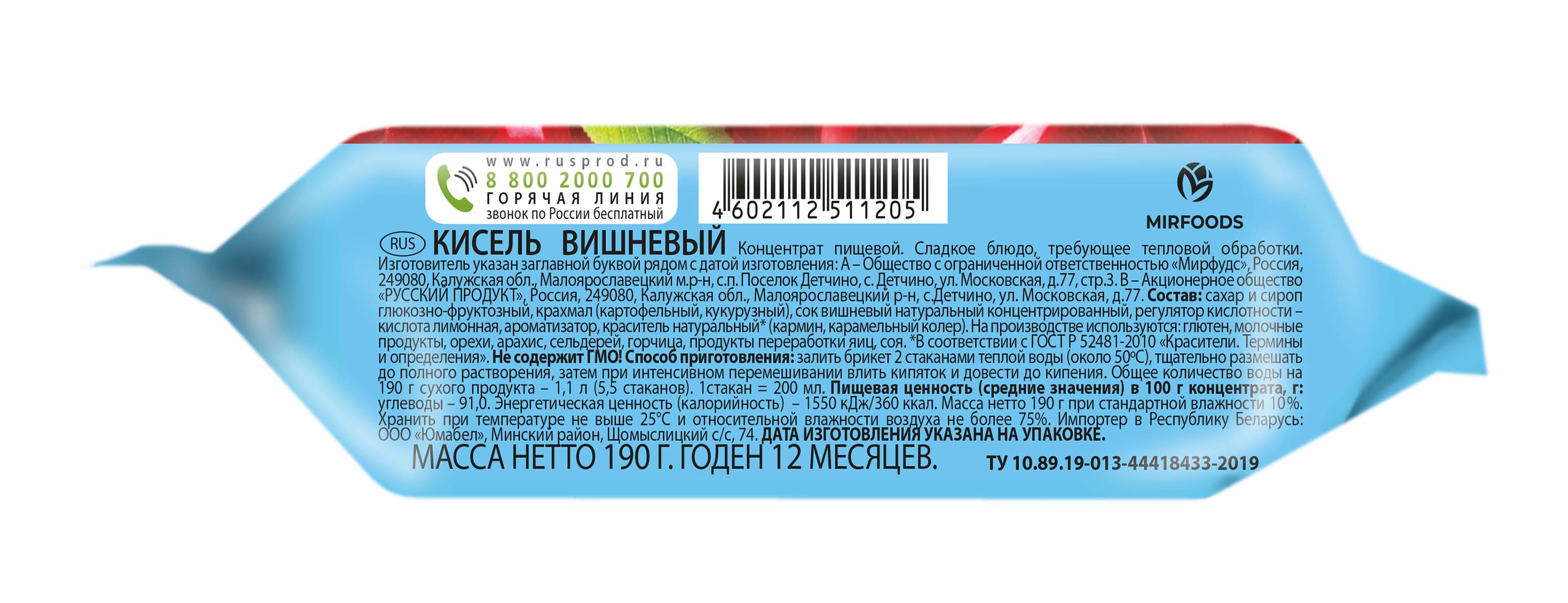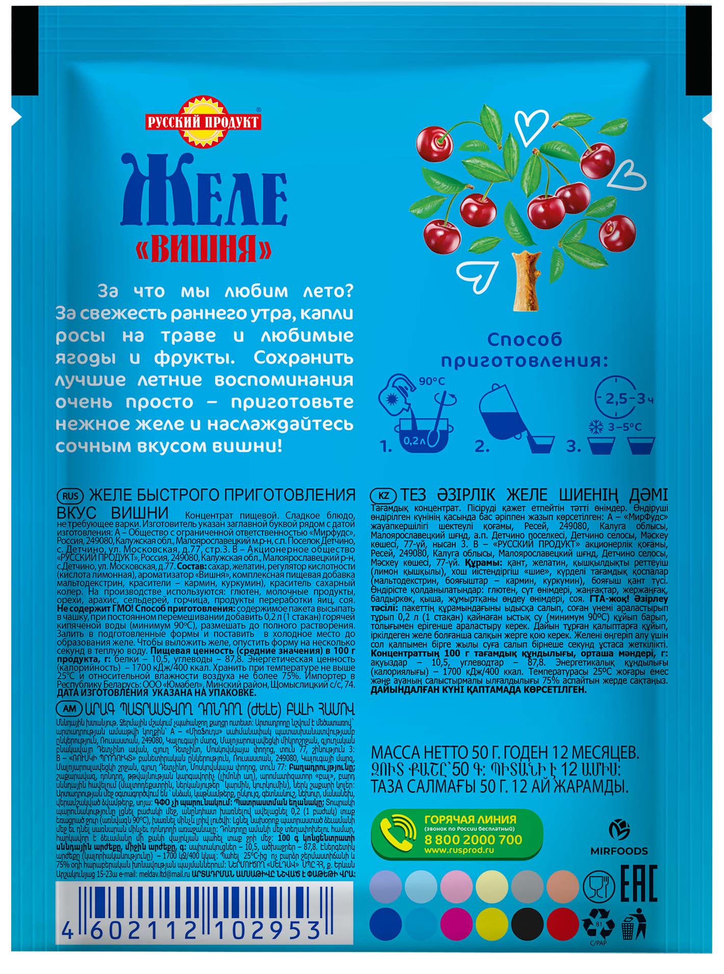 | Русский Продукт | Бакалея | Желе. | Желе быстрого пригот. "Вкус вишни" 50 г/35 уп в ш/б (Мирфудс... | 2726935 | Пакет |  4602112102953 | 50 | 0,00019 | 120 | 10 | 160 |  |  | 20 | Для приготовления желе "РУССКИЙ ПРОДУКТ" со вкусом вишни не ... | Содержимое пакета высыпать в чашку, при постоянном перемешив... | сахар, желатин, регулятор кислотности (кислота лимонная), ар... | 3D Лицевая Оборотная Групповая уп | 390.0 | 9 | 0 | 89 | 12 |  | Хранить при температуре не выше 25°С и относительной влажнос... | 35 | шоу-бокс |  4602112209539 | 1,75 | 2,12 | 0,00648 | 125 | 305 | 170 | Слой | 840 | 24 | 7560 | 216 | 9 | 24 ш/б х 9 слоев | 1690 | ООО Мирфудс | 249080, Россия, Калужская обл, Малоярославецкий р-н, Детчино... | ЕАЭС N RU Д-RU.РА05.В.93558/25 | 14.07.2025 - 13.07.2030 | соответствует требованиям ТУ 10.89.19-002-50948224-2022 | Скачать | 2106909808 | 10.89.19.230 |