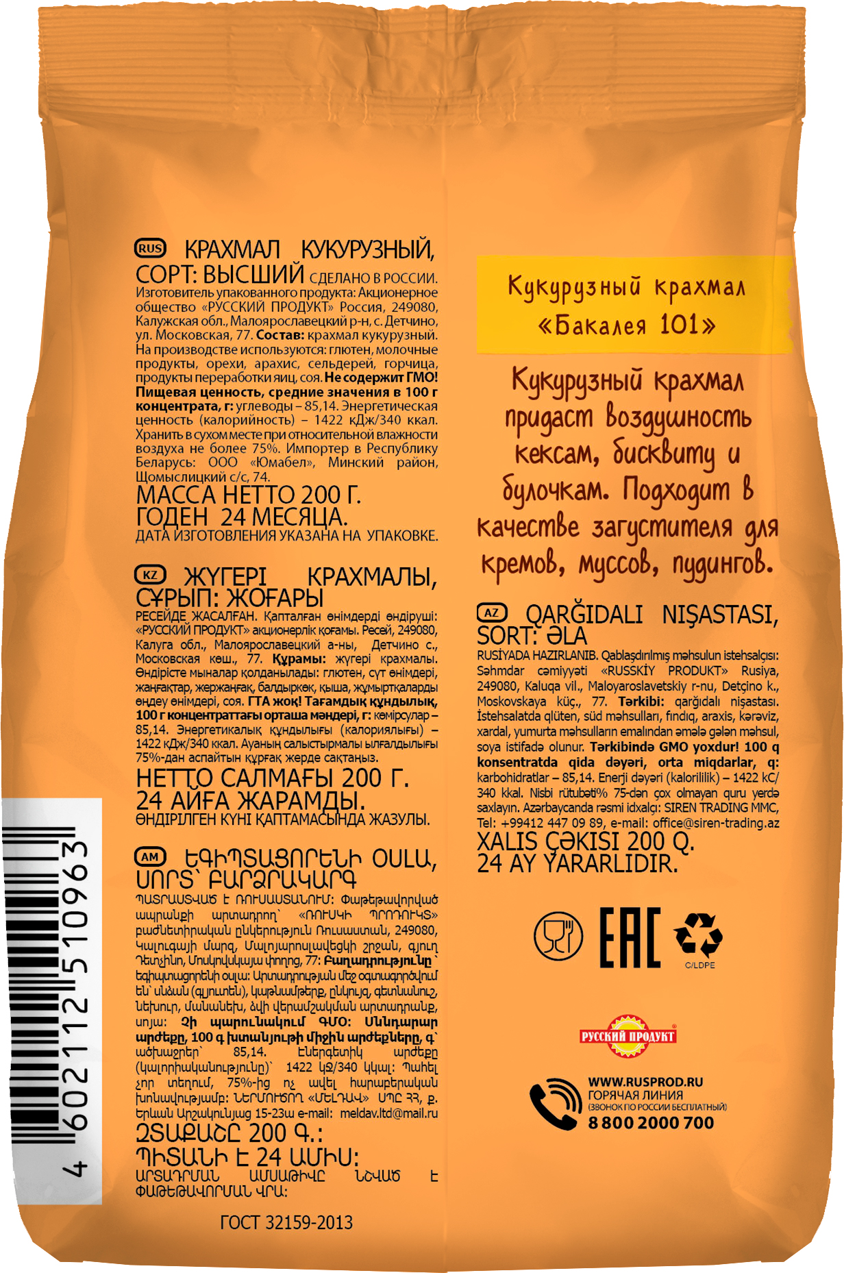 | Бакалея 101 | Бакалея | Крахмал (Собственного производства) | Крахмал кукурузный Бакалея 101 200 г/ 8 уп в ш/б (Мирфудс) | 2726588 | Пакет-подушка |  4602112510963 | 200 | 0,00064 | 115 | 40 | 140 |  |  | 20 | Кукурузный крахмал <Бакалея 101> придаст воздушность кексам,... | Применяется в соответствии с кулинарными рецептами. | Кукурузный крахмал. | Лицевая Оборотная Групповая уп | 340.0 | 0 | 0 | 85.14 | 24 |  | Хранить при температуре не выше 25°С и относительной влажнос... | 8 | шоу-бокс |  4602112510970 | 1,6 | 1,9408 | 0,00648 | 125 | 305 | 170 | Слой | 192 | 24 | 1728 | 216 | 9 | 24 ш/б х 9 слоев | 1700 | ООО Мирфудс | 249080, Россия, Калужская обл, Малоярославецкий р-н, Детчино... | ЕАЭС N RU Д-RU.РА05.В.61746/25 | 03.07.2025 - 02.07.2030 | соответствует требованиям ГОСТ 32159-2013 | Скачать | 1108120000 | 10.62.11.112 |