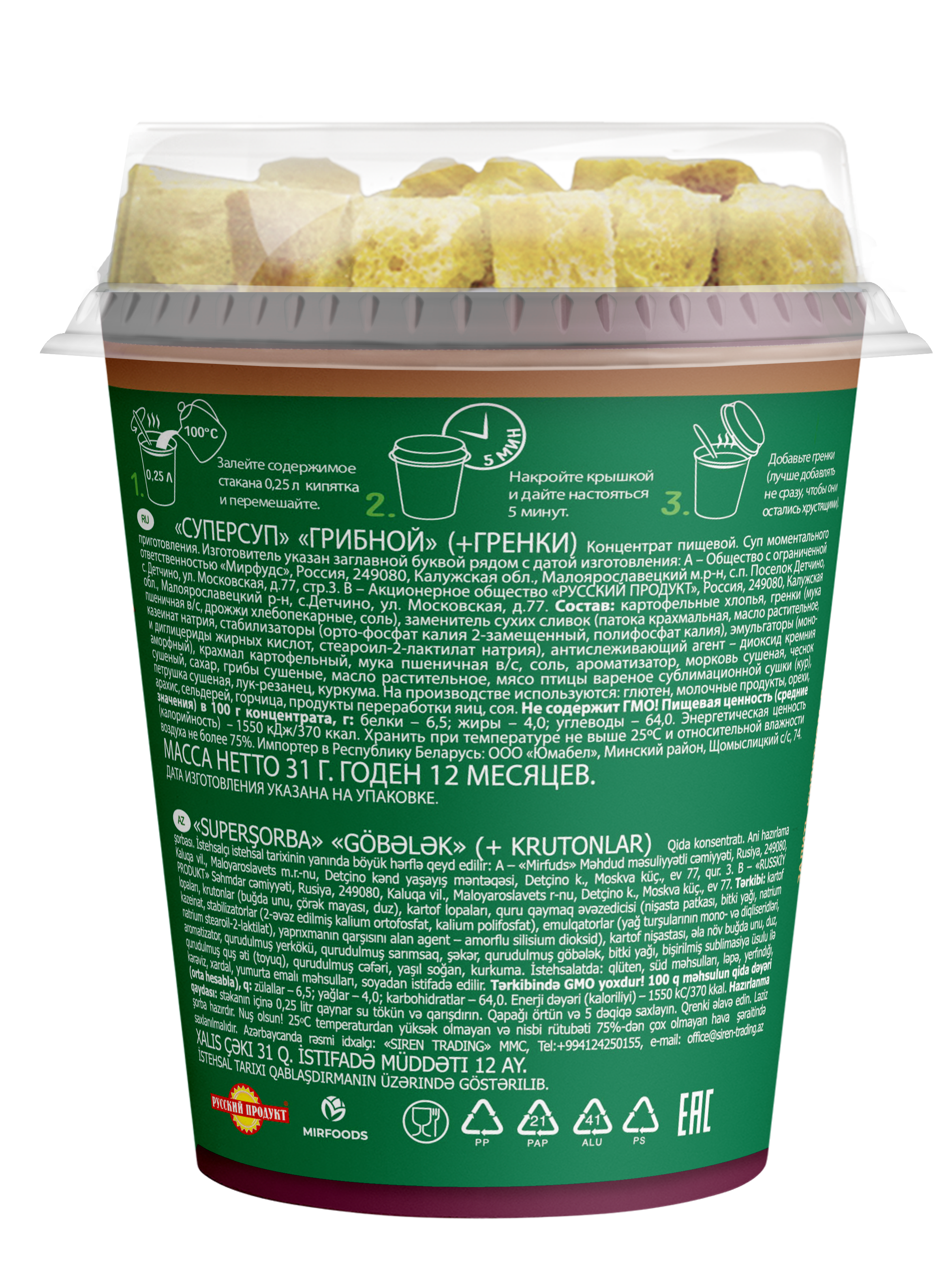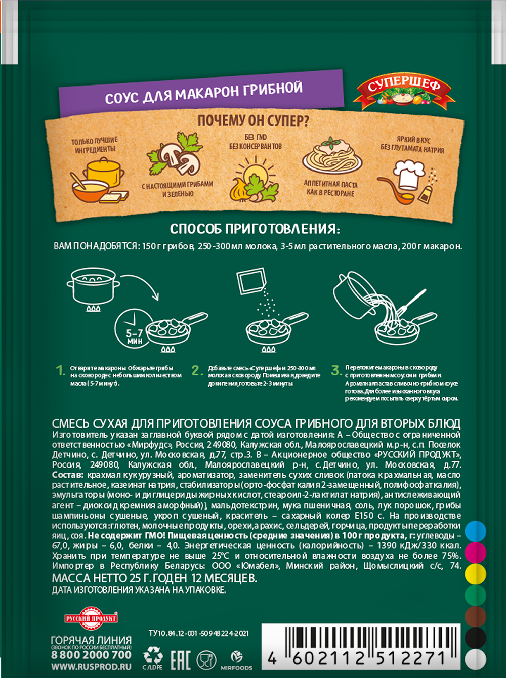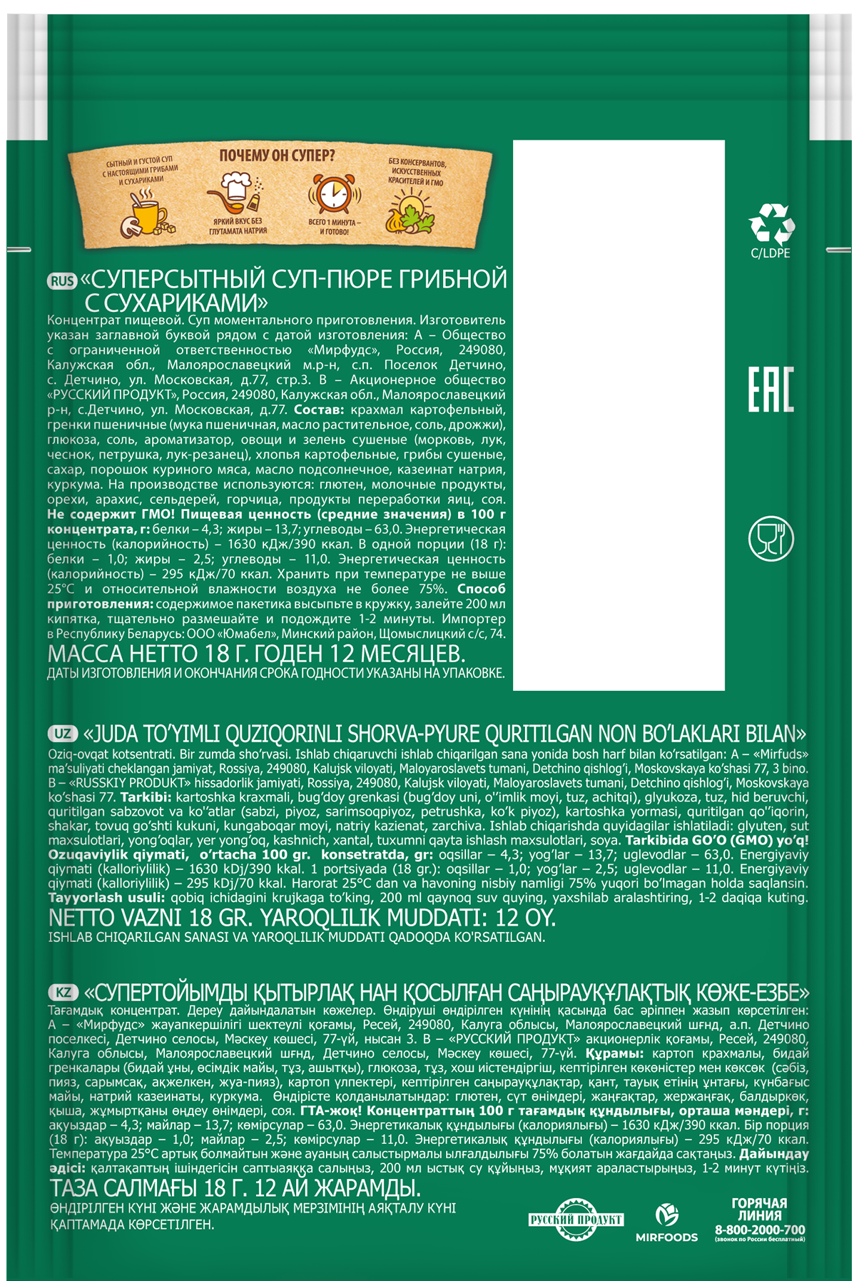 Б... | ВАМ ПОНАДОБИТСЯ: 150 г грибов, 250 - 300 мл молока, 3-5 мл р... | заменитель сухих сливок (патока крахмальная, масло раститель... | 3D Лицевая Оборотная | 345.0 | 5 | 8 | 64 | 12 |  | Хранить при температуре не выше 25°С и относительной влажнос... | 20 | шоу-бокс |  4602112512288 | 0,5 | 0,65 | 0,00453 | 130 | 205 | 170 | Слой | 680 | 34 | 6120 | 306 | 9 | 34 ш/б х 9 слоев | 1680 | ООО Мирфудс | 249080, Россия, Калужская обл, Малоярославецкий р-н, Детчино... | ЕАЭС N RU Д-RU.РА01.В.52820/25 | 30.01.2025 - 28.01.2030 | соответствует требованиям ТУ10.84.12-001-50948224-2021 | Скачать | 2103909009 | 10.84.12.150 |