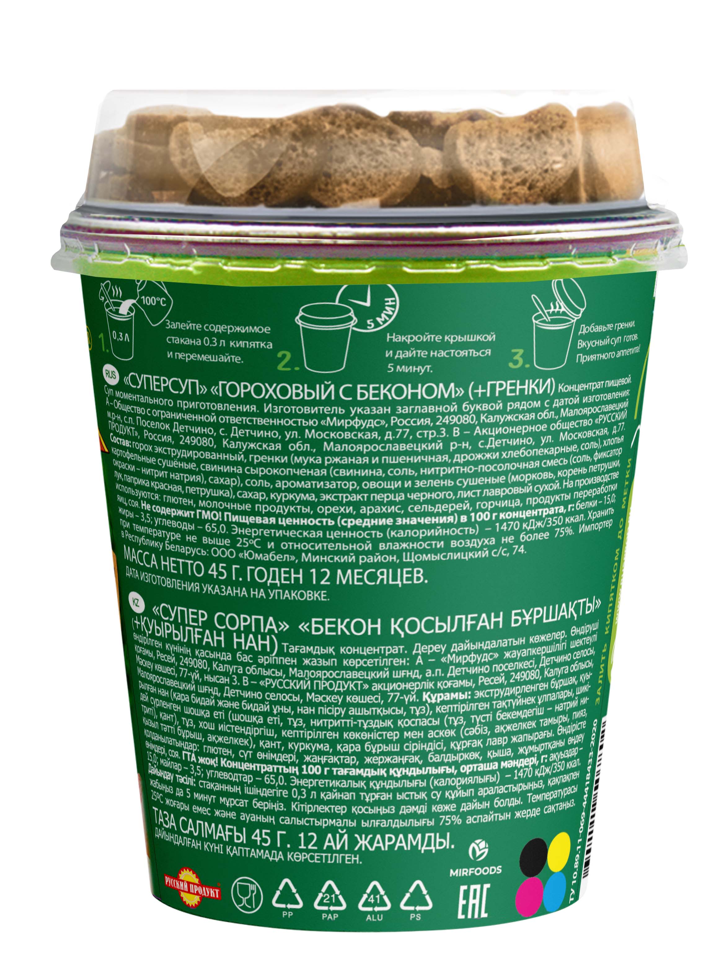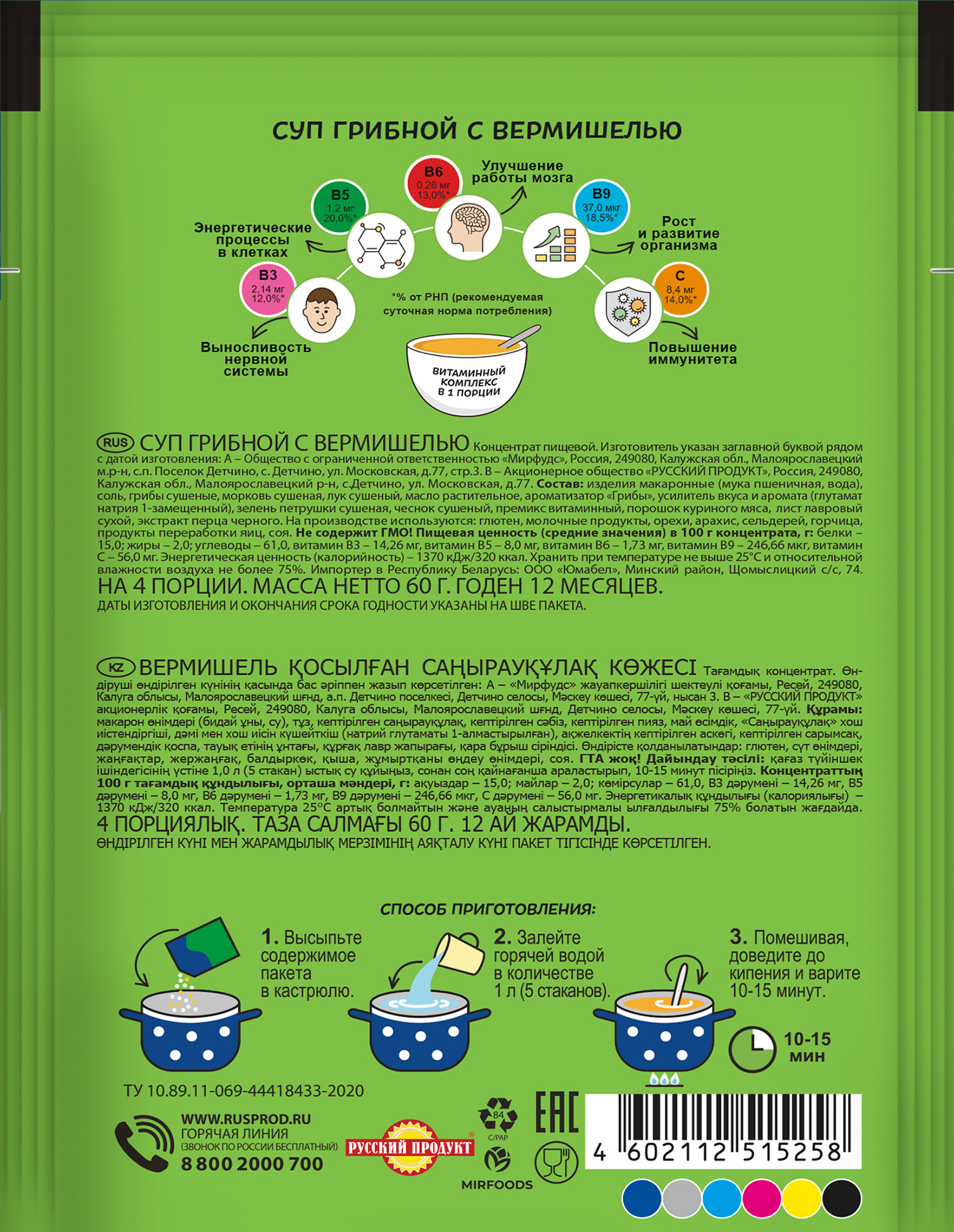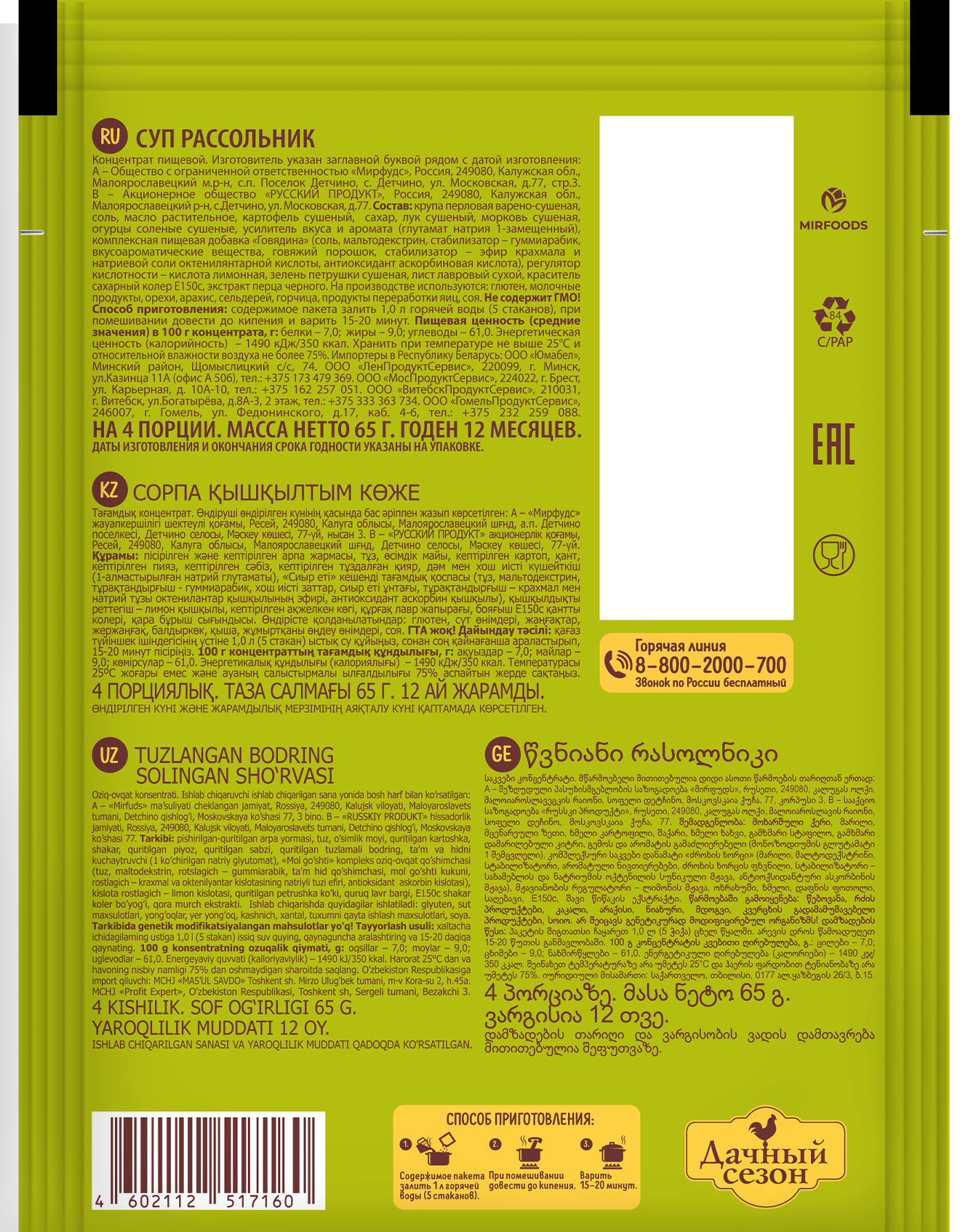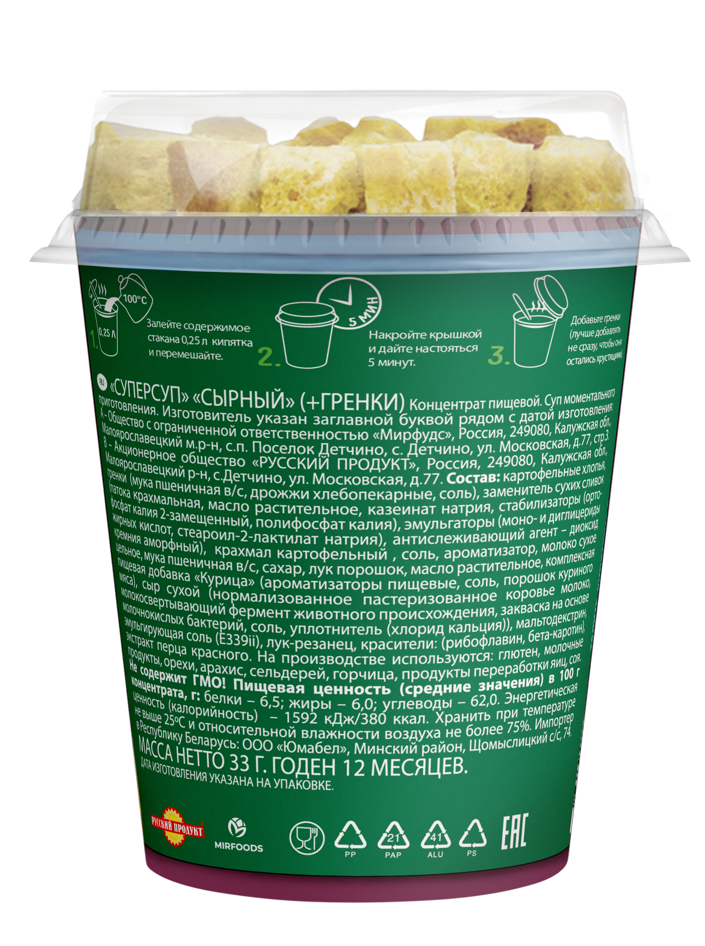Б... | ВАМ ПОНАДОБИТСЯ: 150 г грибов, 250 - 300 мл молока, 3-5 мл р... | заменитель сухих сливок (патока крахмальная, масло раститель... | 3D Лицевая Оборотная | 345.0 | 5 | 8 | 64 | 12 |  | Хранить при температуре не выше 25°С и относительной влажнос... | 20 | шоу-бокс |  4602112512288 | 0,5 | 0,65 | 0,00453 | 130 | 205 | 170 | Слой | 680 | 34 | 6120 | 306 | 9 | 34 ш/б х 9 слоев | 1680 | ООО Мирфудс | 249080, Россия, Калужская обл, Малоярославецкий р-н, Детчино... | ЕАЭС N RU Д-RU.РА01.В.52820/25 | 30.01.2025 - 28.01.2030 | соответствует требованиям ТУ10.84.12-001-50948224-2021 | Скачать | 2103909009 | 10.84.12.150 |