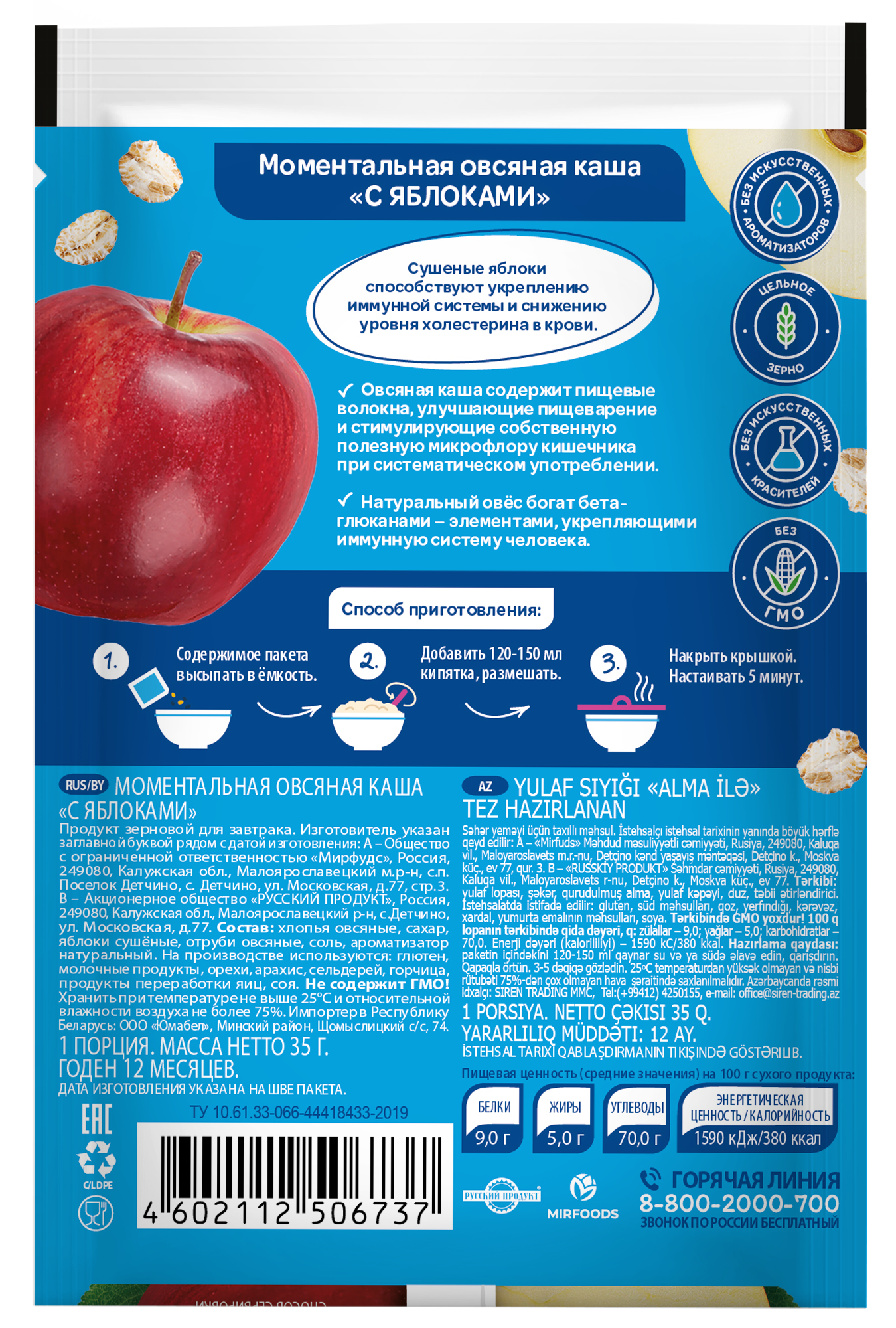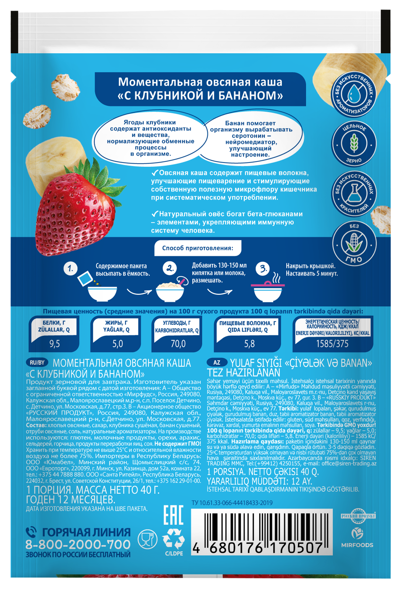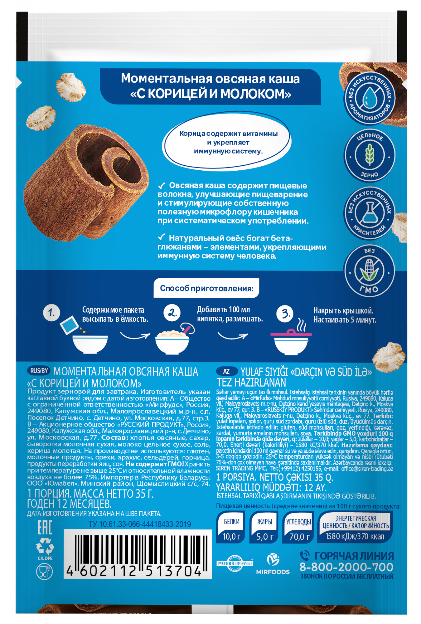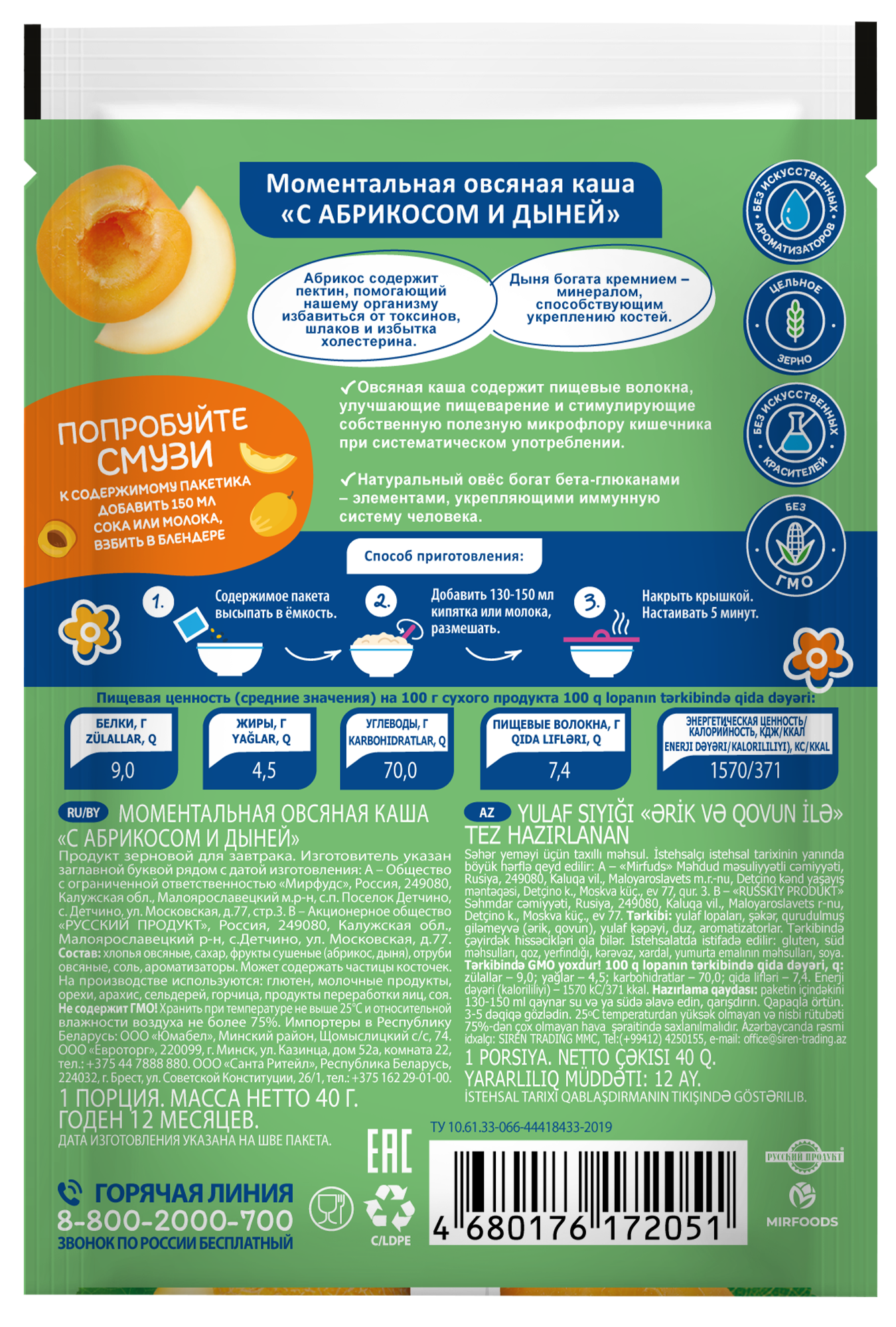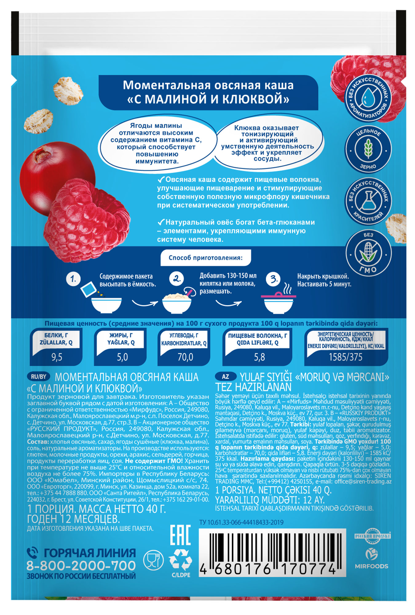 Состав: хлопья овсяные, мин... | Лицевая Оборотная |  |  |  |  | 12 |  | Хранить при температуре не выше 25°С и относительной влажнос... | 8 | шоу-бокс |  4602112514558 | 1,68 | 2,33 | 0,01155 | 148 | 396 | 197 | Слой | 128 | 16 | 1024 | 128 | 8 | 16 ш/б х 8 слоев | 1736 | ООО Мирфудс | 249080, Россия, Калужская обл, Малоярославецкий р-н, Детчино... | ЕАЭС N RU Д-RU.РА08.В.92359/23 | 20.10.2023 - 19.10.2026 | соответствует требованиям ТУ 10.61.33-066-44418433-2019 | Скачать | 1904908000 | 10.61.33.110 |