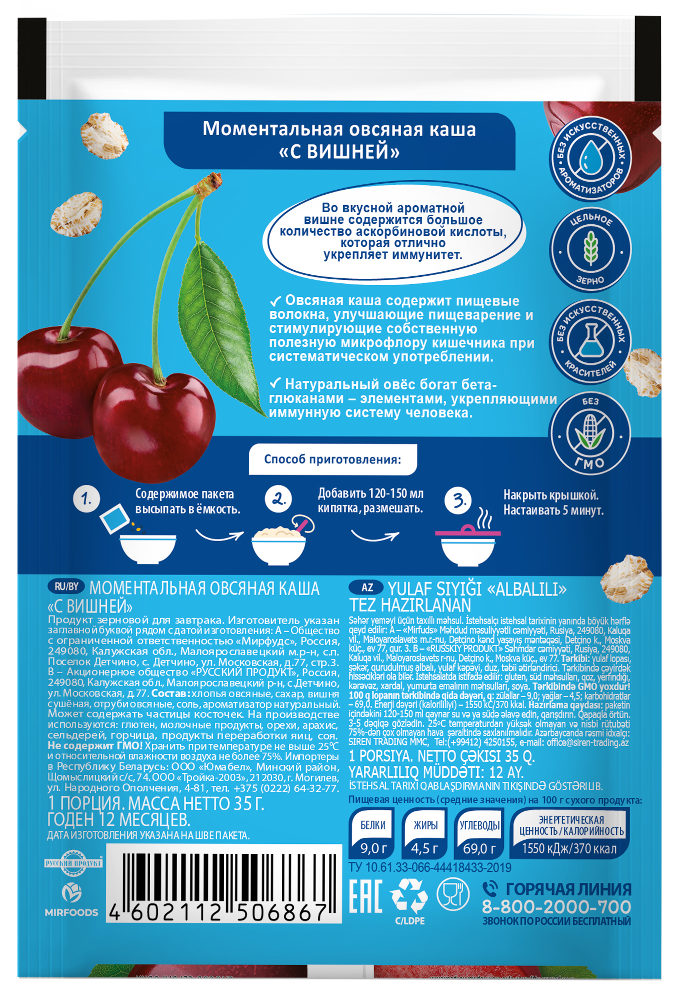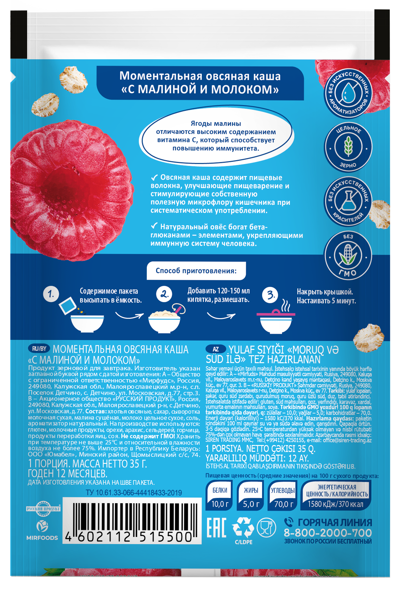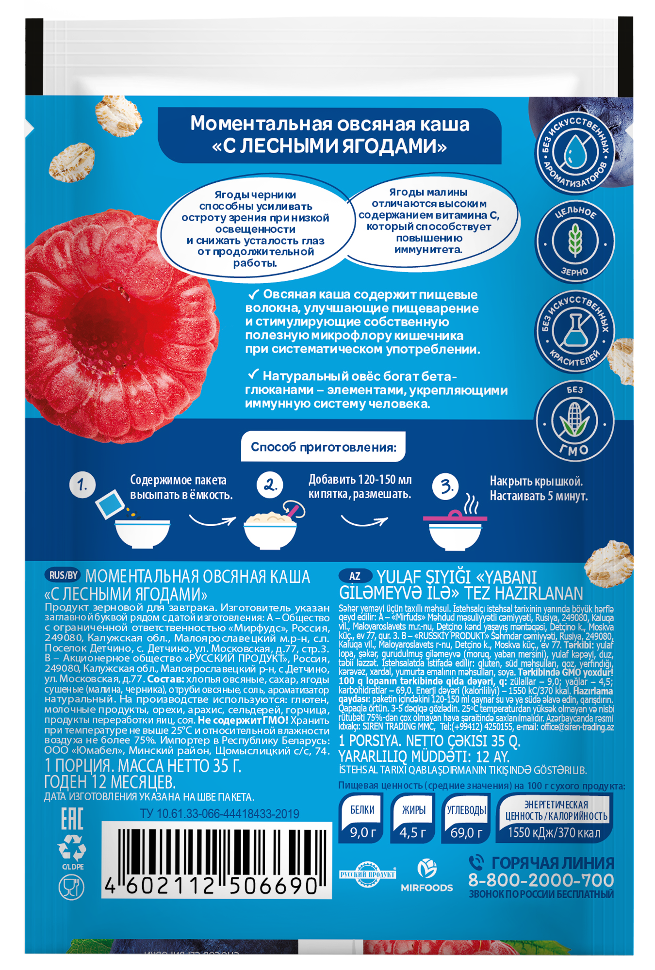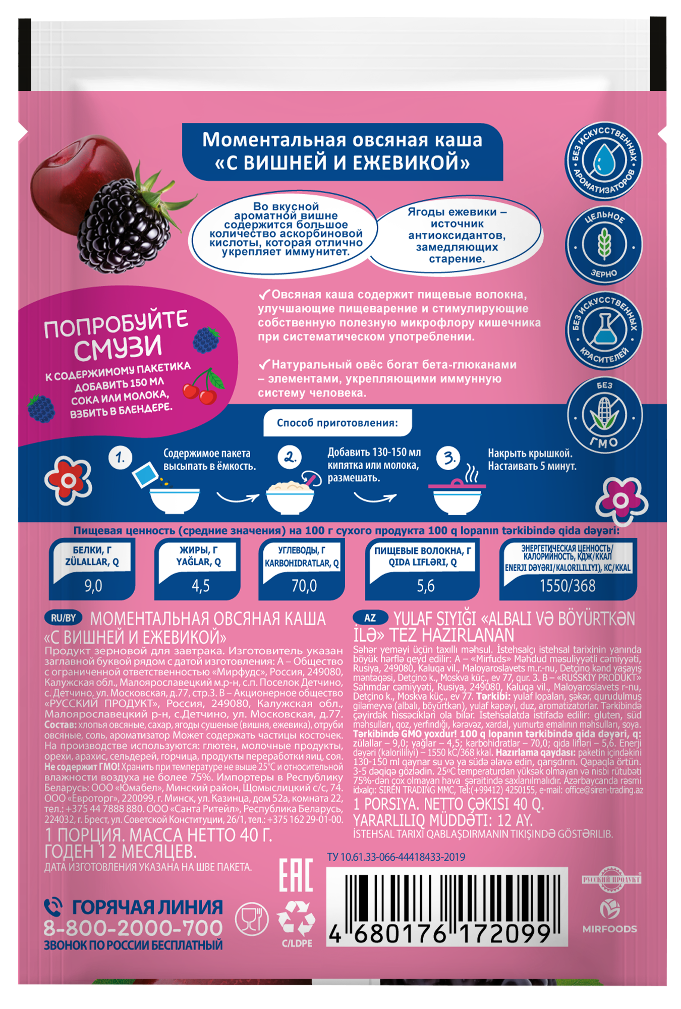 Состав: хлопья овсяные, мин... | Лицевая Оборотная |  |  |  |  | 12 |  | Хранить при температуре не выше 25°С и относительной влажнос... | 8 | шоу-бокс |  4602112514558 | 1,68 | 2,33 | 0,01155 | 148 | 396 | 197 | Слой | 128 | 16 | 1024 | 128 | 8 | 16 ш/б х 8 слоев | 1736 | ООО Мирфудс | 249080, Россия, Калужская обл, Малоярославецкий р-н, Детчино... | ЕАЭС N RU Д-RU.РА08.В.92359/23 | 20.10.2023 - 19.10.2026 | соответствует требованиям ТУ 10.61.33-066-44418433-2019 | Скачать | 1904908000 | 10.61.33.110 |