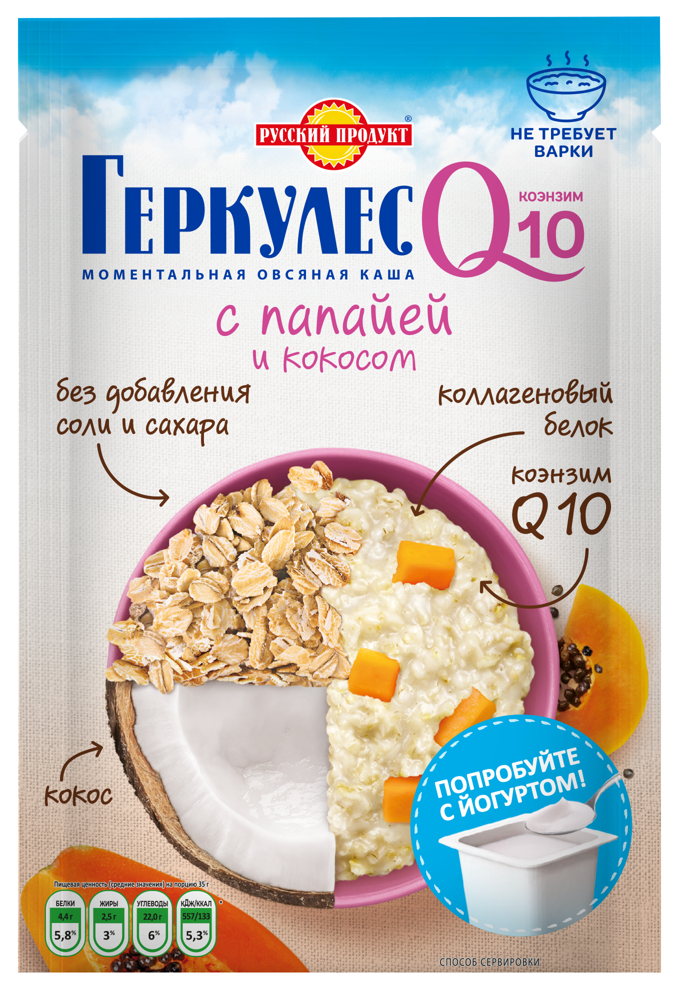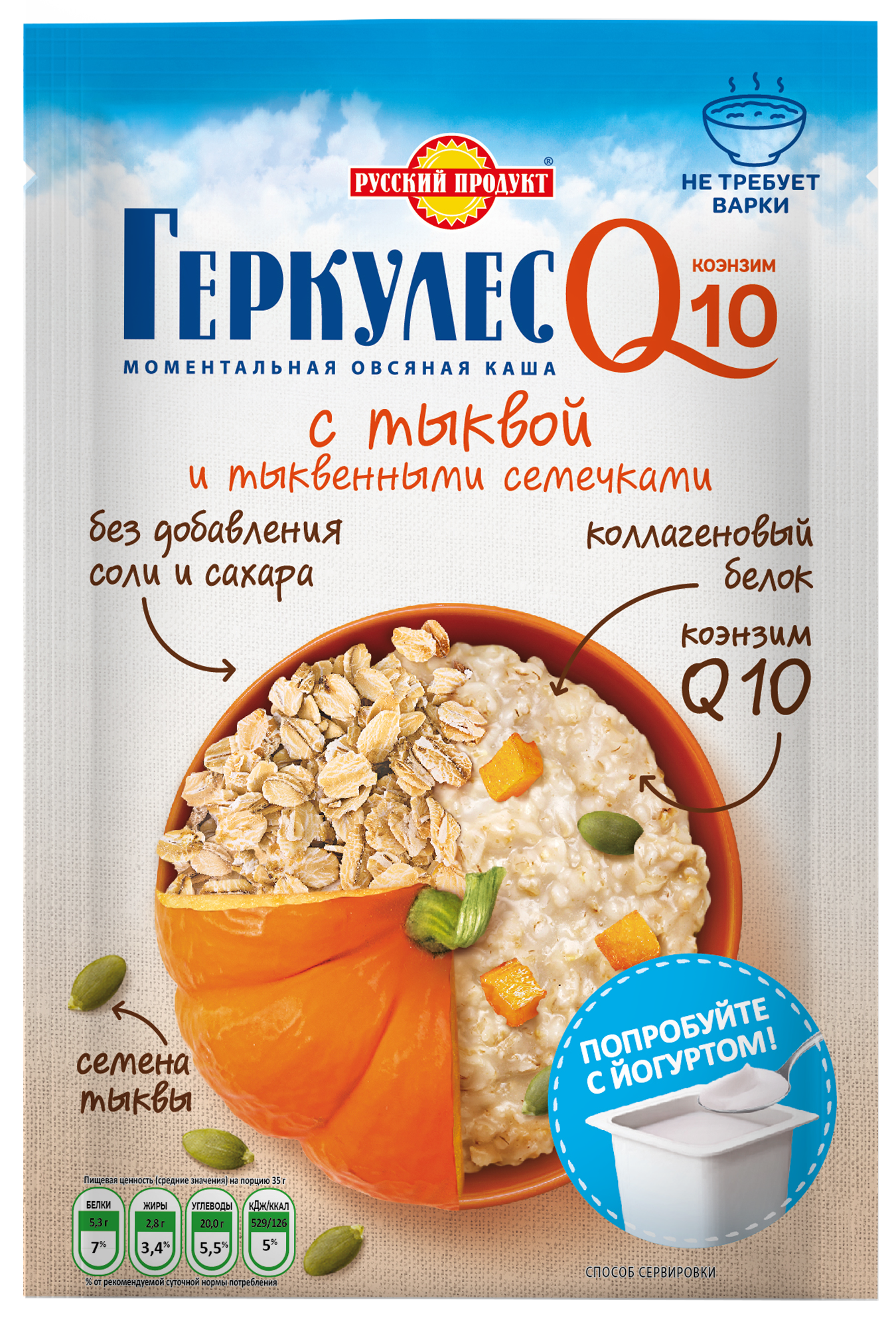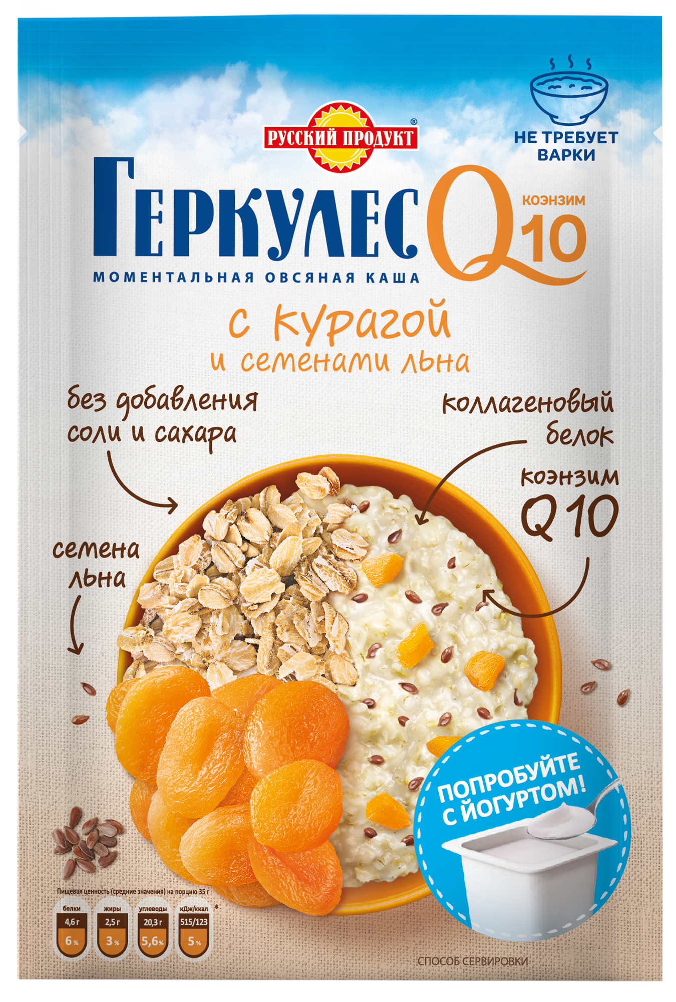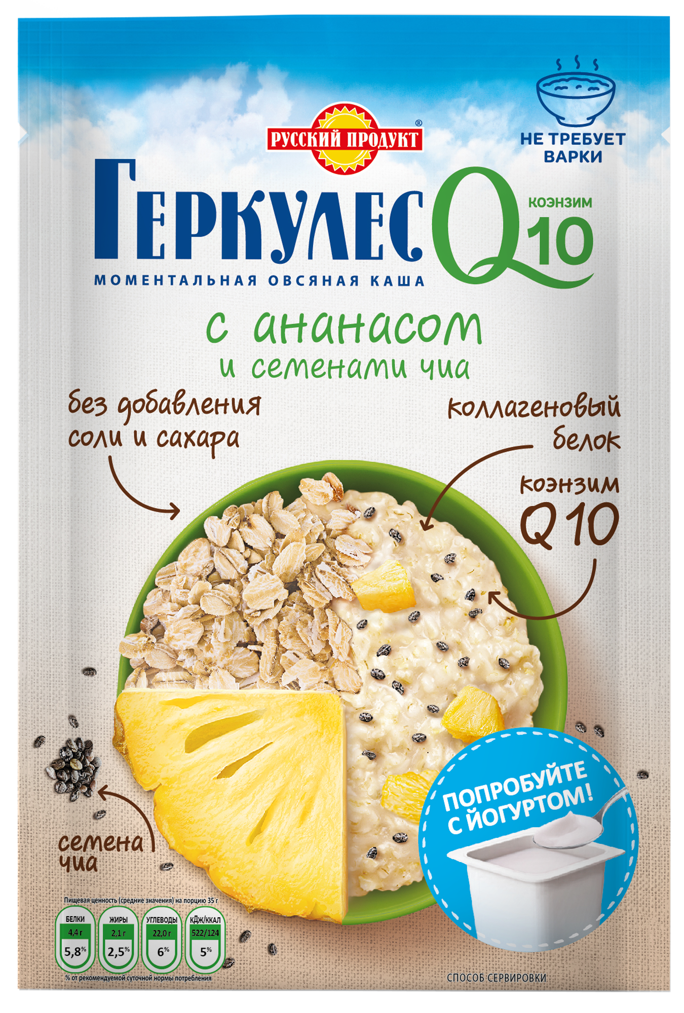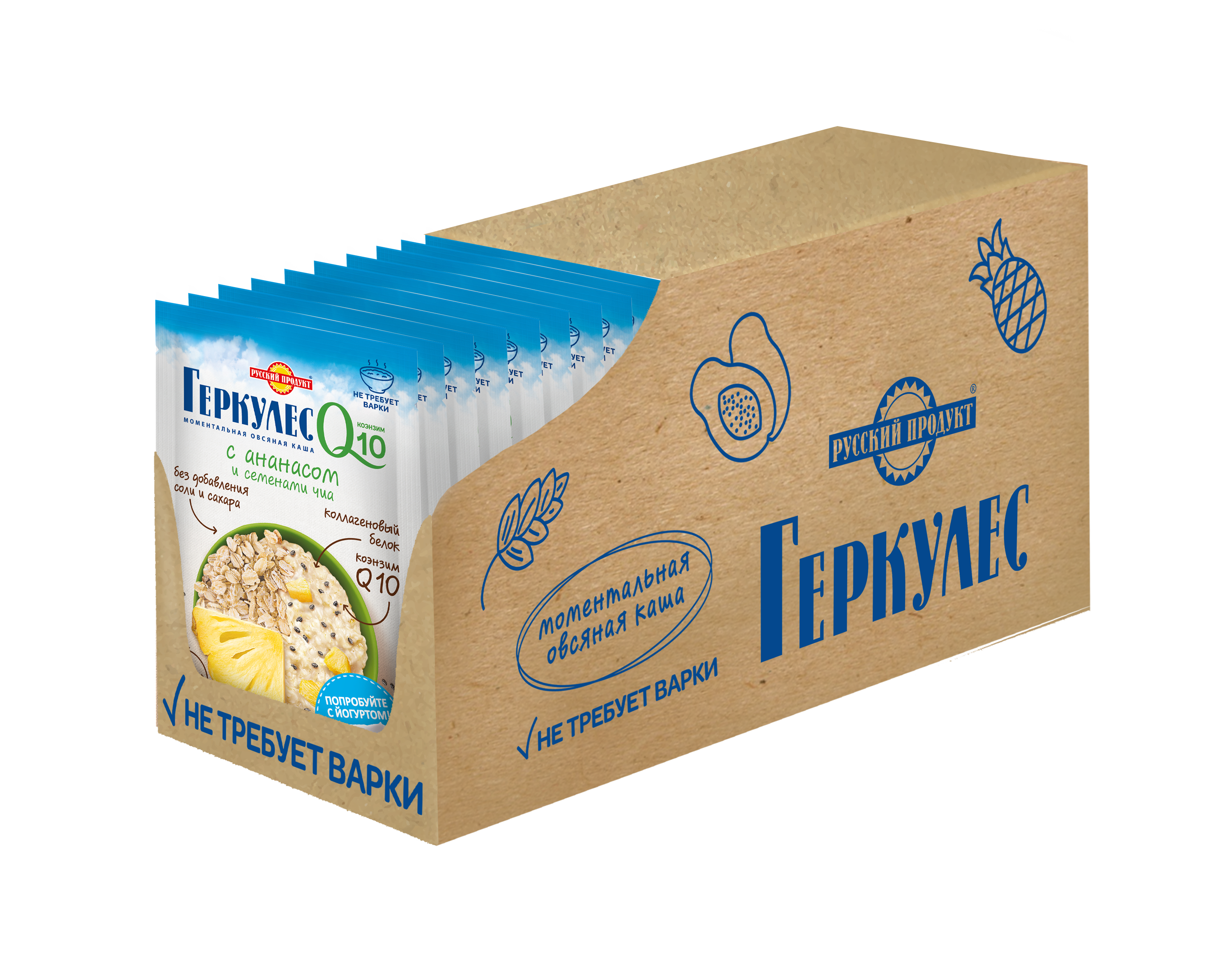 | Геркулес | Бакалея | Каши моментальные Геркулес | Овсяная каша момент Ассорти "Геркулес Q10" (ананас, курага, ... | 2700207 | Коробка |  4602112514527 | 210 | 0,00119 | 120 | 52 | 190 |  |  | 10 | Каша с коэнзимом Q10 и коллагеном не только улучшает пищевар... | 1. Содержимое пакета высыпать в емкость.