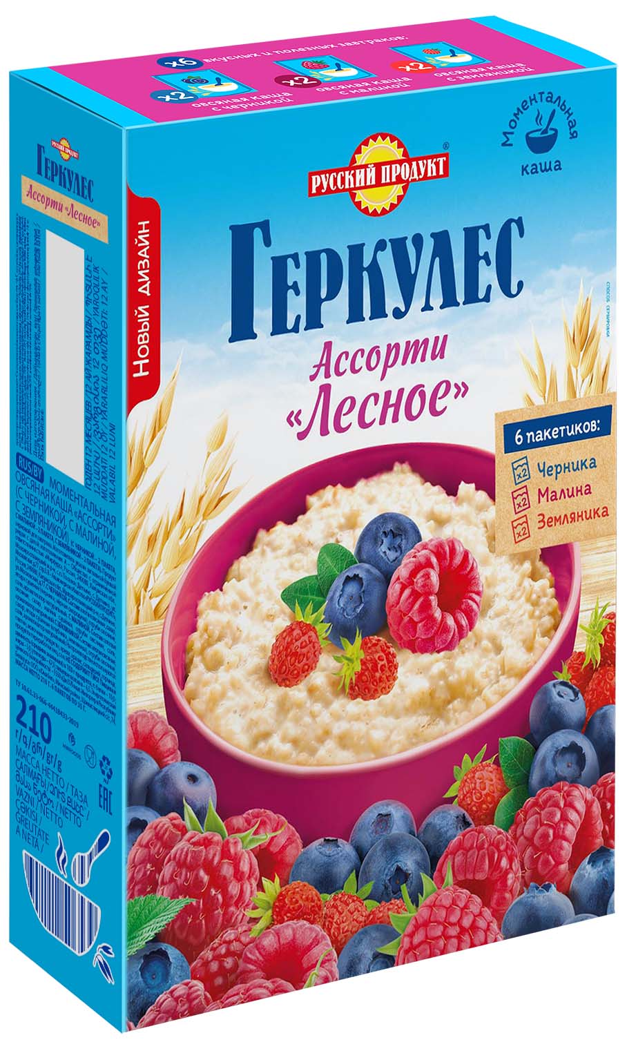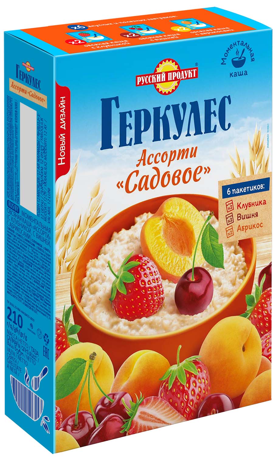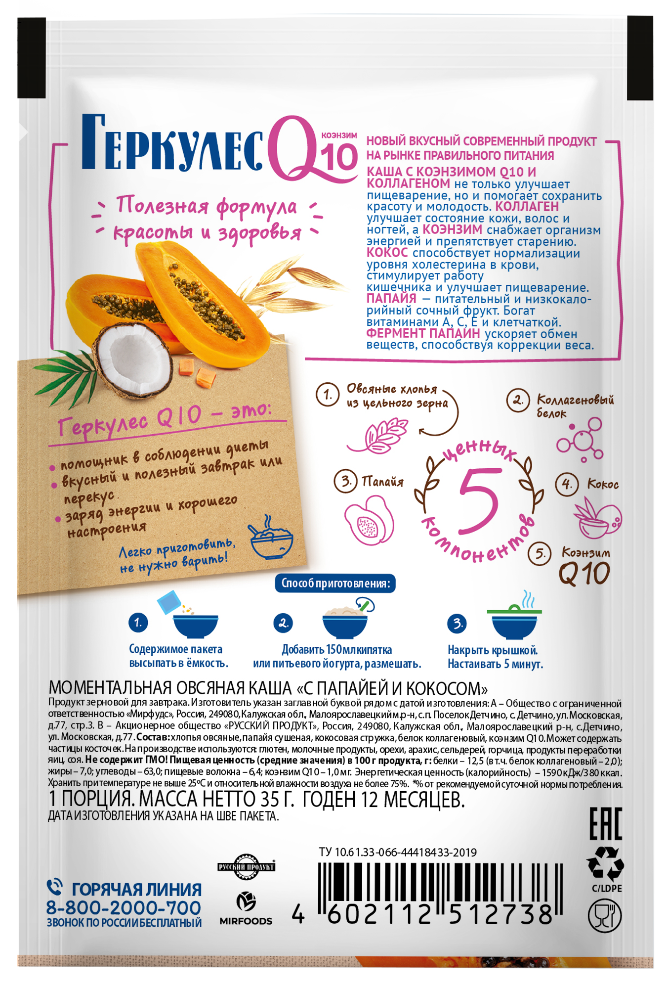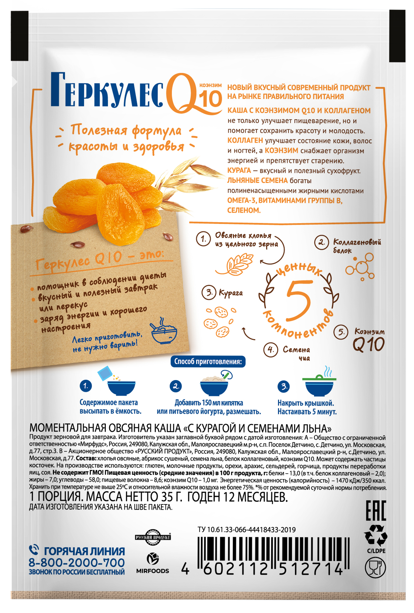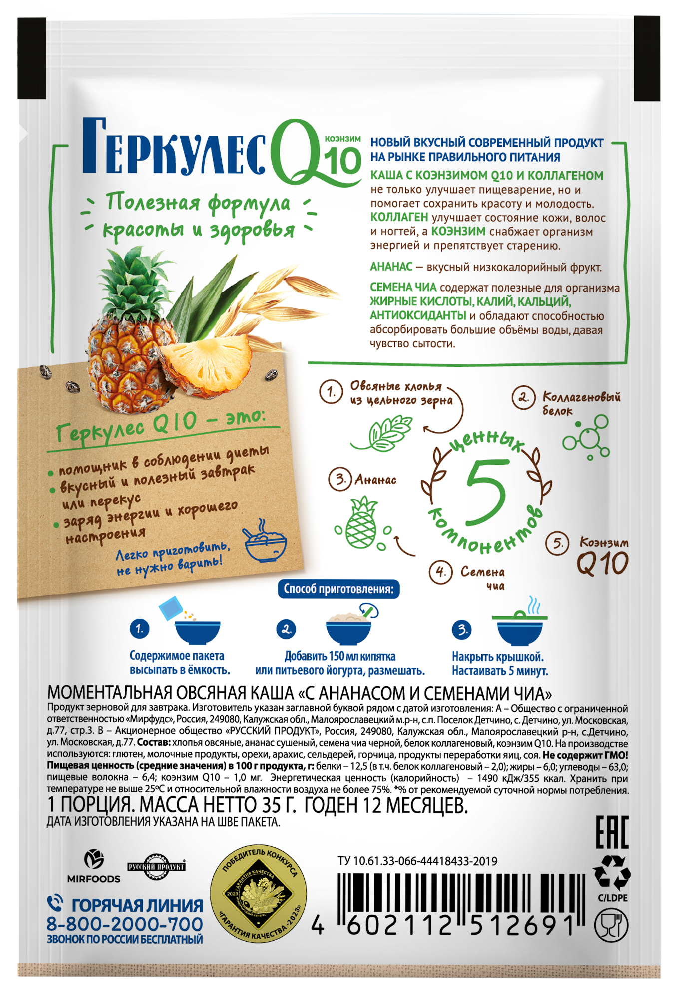 | Геркулес | Бакалея | Каши моментальные Геркулес | Овсяная каша момент Ассорти "Геркулес Q10" (ананас, курага, ... | 2700207 | Коробка |  4602112514527 | 210 | 0,00119 | 120 | 52 | 190 |  |  | 10 | Каша с коэнзимом Q10 и коллагеном не только улучшает пищевар... | 1. Содержимое пакета высыпать в емкость.