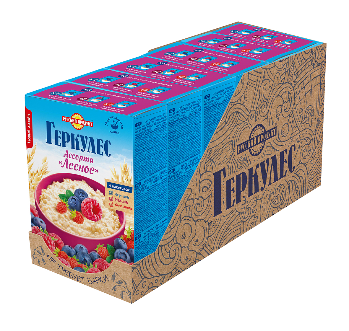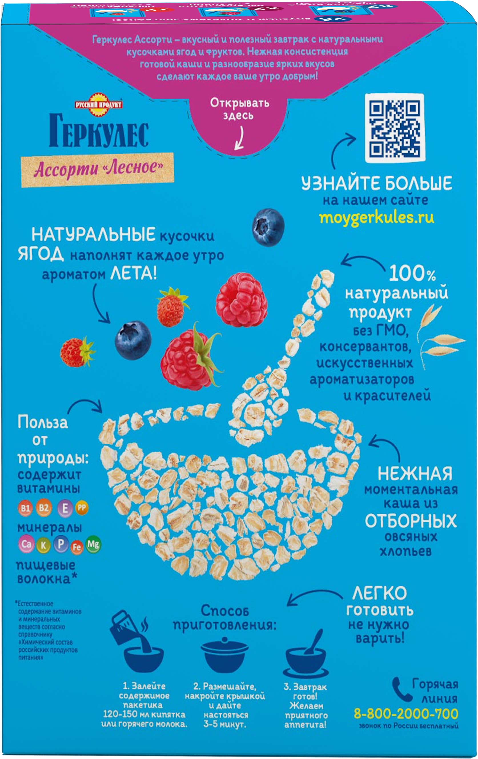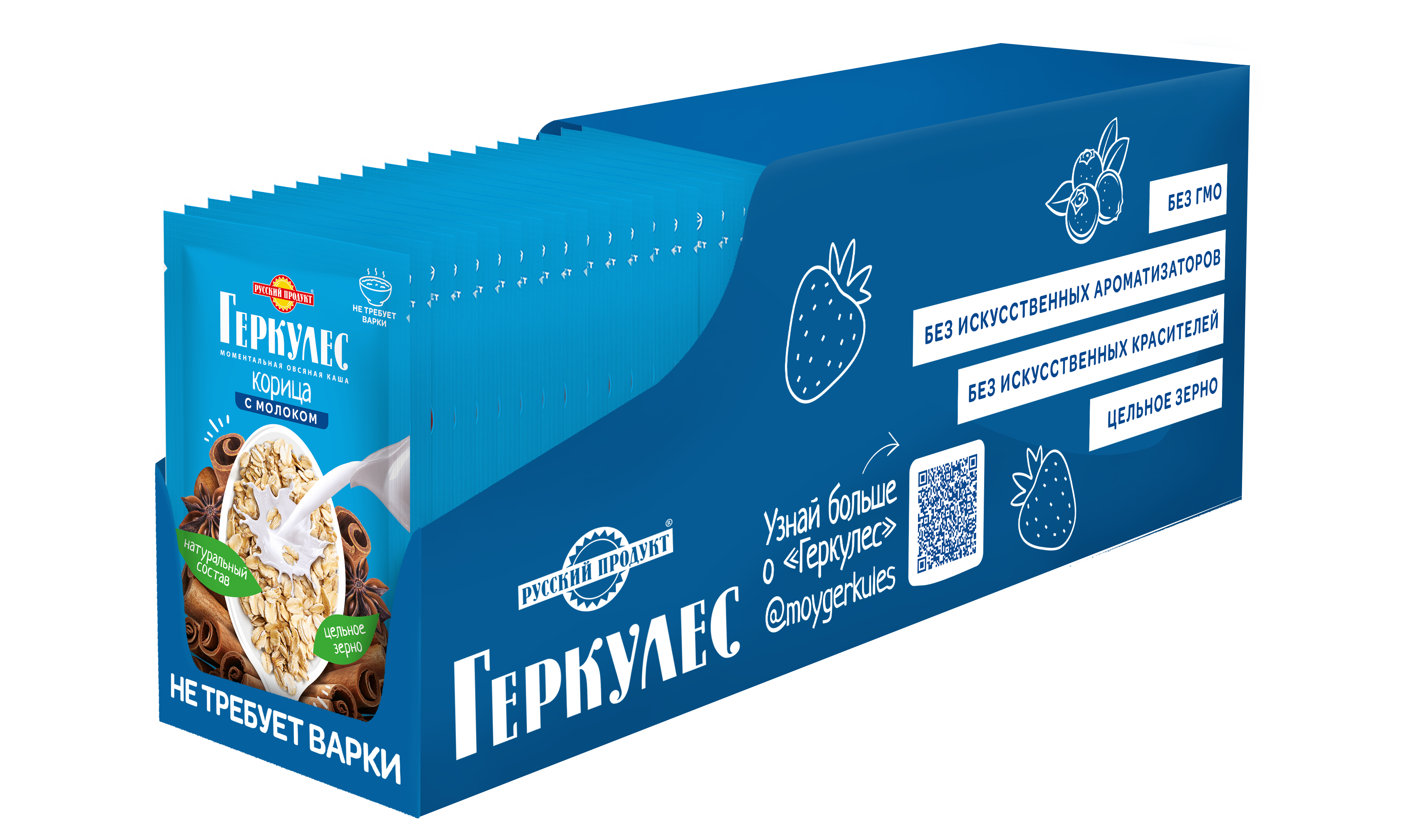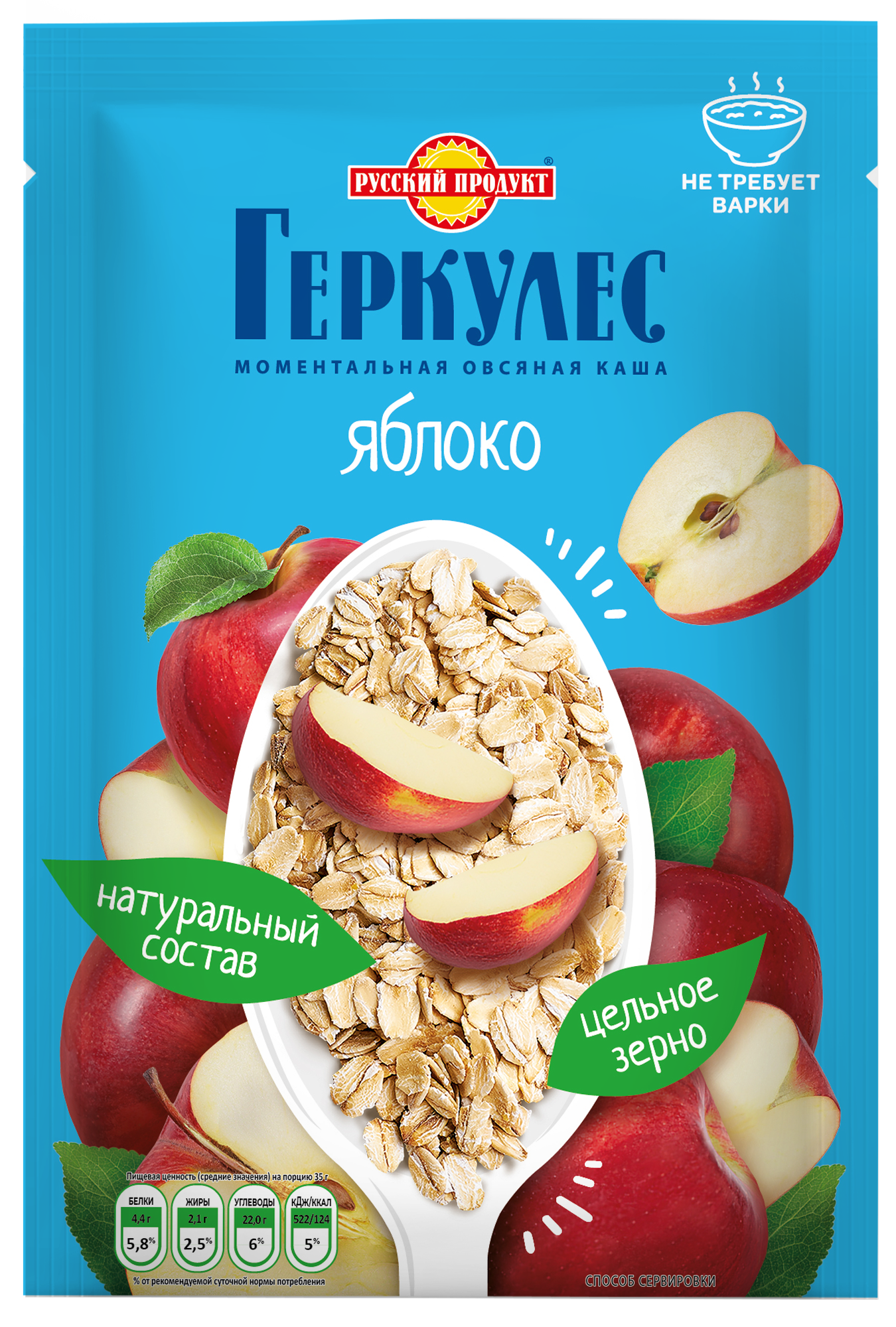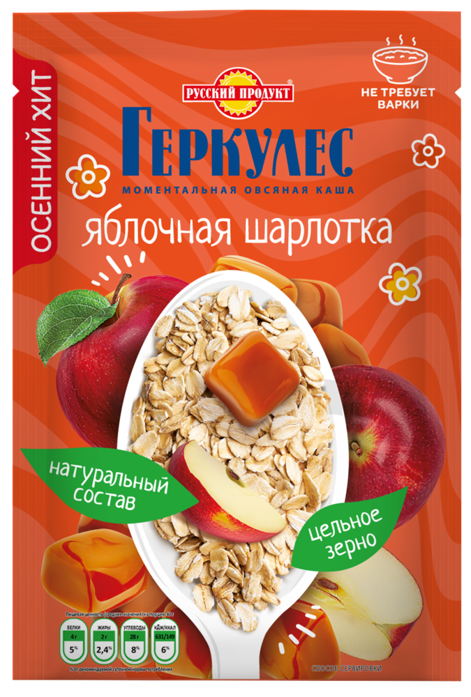 | Геркулес | Бакалея | Каши моментальные Геркулес | Овсяная каша момент Геркулес "Яблочная шарлотка" 40г/30 уп в... | 2700502 | пакет |  4680176172730 | 40 | 0,00019 | 100 | 13 | 145 | 09.10.2025 |  | 10 |  | 1. Содержимое пакета высыпать в ёмкость.
