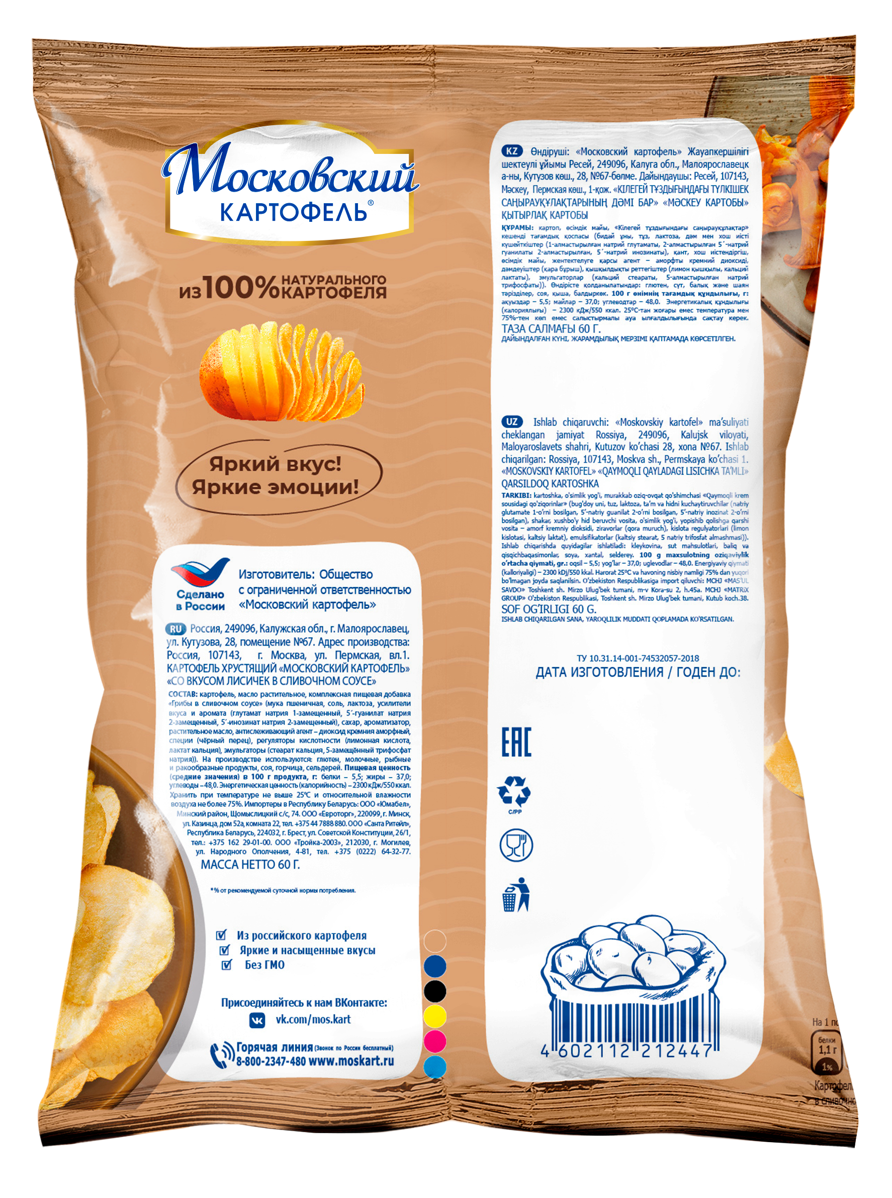 | Московский Картофель | Снеки | Московский картофель: Средняя фасовка | Картофель Московский хруст. cо вкусом лисичек в сливочном со... | 2601951 | Пакет-подушка |  4602112212447 | 60 | 0,00264 | 163 | 60 | 270 |  |  | 20 | Хрустящая золотистая картошка и ароматные грибы в сливочном ... | Готовый продукт.