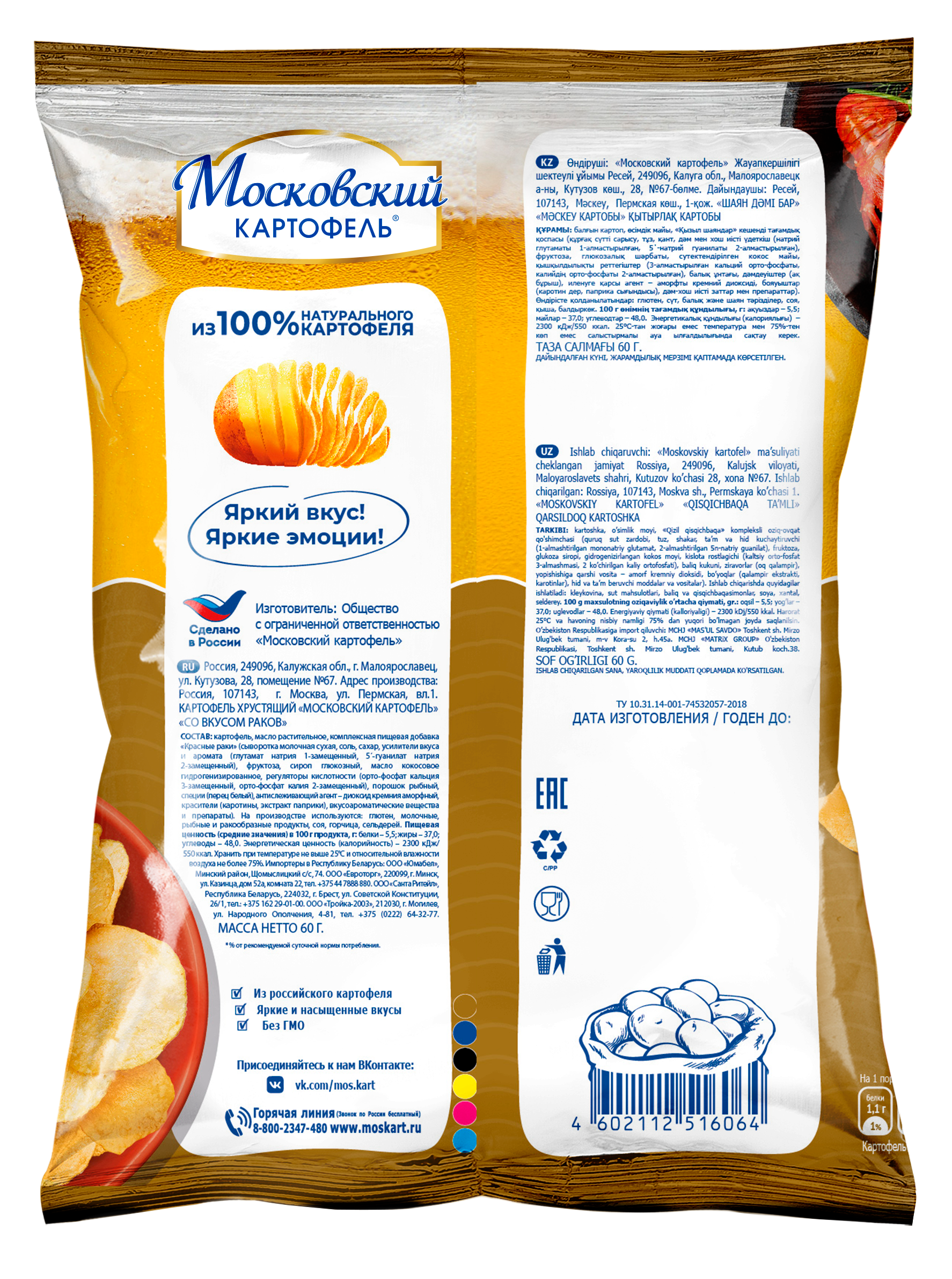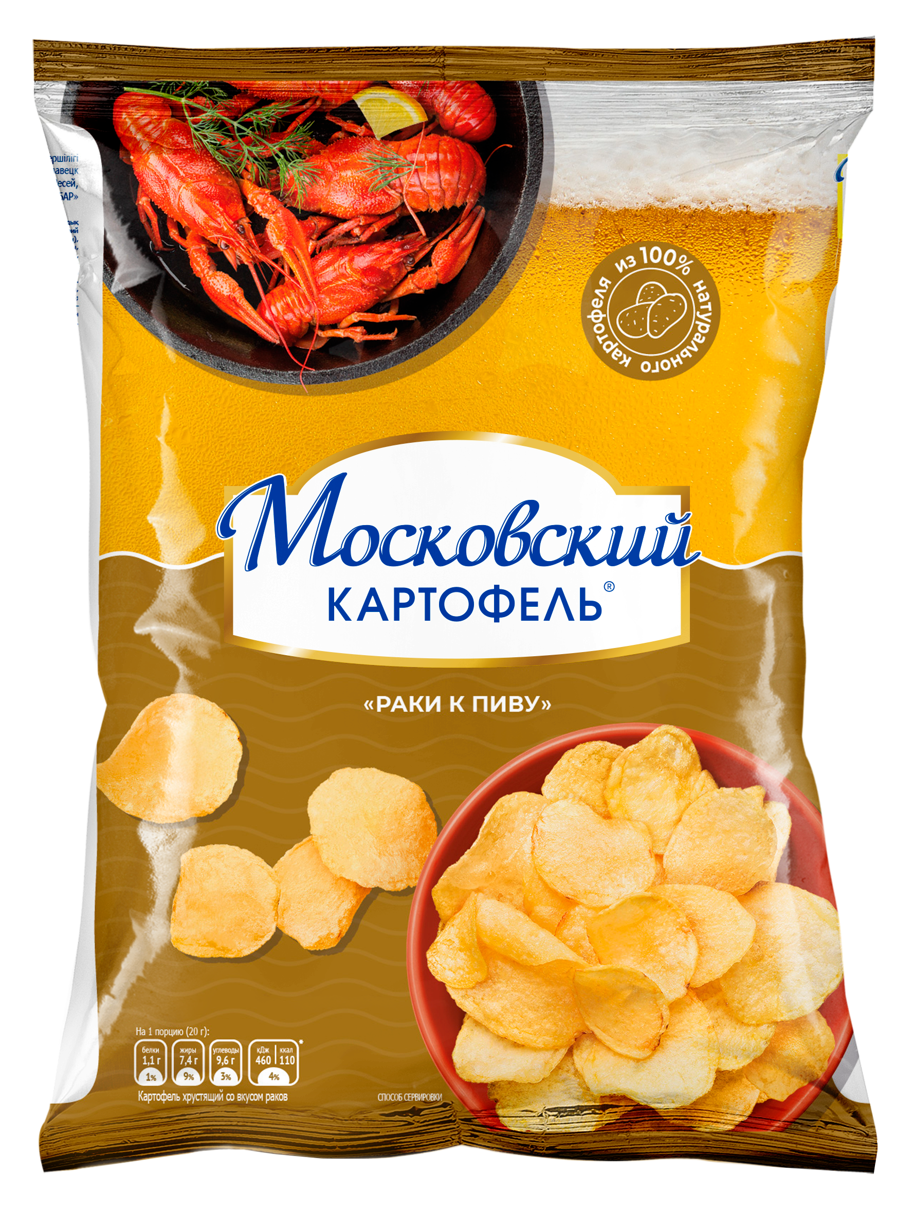 | Московский Картофель | Снеки | Московский картофель: Средняя фасовка | Картофель Московский хруст. cо вкусом раков к пиву 60г/12 уп... | 2601952 | Пакет-подушка |  4602112516064 | 60 | 0,00264 | 163 | 60 | 270 |  |  | 20 | Чипсы из натурального картофеля с насыщенным вкусом раков - ... | Готовый продукт.