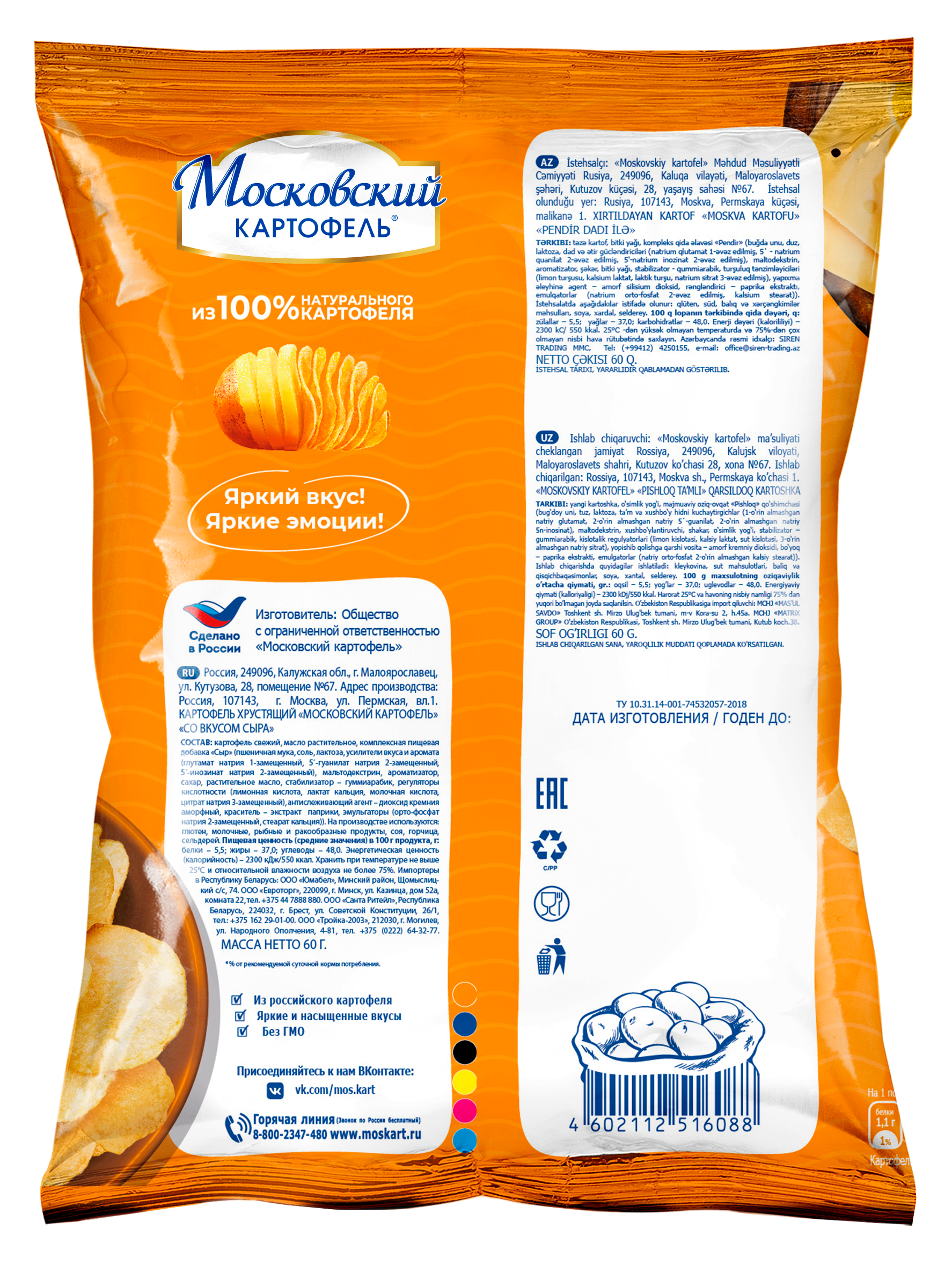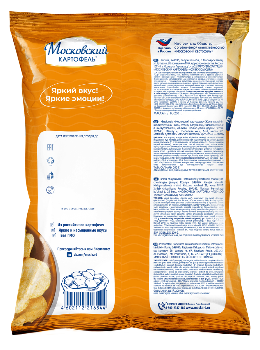 | Московский Картофель | Снеки | Московский картофель: Большая фасовка | Картофель хрустящий "Московский картофель" "Со вкусом азиатс... | 2602263 | Пакет-подушка |  4650406701856 | 110 | 0,00553 | 205 | 90 | 300 |  |  | 20 |  |  | картофель, масло растительное, комплексная пищевая добавка с... |  | 550.0 | 5.5 | 37 | 48 | 9 |  | Хранить при температуре не выше 25°С и относительной влажнос... | 16 | гофрокороб |  4650406701863 | 1,76 | 2 | 0,04955 | 585 | 385 | 220 | 1 паллета | 64 | 4 | 448 | 28 | 7 | 4 г/к х 7 слоев | 1690 | ООО Москарт | 107143, Россия, Москва г, ул. Пермская вл. 1 | ЕАЭС N RU Д-RU.РА06.В.67760/25 | 06.08.2025 - 03.08.2030 | соответствует требованиям ТУ 10.31.14-001-74532057-2018 | Скачать | 2005202000 | 10.31.14.000 |