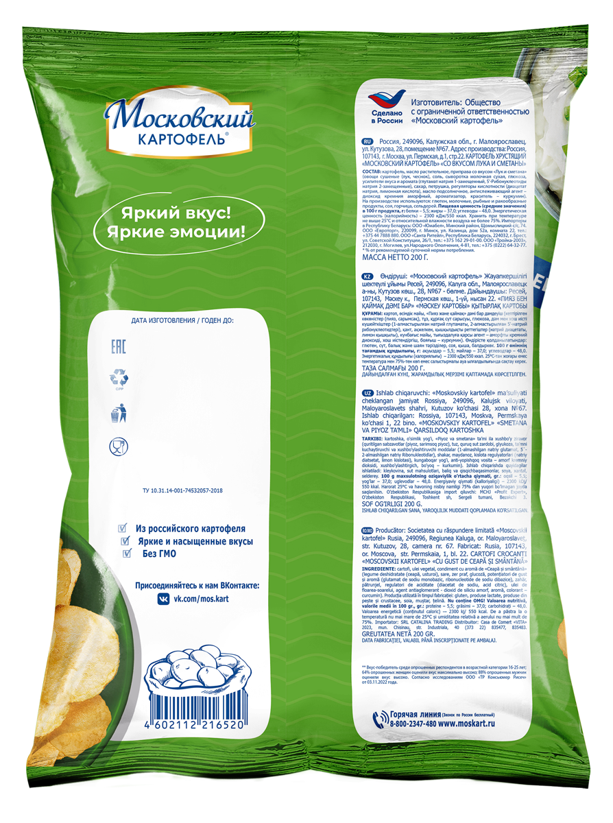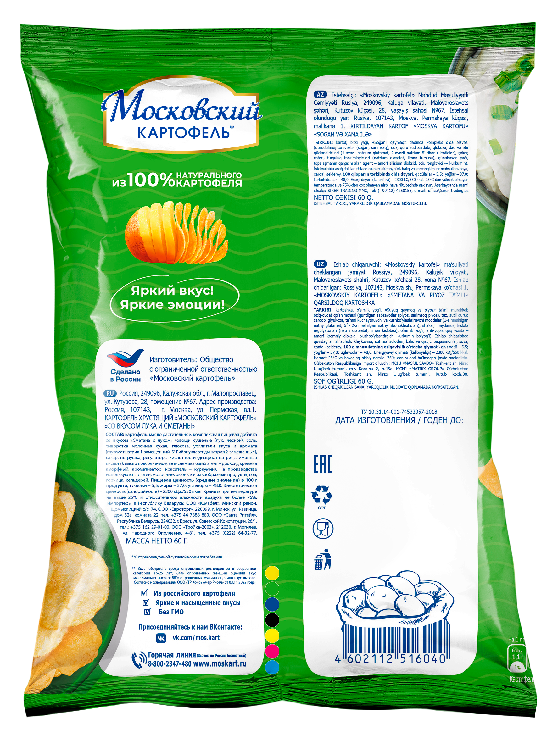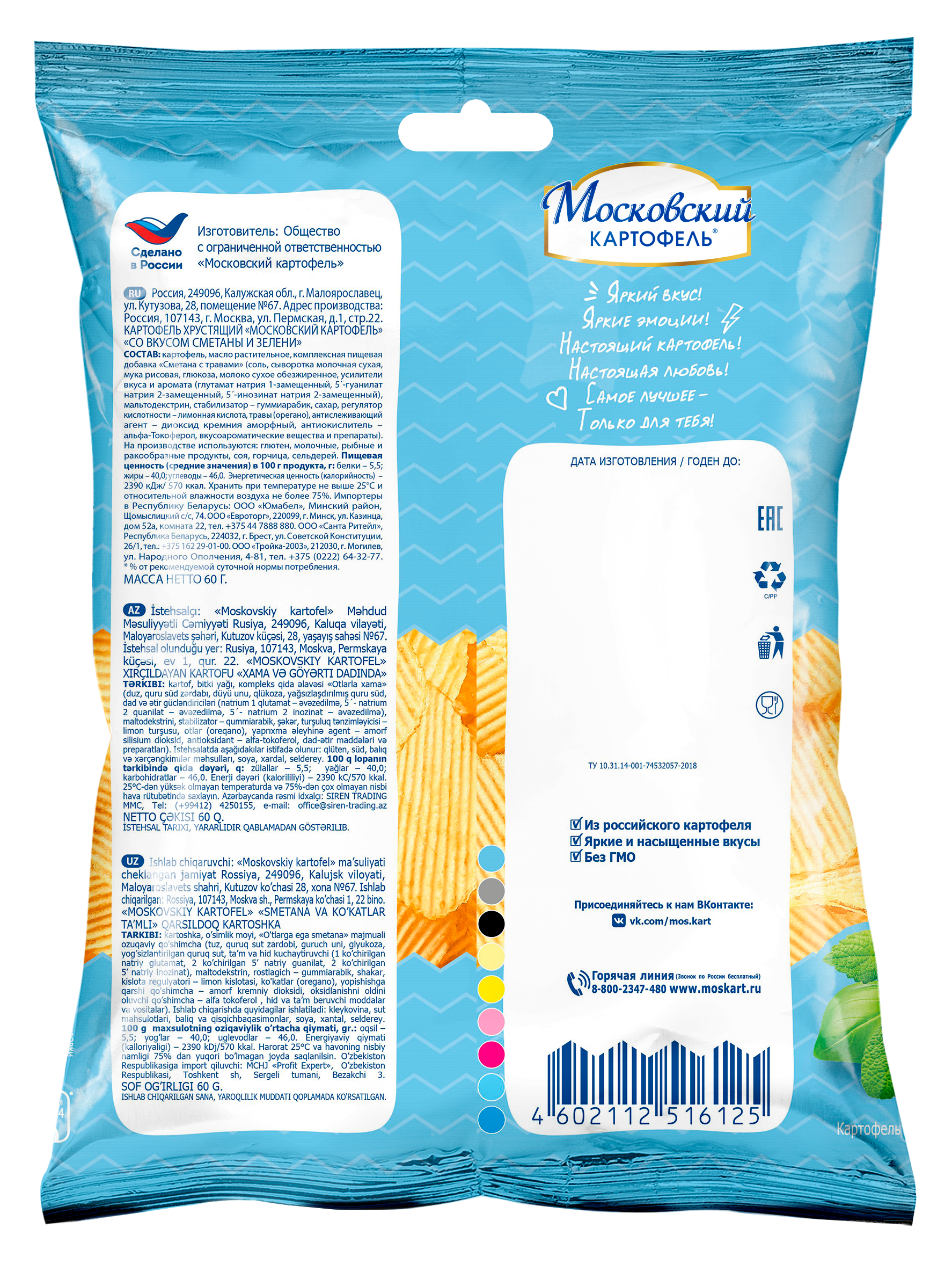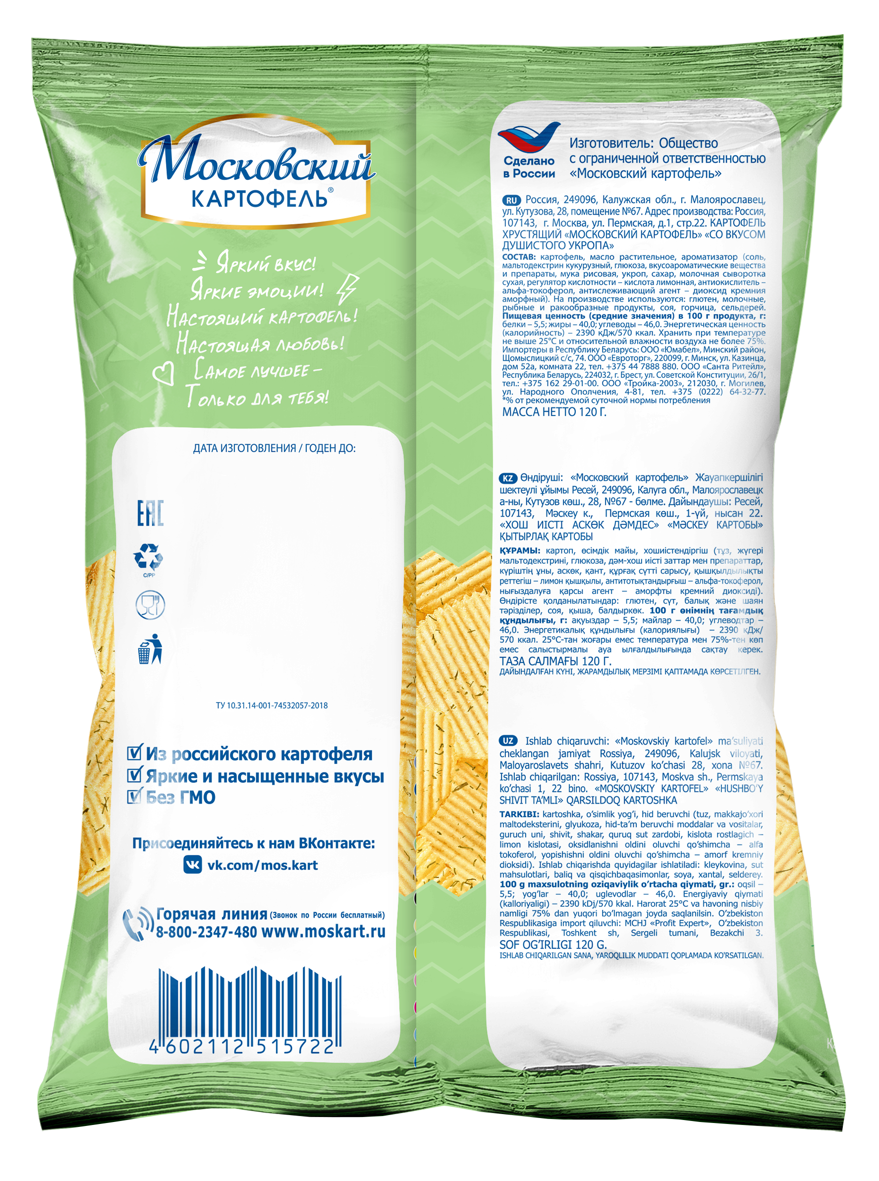 | Московский Картофель | Снеки | Московский картофель: Средняя фасовка. Рифленые | Картофель Московский хруст. рифл со вкусом лука и сметаны 60... | 2602188 | Пакет-подушка |  4650406701177 | 87,5 | 0,00461 | 205 | 90 | 250 | 21.07.2025 |  | 20 |  |  | картофель, масло растительное, приправа со вкусом "Лук и сме... |  | 570.0 | 5.5 | 40 | 46 | 7 |  | Хранить при температуре от +2°С до +25°С и относительной вла... | 16 | гофрокороб |  4650406701184 | 1,4 | 1,68 | 0,04167 | 585 | 385 | 185 | Паллета | 64 | 4 | 512 | 32 | 8 | 4 г/к х 8 слоев | 1630 | ООО Москарт | 107143, Россия, Москва г, ул. Пермская вл. 1 | ЕАЭС N RU Д-RU.РА05.В.56568/25 | 03.07.2025 - 22.01.2030 | соответствует требованиям ТУ 10.31.14-001-74532057-2018 | Скачать | 2005202000 | 10.31.14.000 |