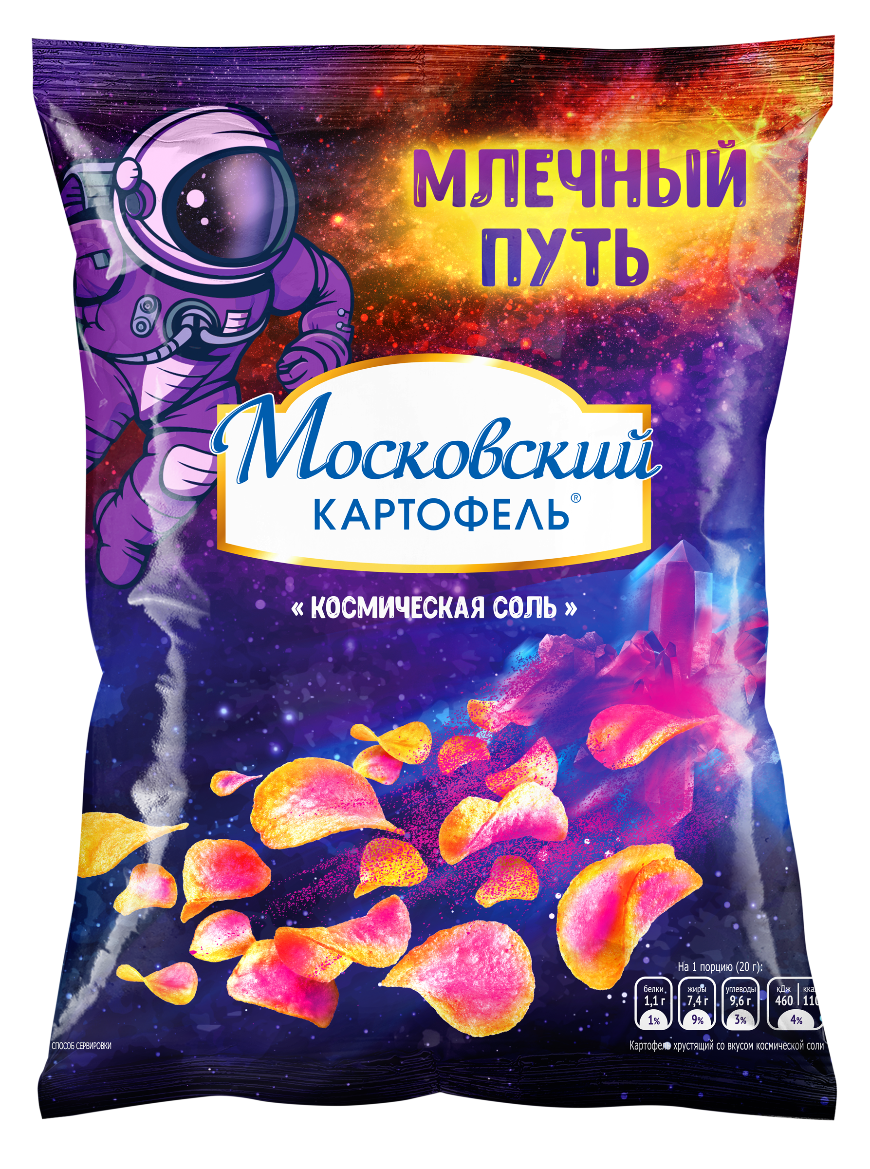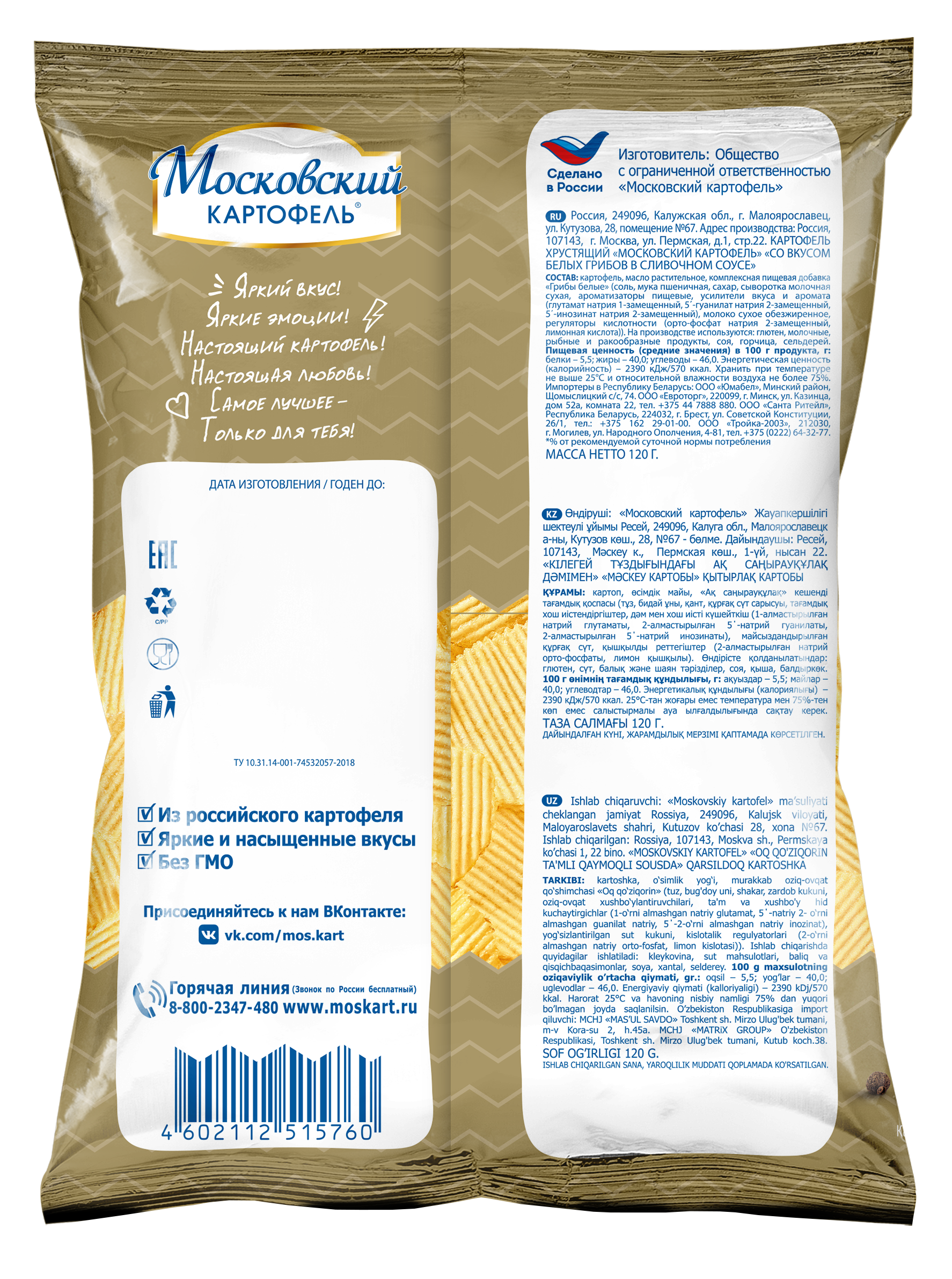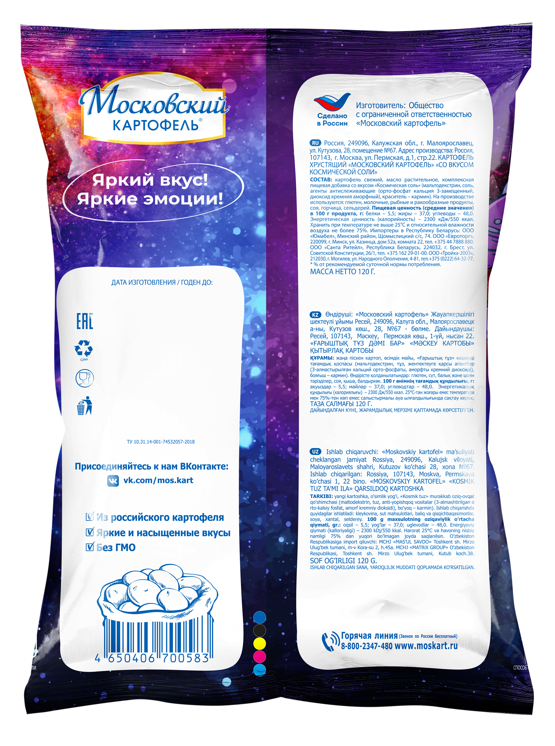 | Московский Картофель | Снеки | Московский картофель: Большая фасовка | Картофель Московский хруст. со вкусом космической соли 120г/... | 2602151 | Пакет-подушка |  4650406700583 | 120 | 0,00553 | 205 | 90 | 300 |  |  | 20 |  |  | Картофель свежий, масло растительное, комплексная пищевая до... | 3D Лицевая Оборотная | 550.0 | 5.5 | 37 | 48 | 9 |  | Хранить при температуре не выше 25°С и относительной влажнос... | 16 | гофрокороб |  4650406700590 | 1,92 | 2,2 | 0,04955 | 585 | 385 | 220 | 1 паллета | 64 | 4 | 448 | 28 | 7 | 4 г/к х 7 слоев | 1690 | ООО Москарт | 107143, Россия, Москва г, ул. Пермская вл. 1 | ЕАЭС N RU Д-RU.РА01.В.09098/25 | 13.01.2025 - 12.01.2030 | соответствует требованиям ТУ 10.31.14-001-74532057-2018 | Скачать | 2005202000 | 10.31.14.000 |