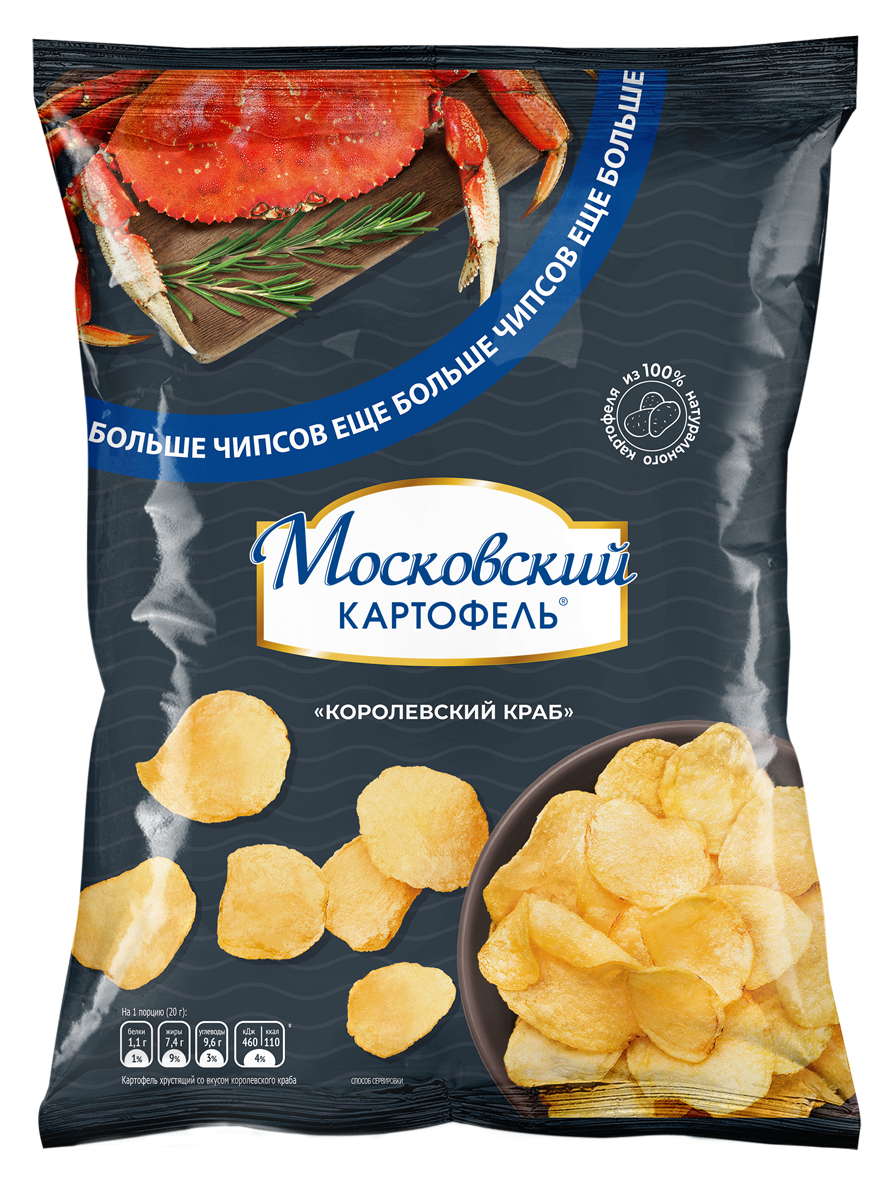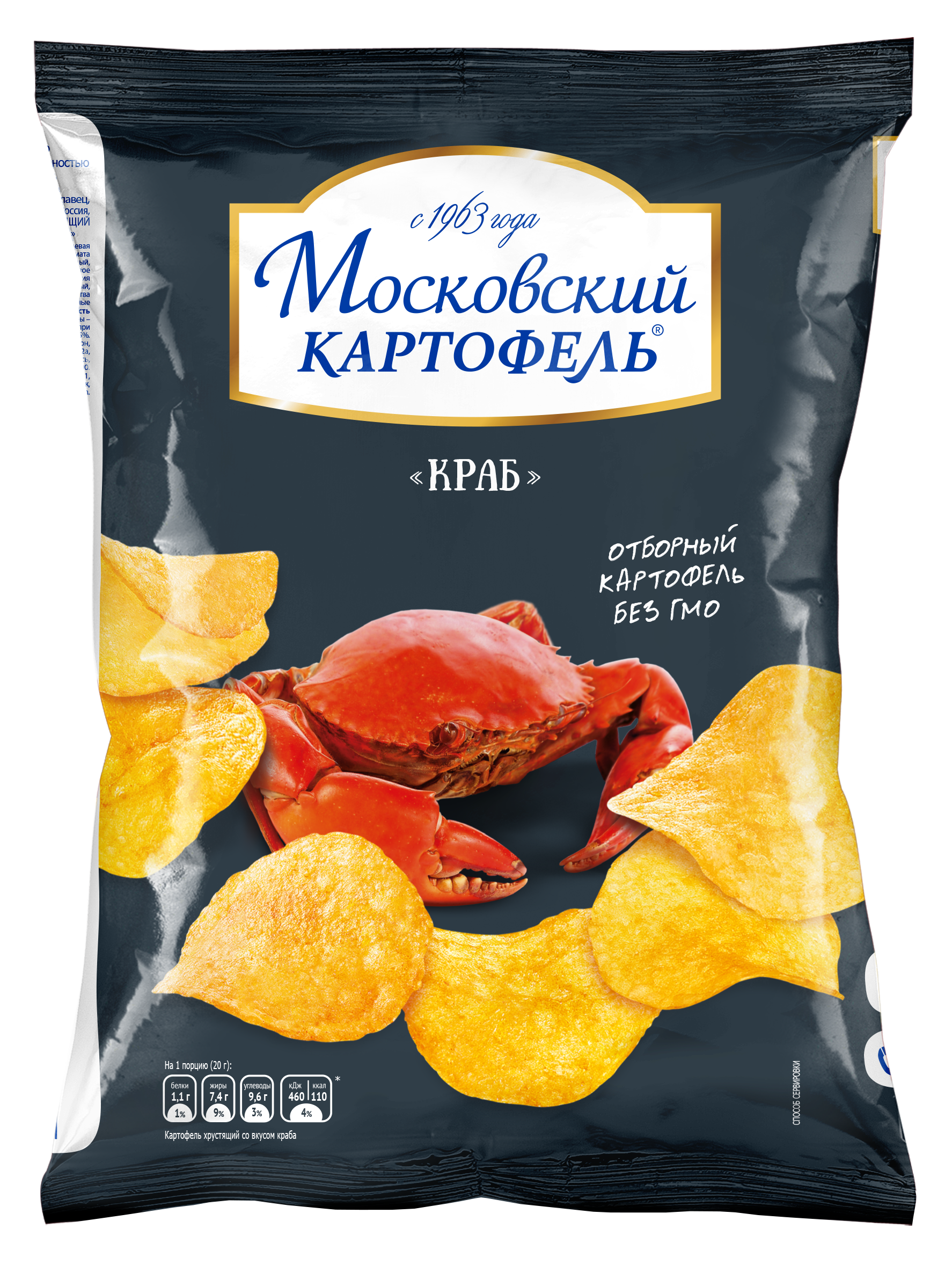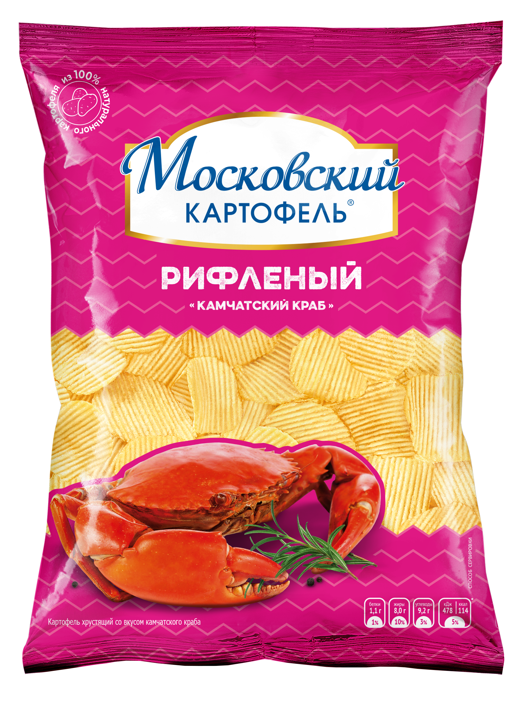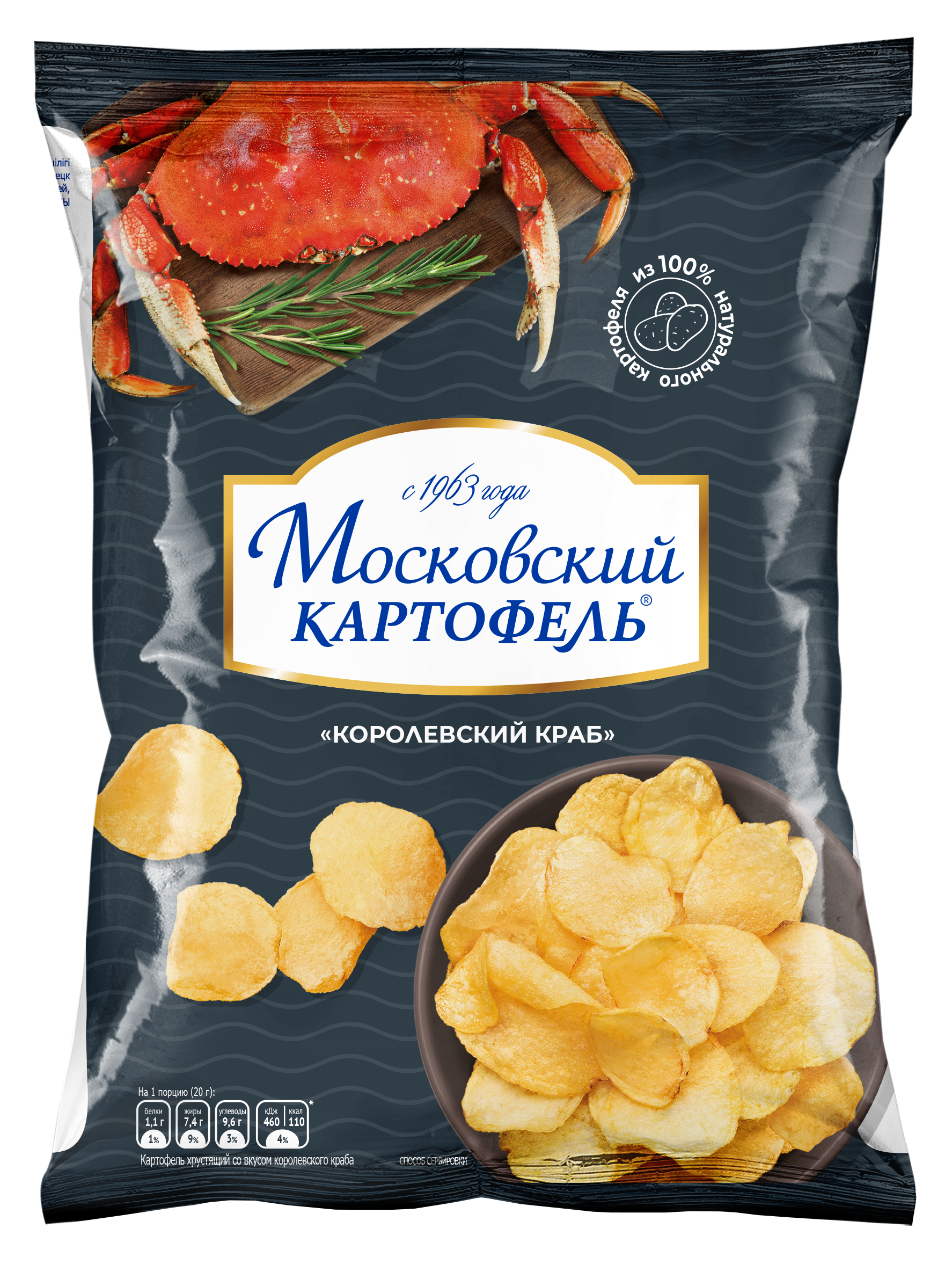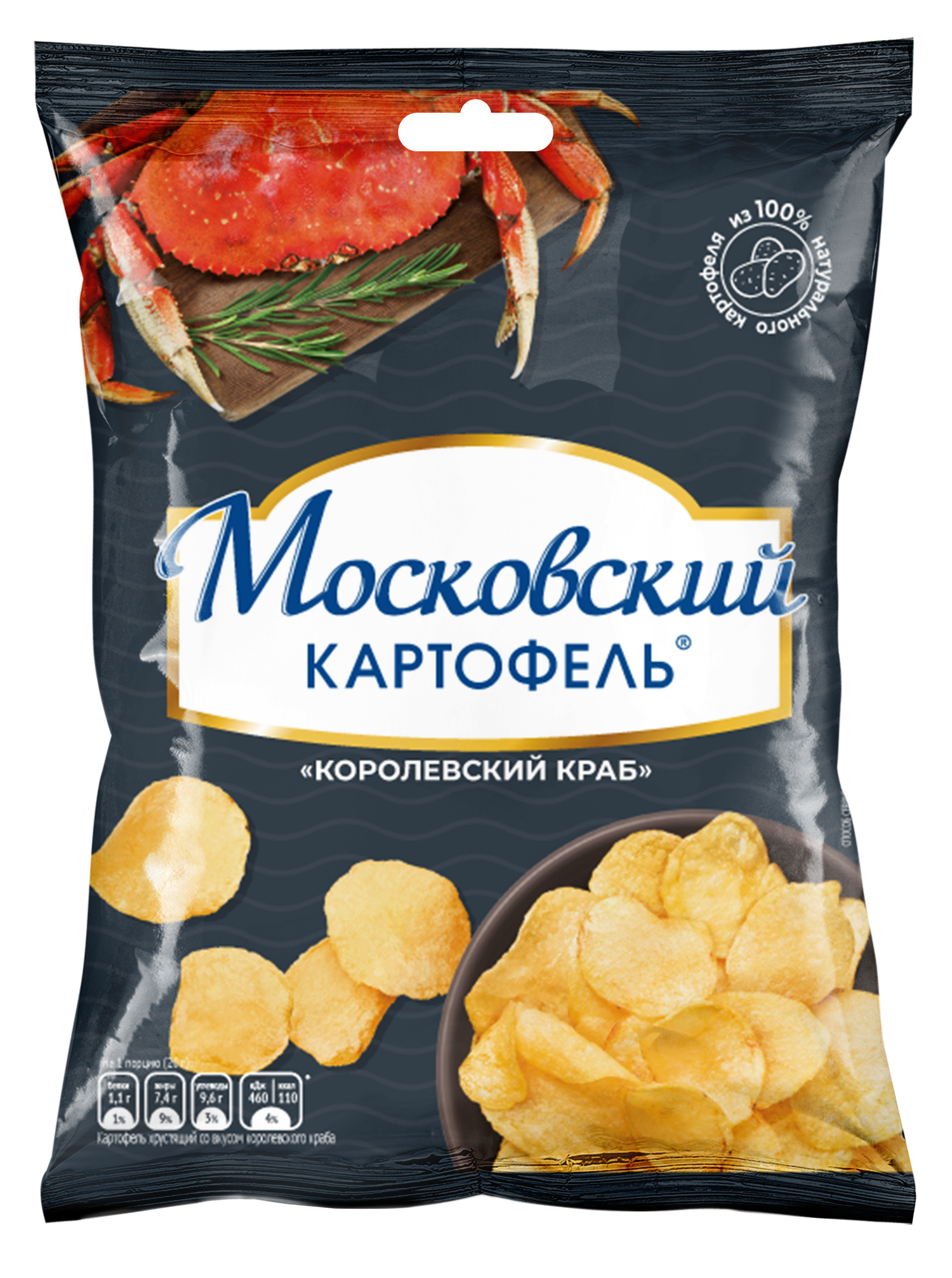 | Московский Картофель | Снеки | Московский картофель: Большая фасовка. Рифленые | Картофель Московский хруст. рифл со вкусом камчатского краба... | 2601971 | Пакет-подушка |  4602112515746 | 120 | 0,00553 | 205 | 90 | 300 |  |  | 20 | Классика морских деликатесов в королевском исполнении! Даже ... | Готовый продукт.  | картофель, масло растительное, комплексная пищевая добавка "... | 3D Лицевая Оборотная | 570.0 | 5.5 | 40 | 46 | 9 |  | Хранить при температуре не выше 25°С и относительной влажнос... | 16 | гофрокороб |  4602112515753 | 1,92 | 2,2 | 0,04955 | 585 | 385 | 220 | 1 паллета | 64 | 4 | 448 | 28 | 7 | 4 г/к х 7 слоев | 1690 | ООО Москарт | 107143, Россия, Москва г, ул. Пермская вл. 1 | ЕАЭС N RU Д-RU.РА04.В.23845/25 | 12.05.2025 - 01.12.2027 | соответствует требованиям ТУ 10.31.14-001-74532057-2018 | Скачать | 2005202000 | 10.31.14.000 |