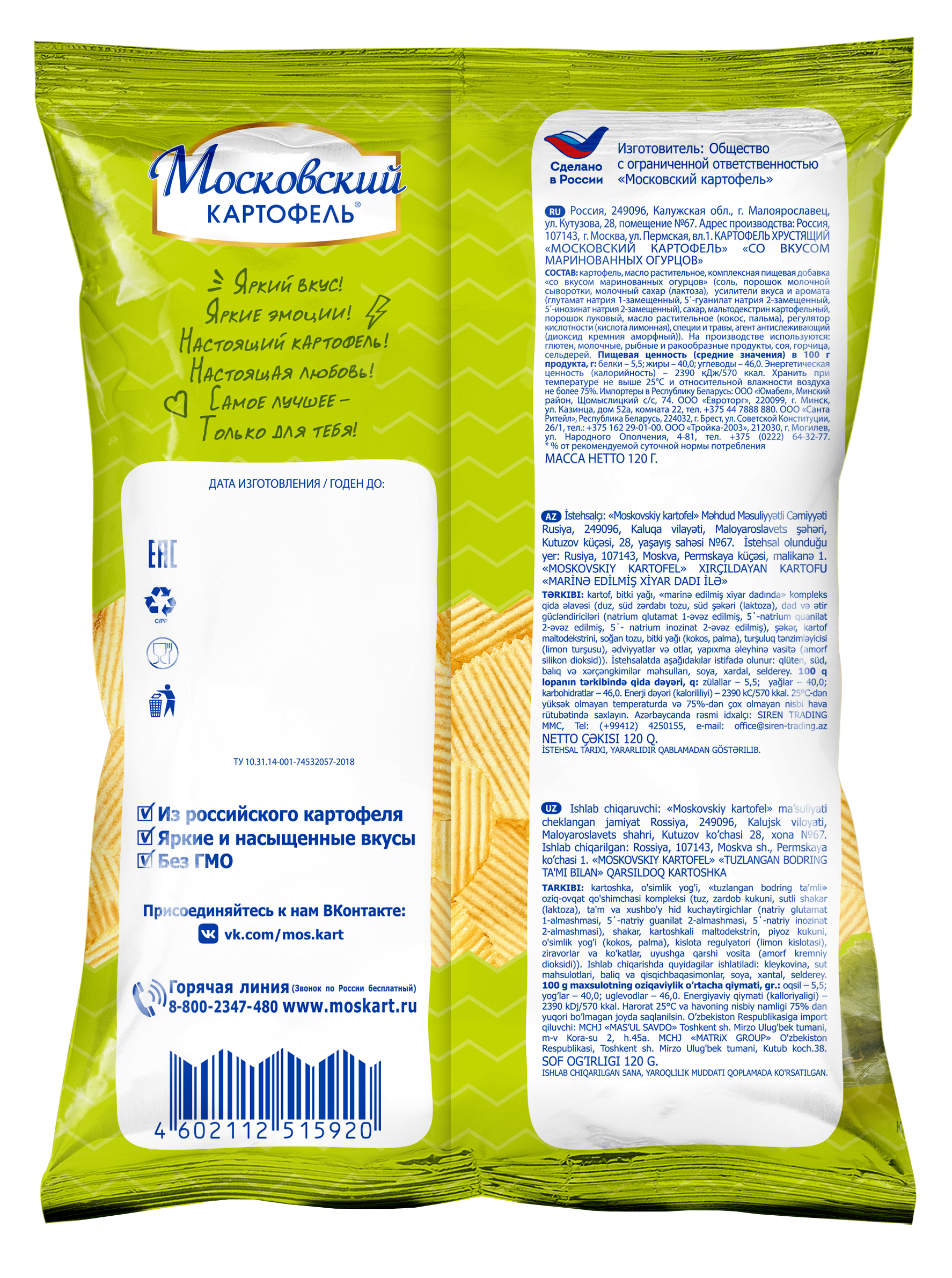 | Московский Картофель | Снеки | Московский картофель: Большая фасовка. Рифленые | Картофель Московский хруст. рифл со вкусом маринованных огур... | 2601972 | Пакет-подушка |  4602112515920 | 120 | 0,00553 | 205 | 90 | 300 |  |  | 20 | Осень - сезон ароматных солений. Побаловать себя исконно рус... | Готовый продукт.  | картофель, масло растительное, комплексная пищевая добавка "... | 3D Лицевая Оборотная | 570.0 | 5.5 | 40 | 46 | 9 |  | Хранить при температуре не выше 25°С и относительной влажнос... | 16 | гофрокороб |  4602112515937 | 1,92 | 2,2 | 0,04955 | 585 | 385 | 220 | 1 паллета | 64 | 4 | 448 | 28 | 7 | 4 г/к х 7 слоев | 1690 | ООО Москарт | 107143, Россия, Москва г, ул. Пермская вл. 1 | ЕАЭС N RU Д-RU.РА04.В.23845/25 | 12.05.2025 - 01.12.2027 | соответствует требованиям ТУ 10.31.14-001-74532057-2018 | Скачать | 2005202000 | 10.31.14.000 |
