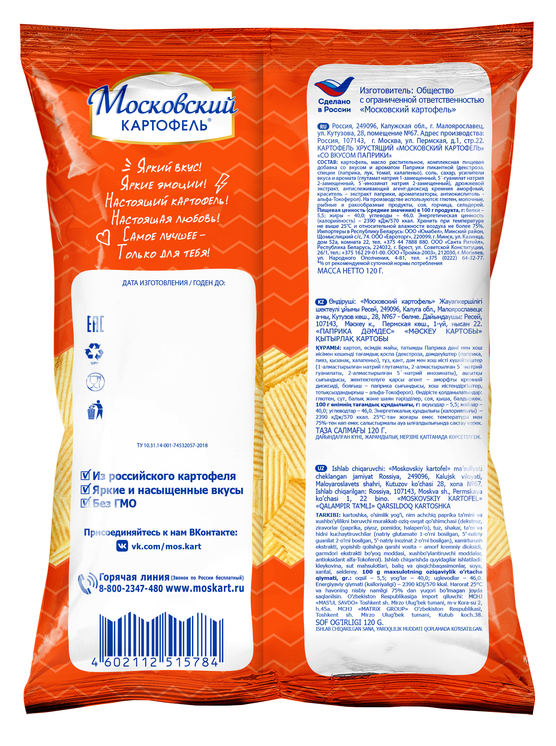 | Московский Картофель | Снеки | Московский картофель: Большая фасовка. Рифленые | Картофель Московский хруст. рифл со вкусом паприки 120г/16 у... | 2601973 | Пакет-подушка |  4602112515784 | 120 | 0,00553 | 205 | 90 | 300 |  |  | 20 | Пикантная классика в рифленом формате - для самых ярких эмоц... | Готовый продукт. | картофель, масло растительное, комплексная пищевая добавка с... | 3D Лицевая Оборотная | 570.0 | 5.5 | 40 | 46 | 9 |  | Хранить при температуре не выше 25°С и относительной влажнос... | 16 | гофрокороб |  4602112515791 | 1,92 | 2,2 | 0,04955 | 585 | 385 | 220 | 1 паллета | 64 | 4 | 448 | 28 | 7 | 4 г/к х 7 слоев | 1690 | ООО Москарт | 107143, Россия, Москва г, ул. Пермская вл. 1 | ЕАЭС N RU Д-RU.РА04.В.23845/25 | 12.05.2025 - 01.12.2027 | соответствует требованиям ТУ 10.31.14-001-74532057-2018 | Скачать | 2005202000 | 10.31.14.000 |
