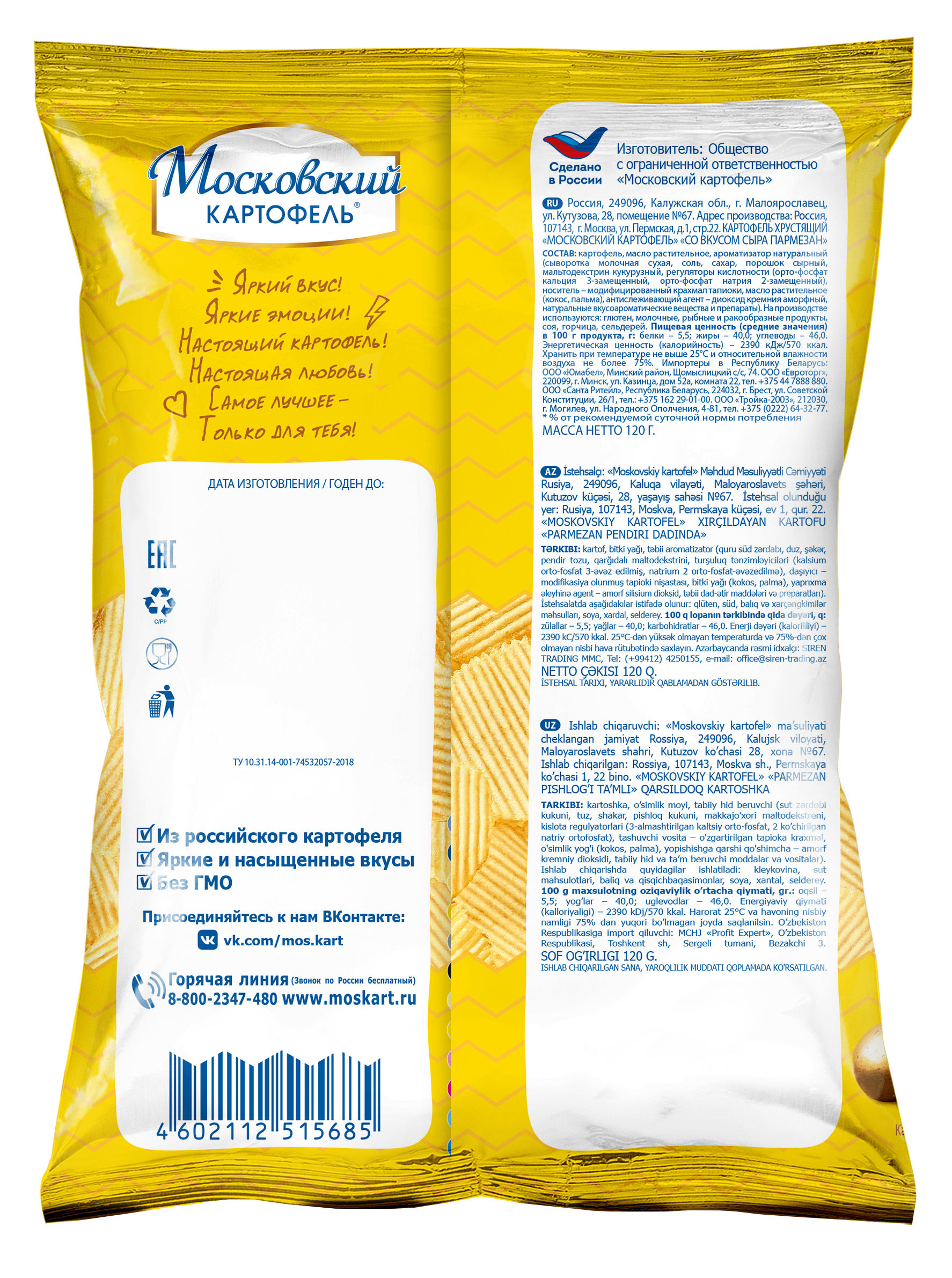 | Московский Картофель | Снеки | Московский картофель: Большая фасовка. Рифленые | Картофель Московский хруст. рифл со вкусом сыра пармезан 120... | 2601978 | Пакет-подушка |  4602112515685 | 120 | 0,00553 | 205 | 90 | 300 |  |  | 20 | Настоящее искушение: яркий глубокий вкус сыра Пармезан в соч... | Готовый продукт.  | картофель, масло растительное, ароматизатор натуральный: (сы... | 3D Лицевая Оборотная | 570.0 | 5.5 | 40 | 46 | 9 |  | Хранить при температуре не выше 25°С и относительной влажнос... | 16 | гофрокороб |  4602112515692 | 1,92 | 2,2 | 0,04955 | 585 | 385 | 220 | 1 паллета | 64 | 4 | 448 | 28 | 7 | 4 г/к х 7 слоев | 1690 | ООО Москарт | 107143, Россия, Москва г, ул. Пермская вл. 1 | ЕАЭС N RU Д-RU.РА04.В.23845/25 | 12.05.2025 - 01.12.2027 | соответствует требованиям ТУ 10.31.14-001-74532057-2018 | Скачать | 2005202000 | 10.31.14.000 |