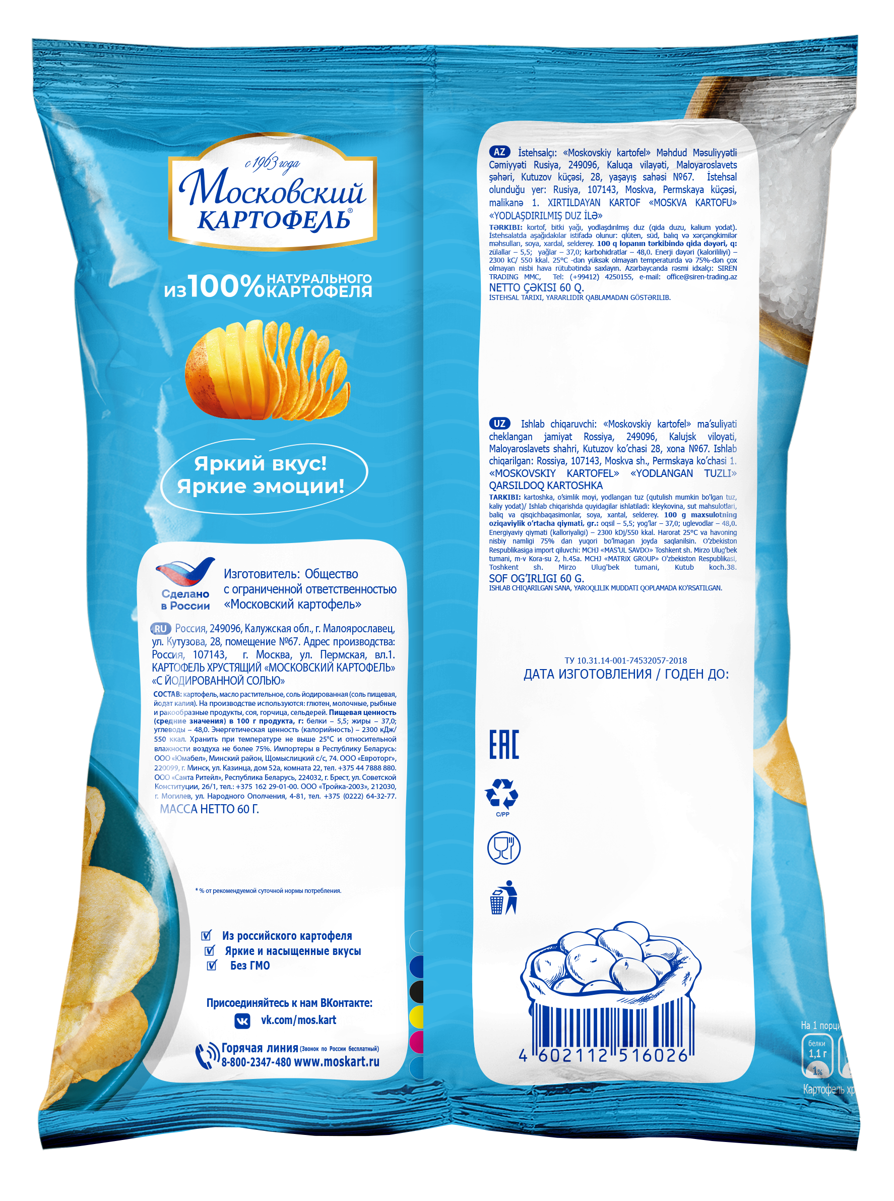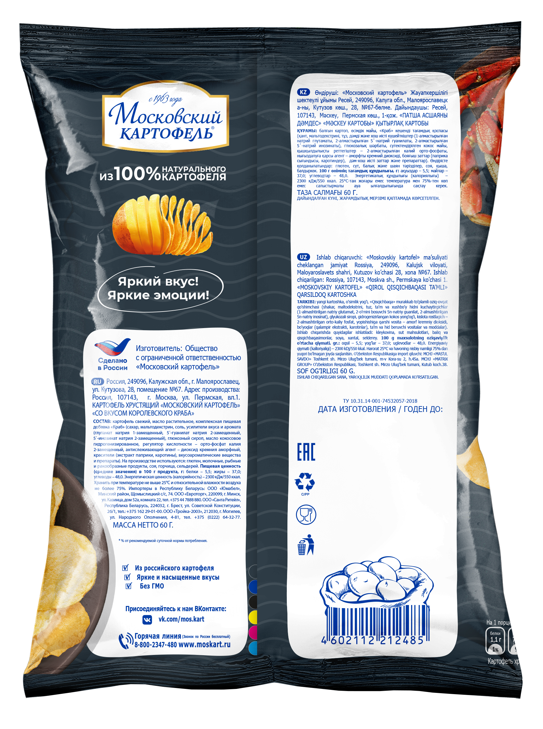 | Московский Картофель | Снеки | Московский картофель: Средняя фасовка | Картофель Московский хруст. со вкусом королевского краба 60 ... | 2601988 | Пакет-подушка |  4602112212485 | 60 | 0,00264 | 163 | 60 | 270 |  |  | 20 | Отличное сочетание вкуса краба и натуральной хрустящей карто... | Готовый продукт. | картофель, масло растительное, комплексная пищевая добавка "... | 3D Лицевая Оборотная Групповая уп | 550.0 | 5.5 | 37 | 48 | 9 |  | Хранить при температуре не выше 25°С и относительной влажнос... | 12 | гофрокороб |  4602112213215 | 0,72 | 0,98 | 0,02328 | 295 | 385 | 205 | 1 паллета | 96 | 8 | 768 | 64 | 8 | 8 г/к х 8 слоев | 1790 | ООО Москарт | 107143, Россия, Москва г, ул. Пермская вл. 1 | ЕАЭС N RU Д-RU.РА04.В.23845/25 | 12.05.2025 - 01.12.2027 | соответствует требованиям ТУ 10.31.14-001-74532057-2018 | Скачать | 2005202000 | 10.31.14.000 |
