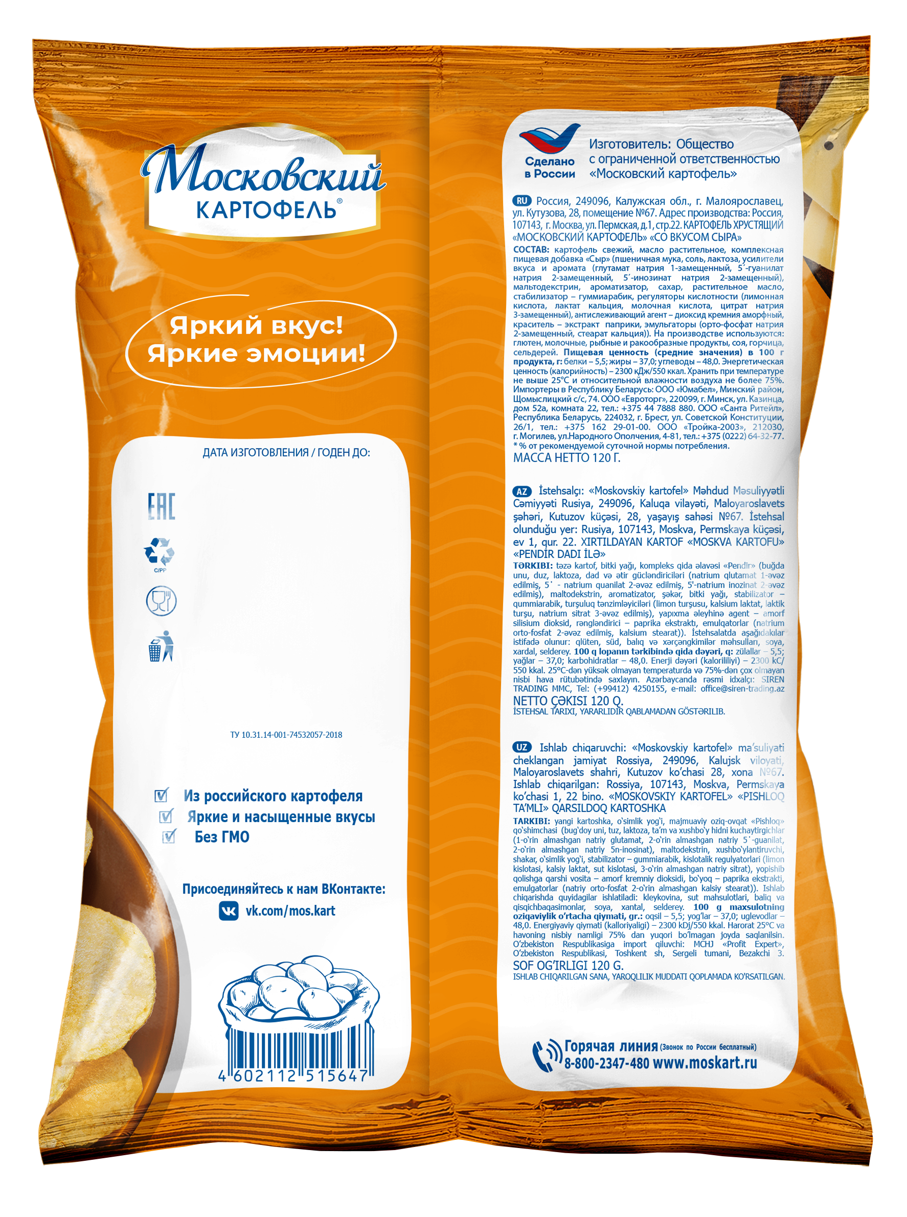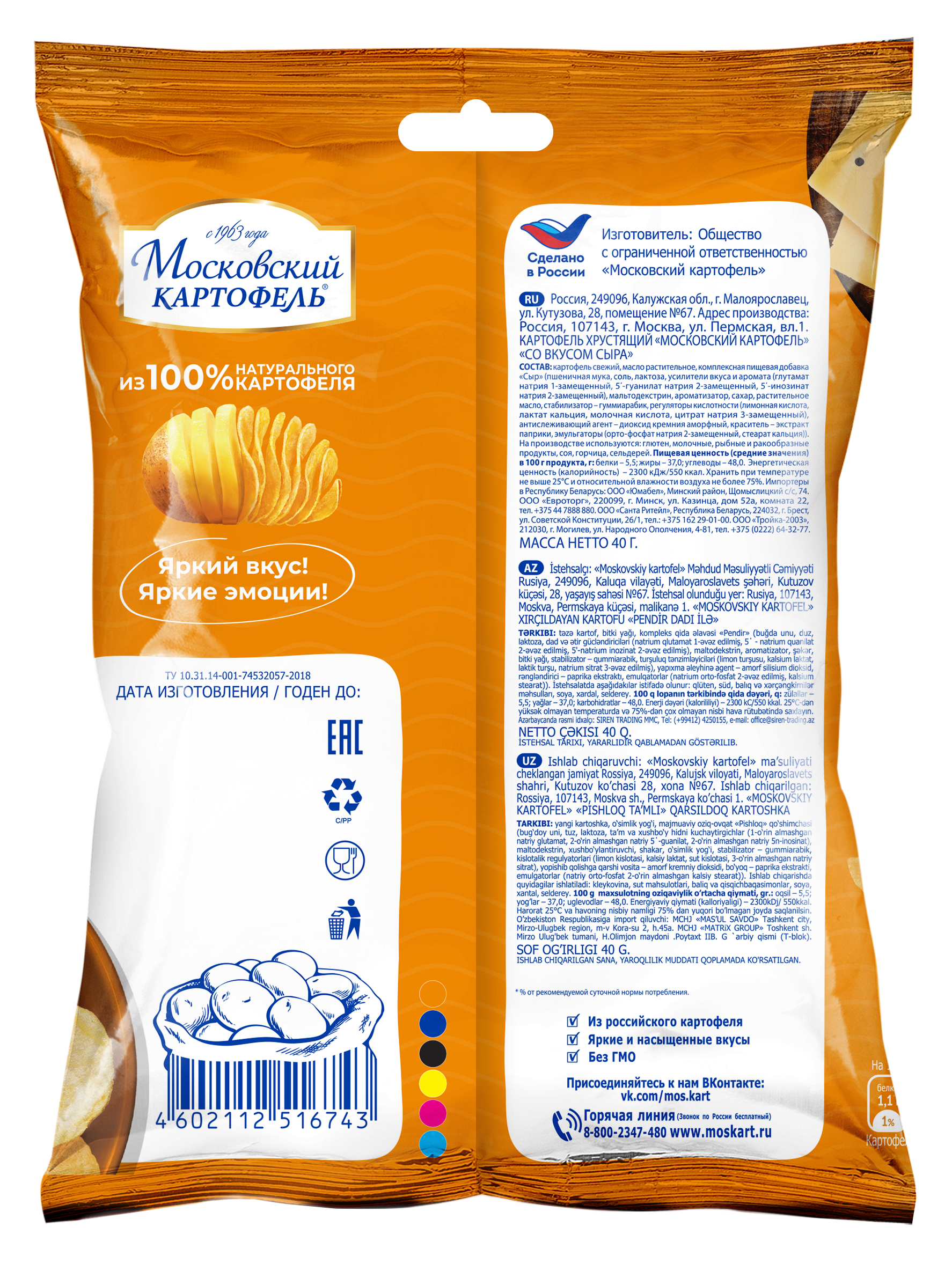 | Московский Картофель | Снеки | Московский картофель: Мелкая фасовка | Картофель Московский хруст. со вкусом сыра 40г/28 уп в кор (... | 2601921 | Пакет-подушка |  4602112516743 | 40 | 0,00215 | 163 | 55 | 240 |  |  | 20 | Хрустящий картофель с насыщенным вкусом сыра - классика, ник... | Готовый продукт | картофель свежий, масло растительное, комплексная пищевая до... | 3D Лицевая Оборотная | 550.0 | 5.5 | 37 | 48 | 9 |  | Хранить при температуре не выше 25°С и относительной влажнос... | 28 | гофрокороб |  4602112516750 | 1,12 | 1,55 | 0,04054 | 585 | 385 | 180 | 1 паллета | 112 | 4 | 1008 | 36 | 9 | 4 г/к х 9 слоев | 1770 | ООО Москарт | 107143, Россия, Москва г, ул. Пермская вл. 1 | ЕАЭС N RU Д-RU.РА04.В.23845/25 | 12.05.2025 - 01.12.2027 | соответствует требованиям ТУ 10.31.14-001-74532057-2018 | Скачать | 2005202000 | 10.31.14.000 |